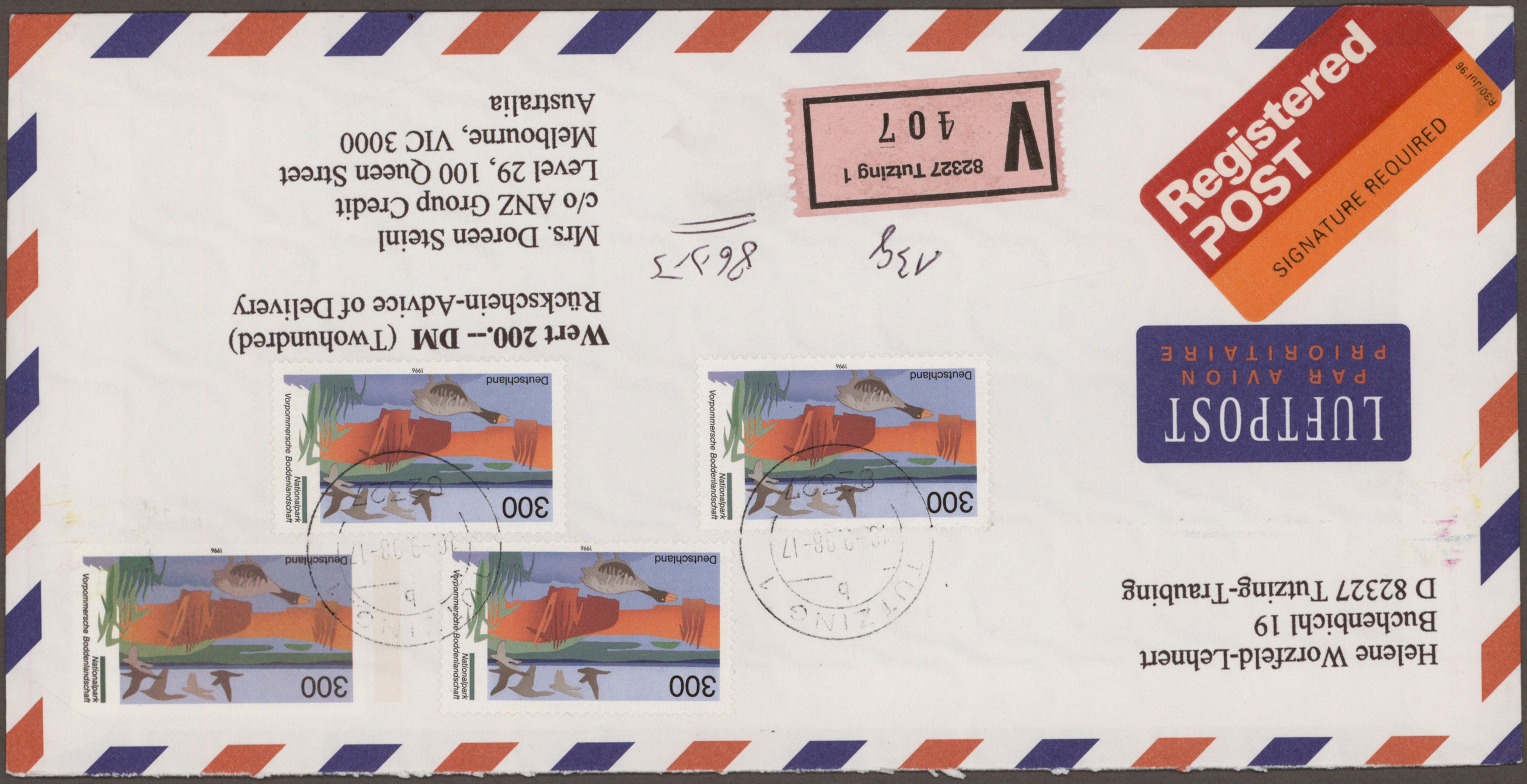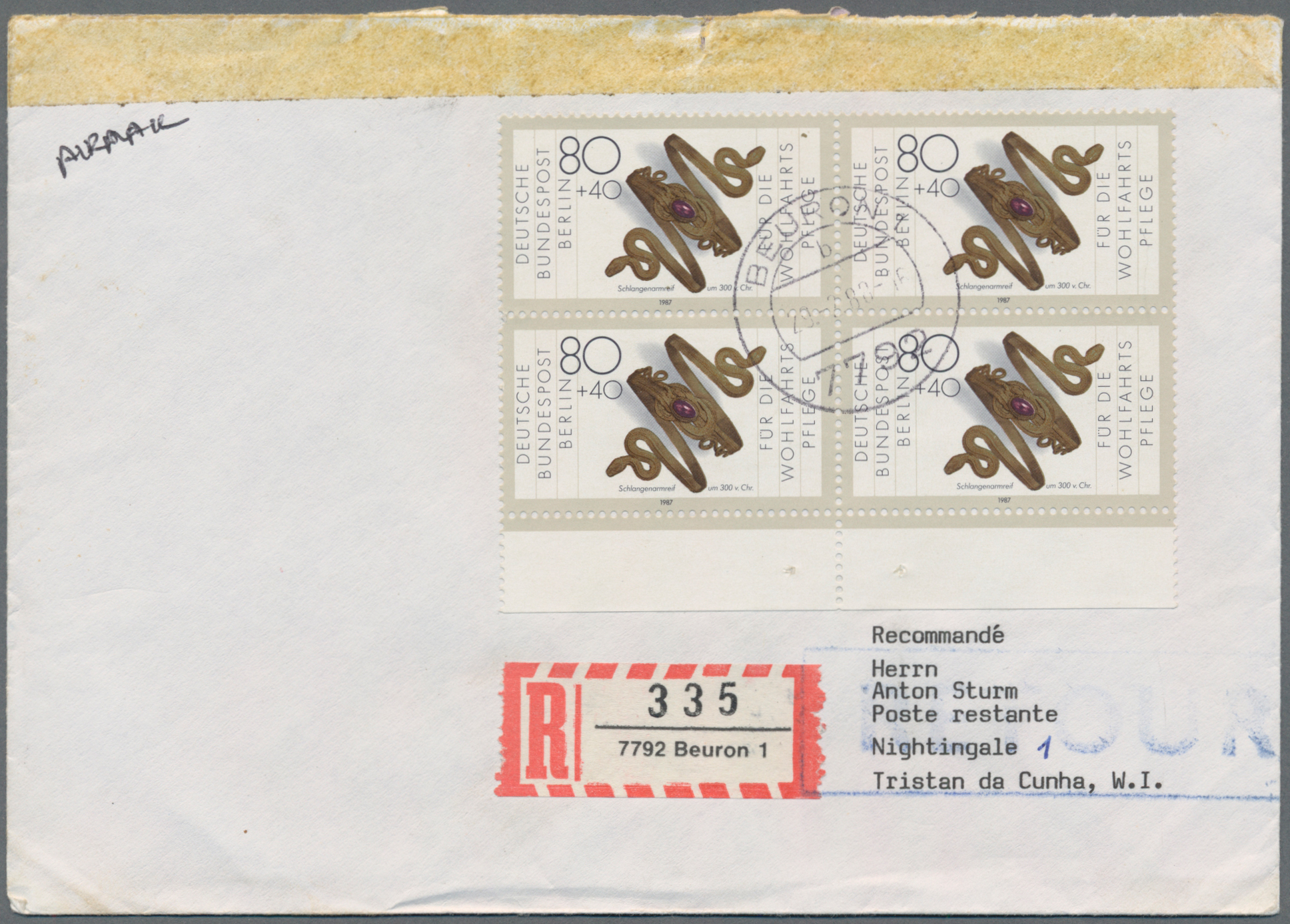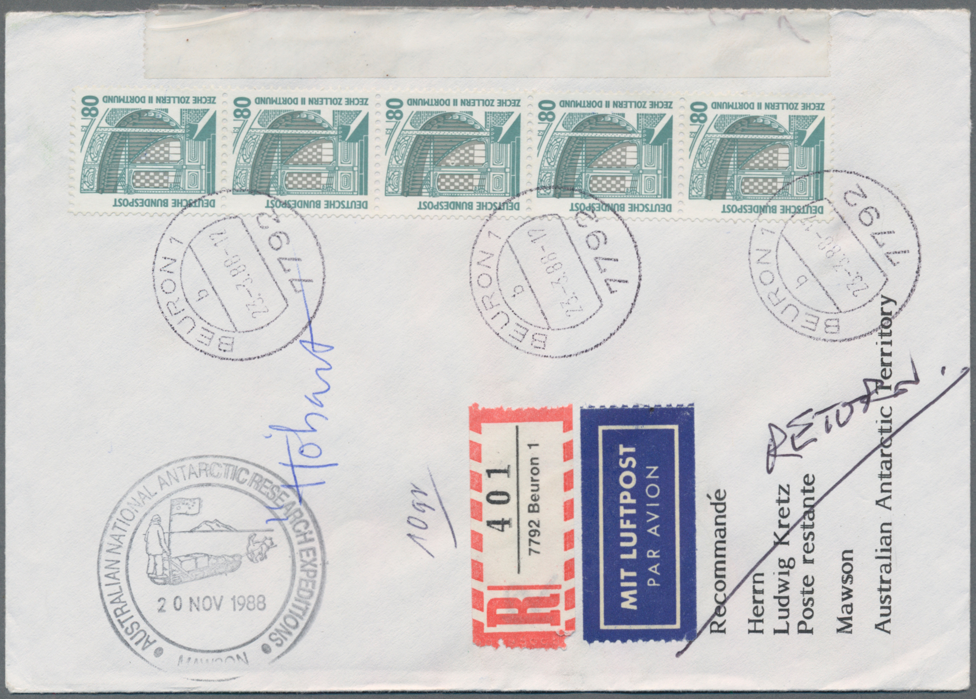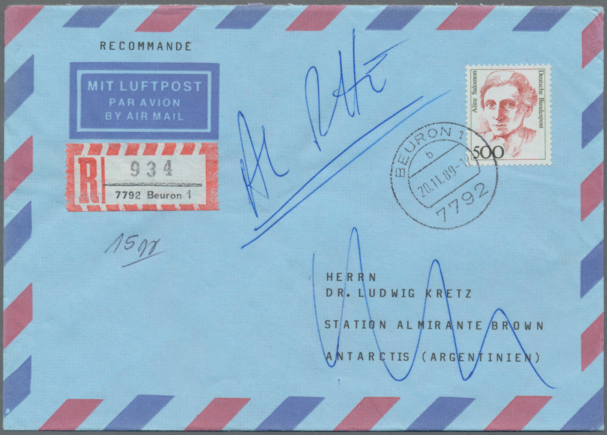 1987/1989, Post in die Antarktis/Falkland/Tristan da Chuna, Partie von 20 R-Briefen, bis auf einen alle per Luftpost, teils Rückschein, dabei interessante Mehrfachfrankaturen, alle retour mit entsprechenden Behandlungsvermerken.