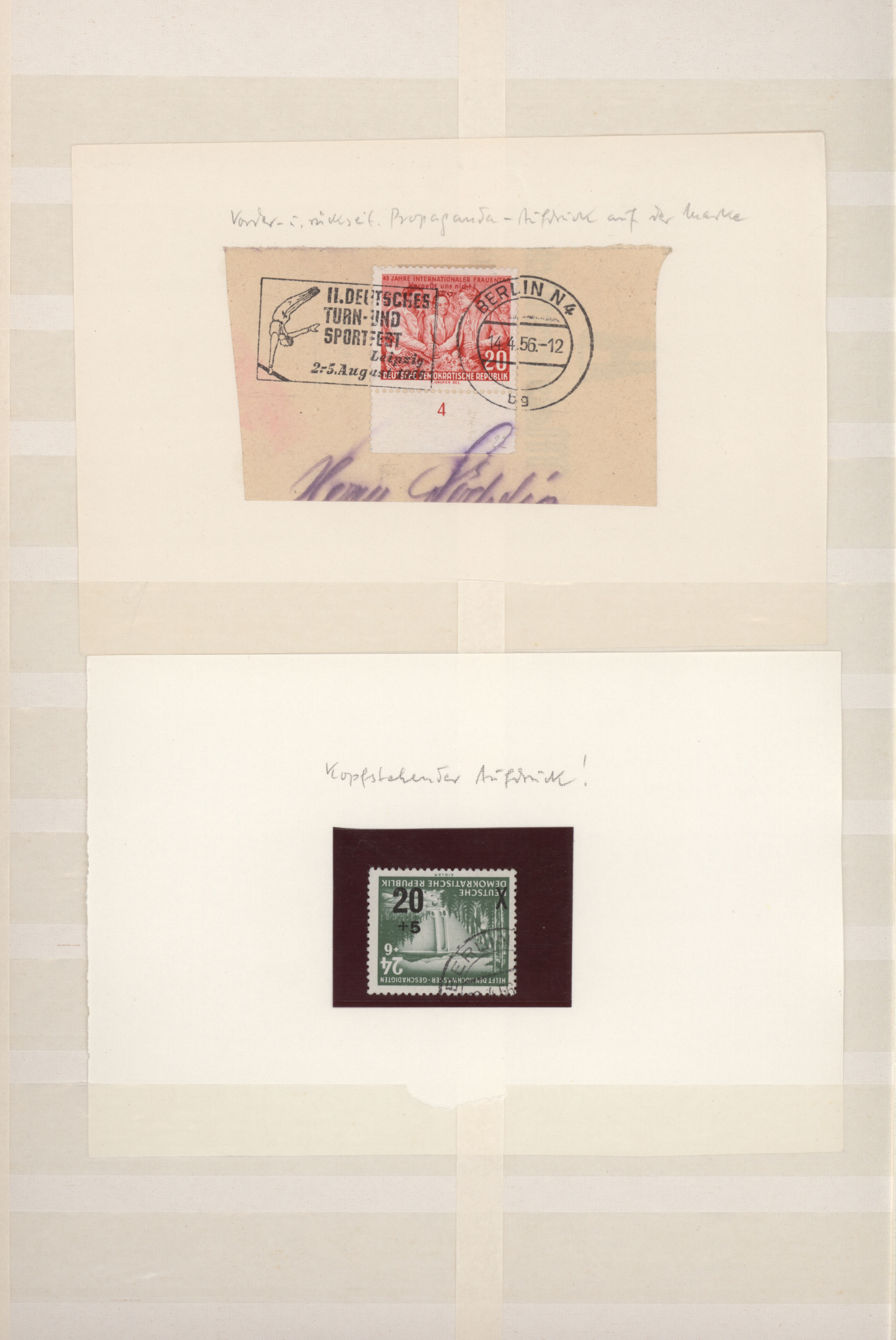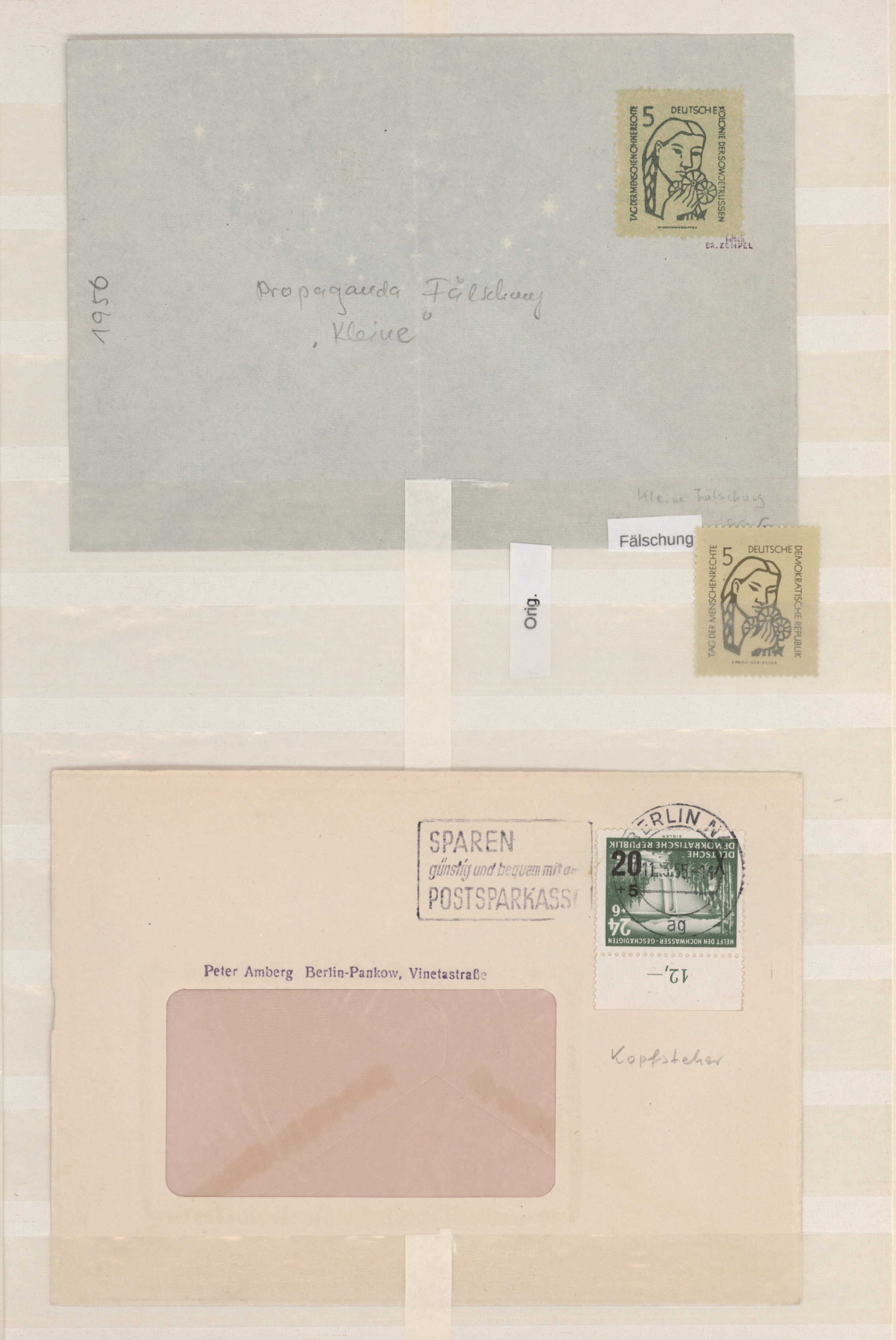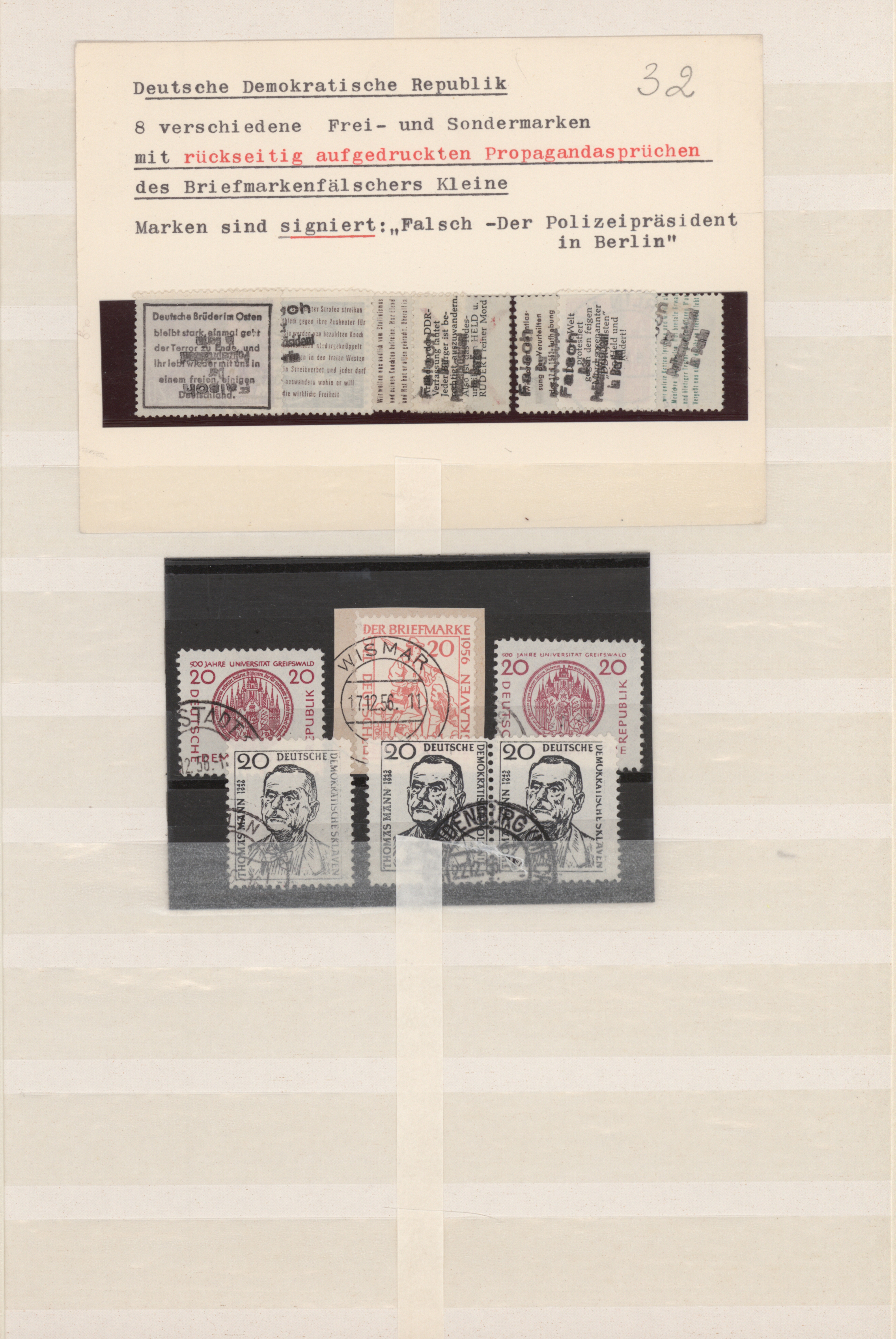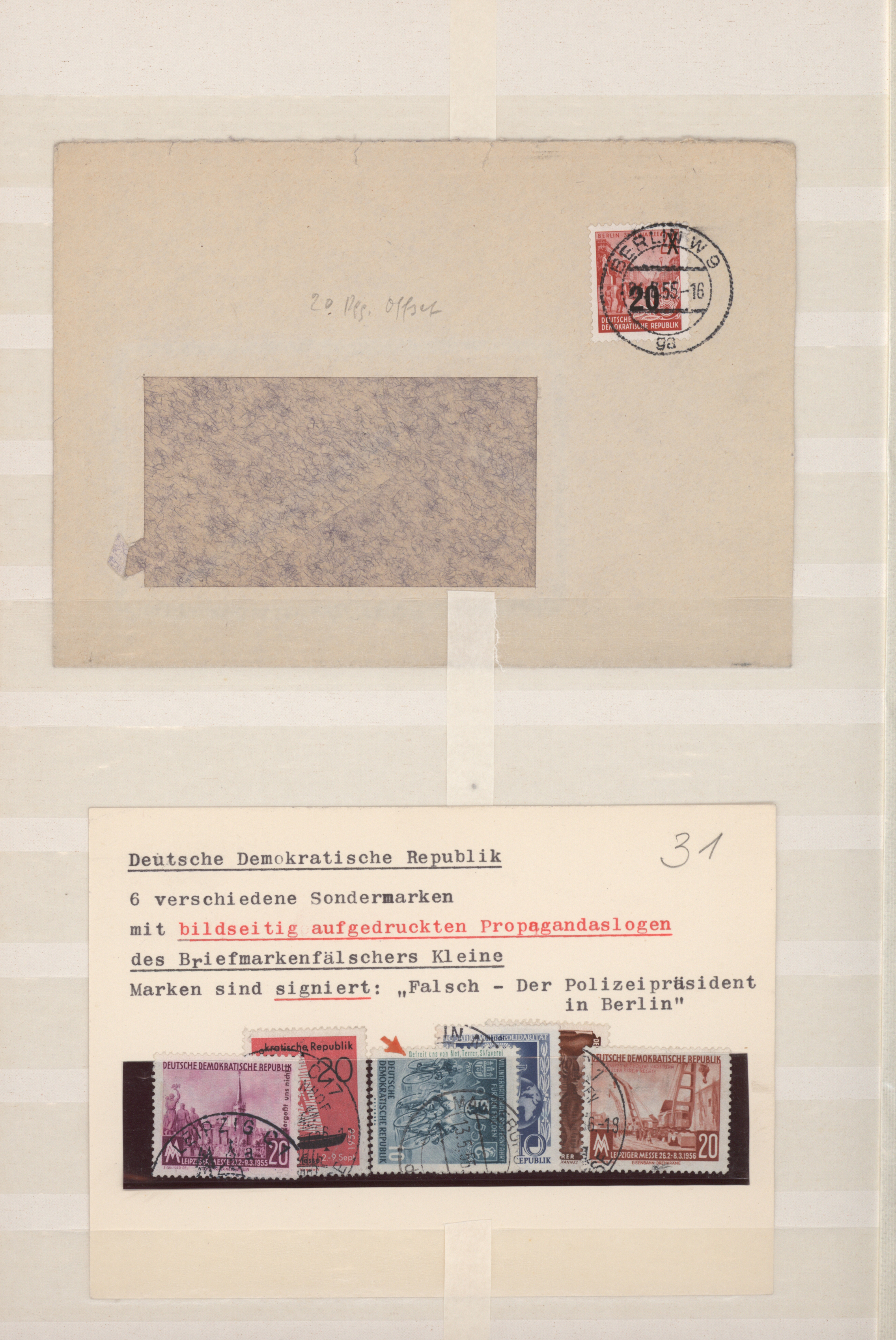 1955/1956, Kleine-Fälschungen, Sammlung von 16 Belegen und 28 Marken mit den gefälschen Aufdrucken und rs./vs. Propaganda-Zudrucken, zusätzlich zeitgenössische Zeitungsausschnitte und Korrespondenzen (u.a. Hosang, Justiz) bezüglich der Angelegenheit. Ein einmaliges Objekt! (1053116) (Image) (image1) (image2) (image3) (image4) (image5) (image6) (image7) (image8) (image9) (image10) (image11) (All Images)