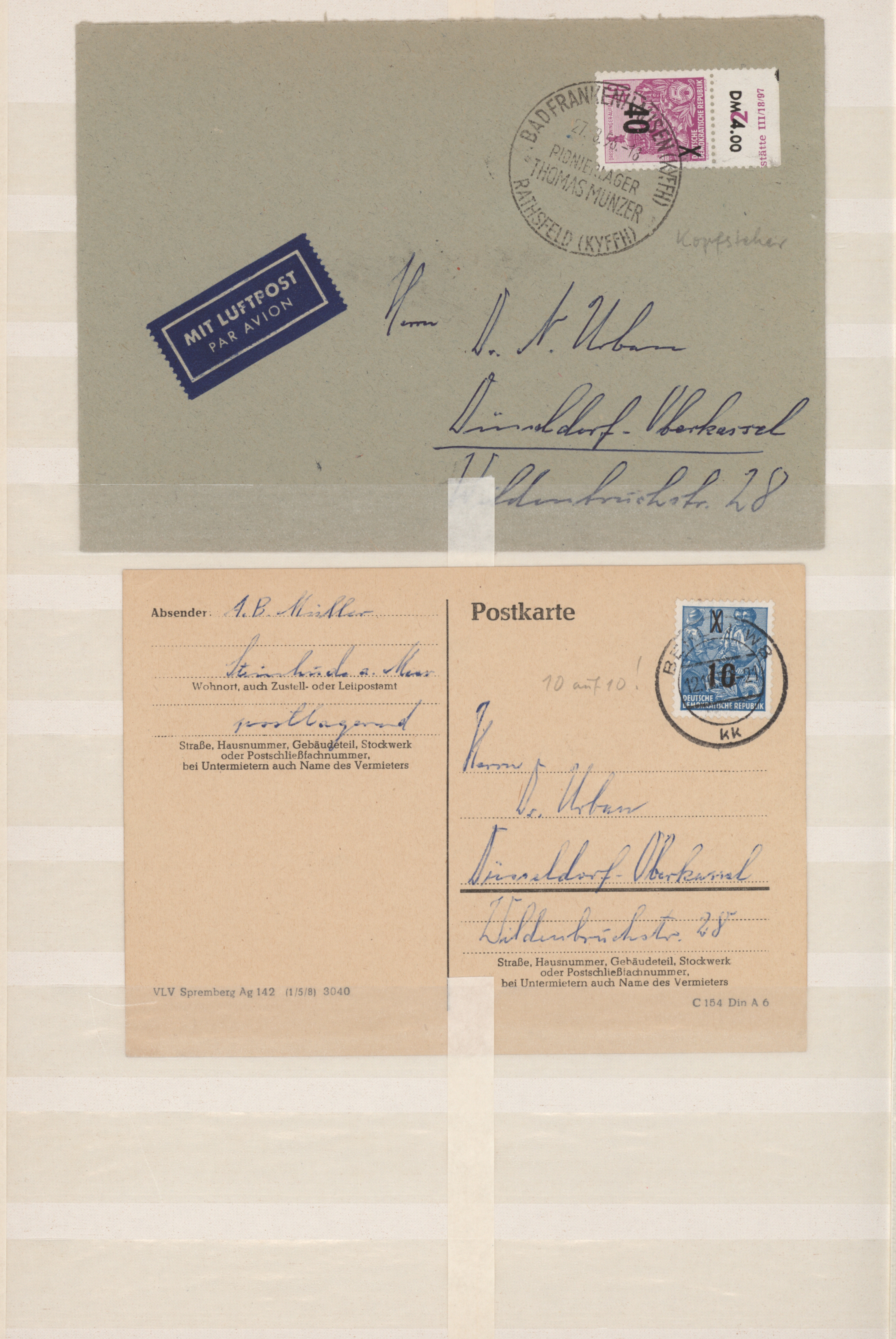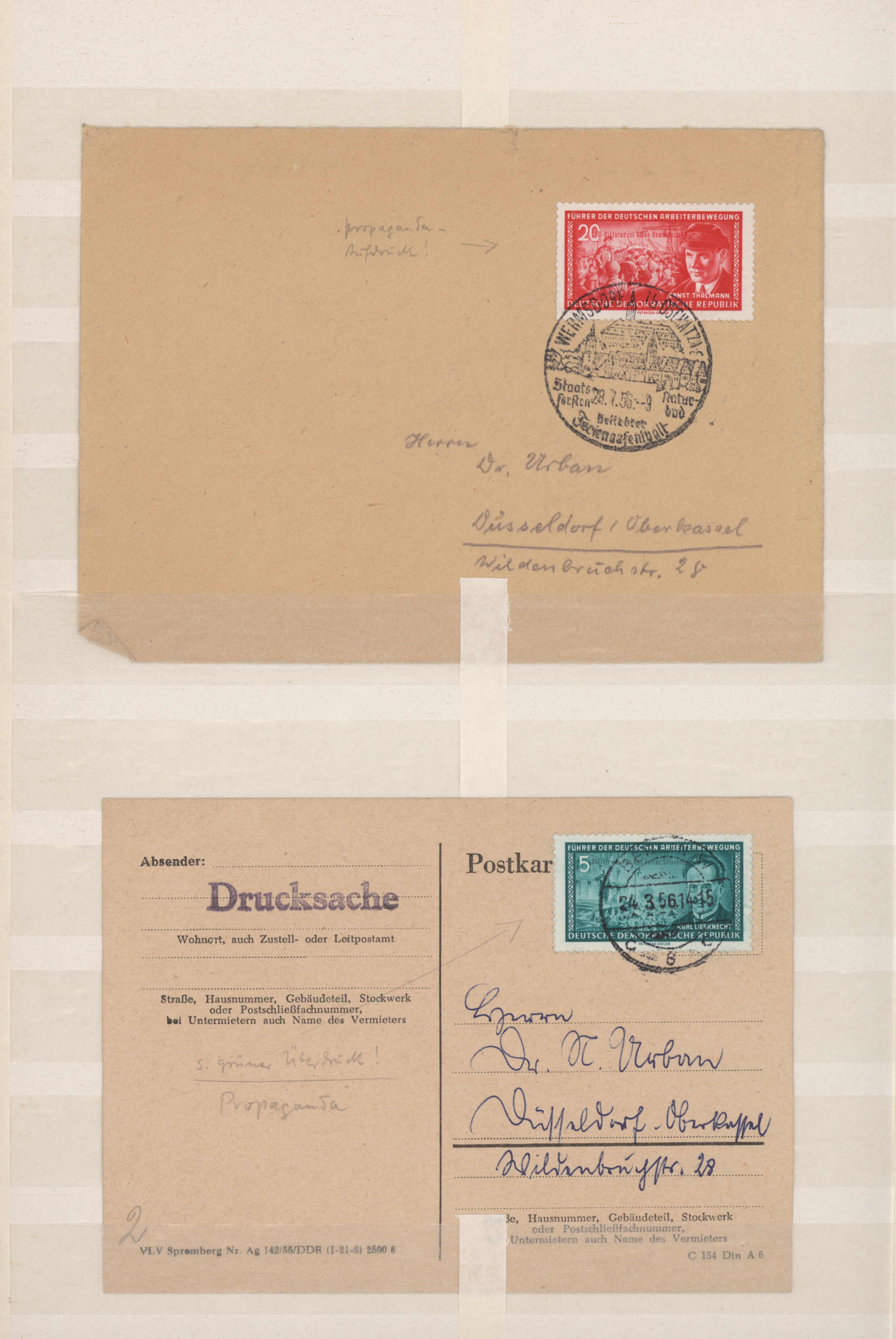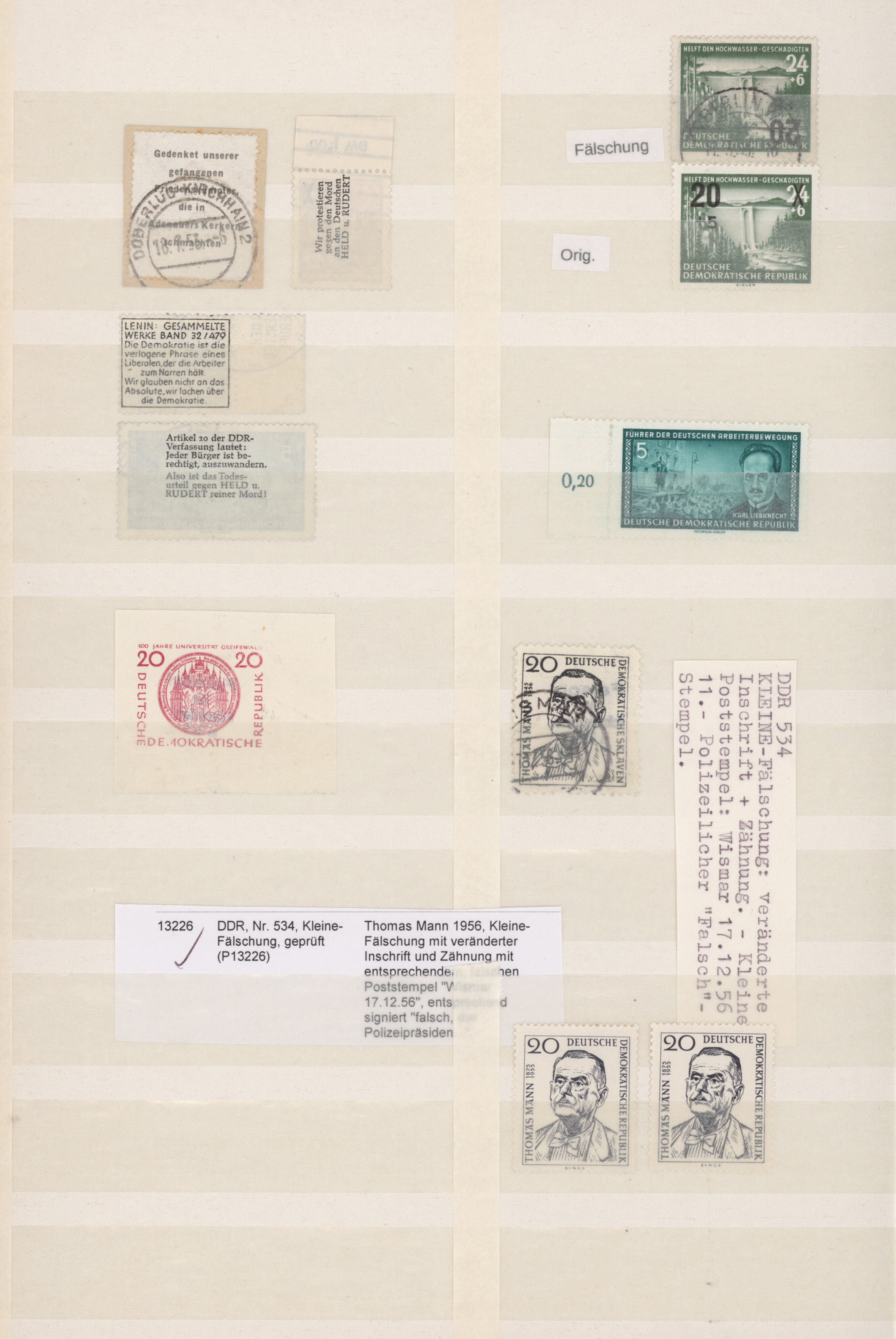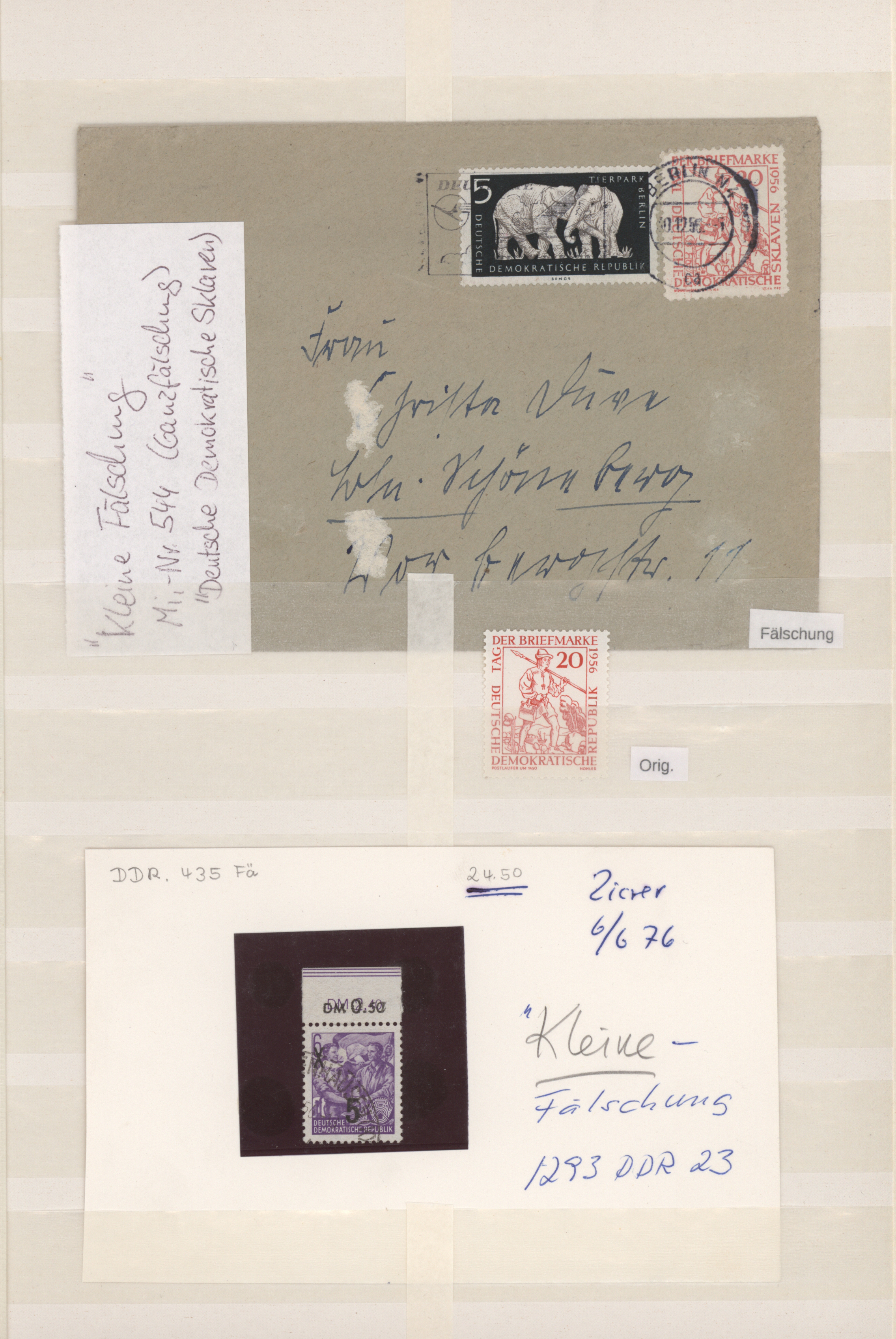 1955/1956, Kleine-Fälschungen, Sammlung von 16 Belegen und 28 Marken mit den gefälschen Aufdrucken und rs./vs. Propaganda-Zudrucken, zusätzlich zeitgenössische Zeitungsausschnitte und Korrespondenzen (u.a. Hosang, Justiz) bezüglich der Angelegenheit. Ein einmaliges Objekt! (1053116) (Image) (image1) (image2) (image3) (image4) (image5) (image6) (image7) (image8) (image9) (image10) (image11) (All Images)