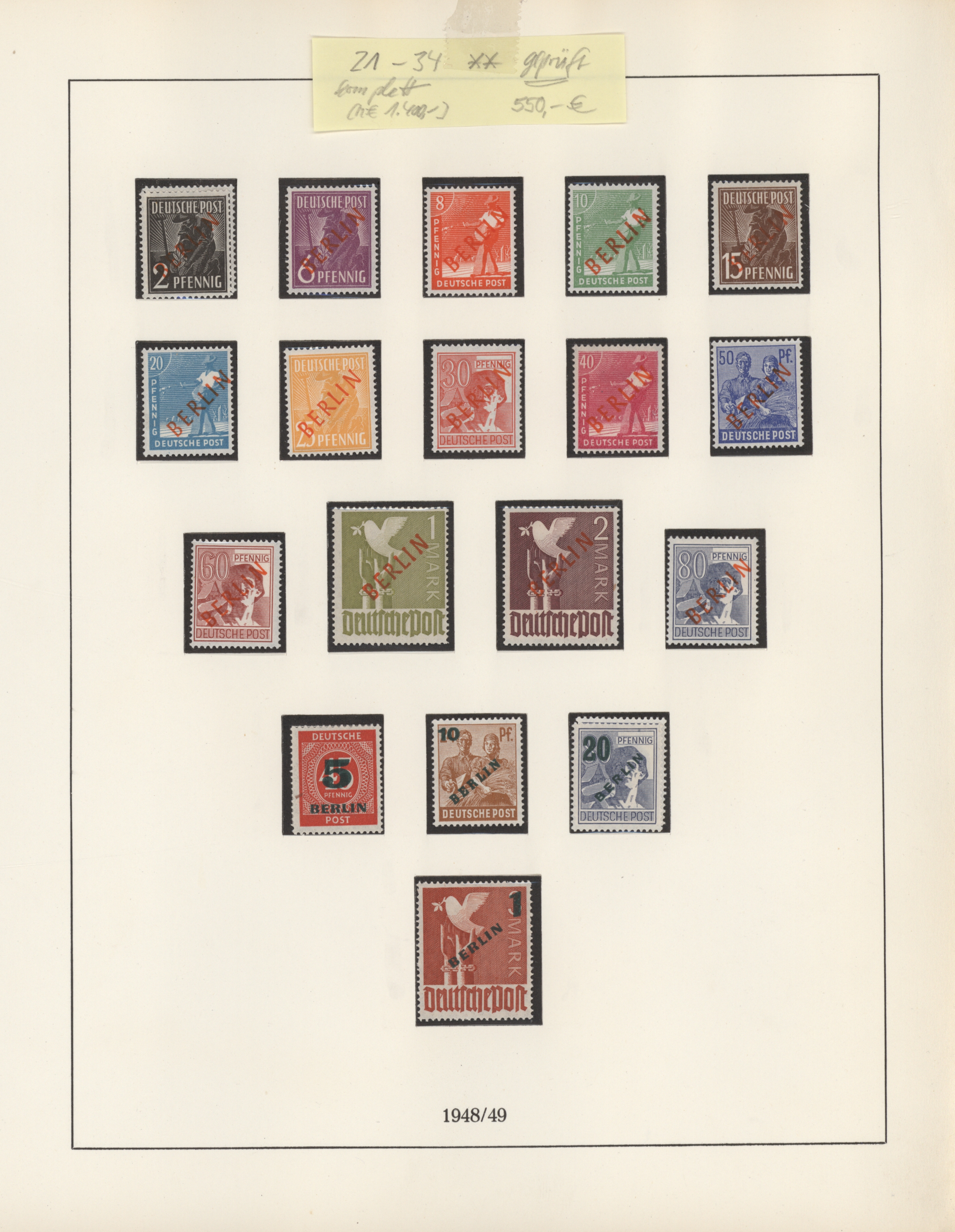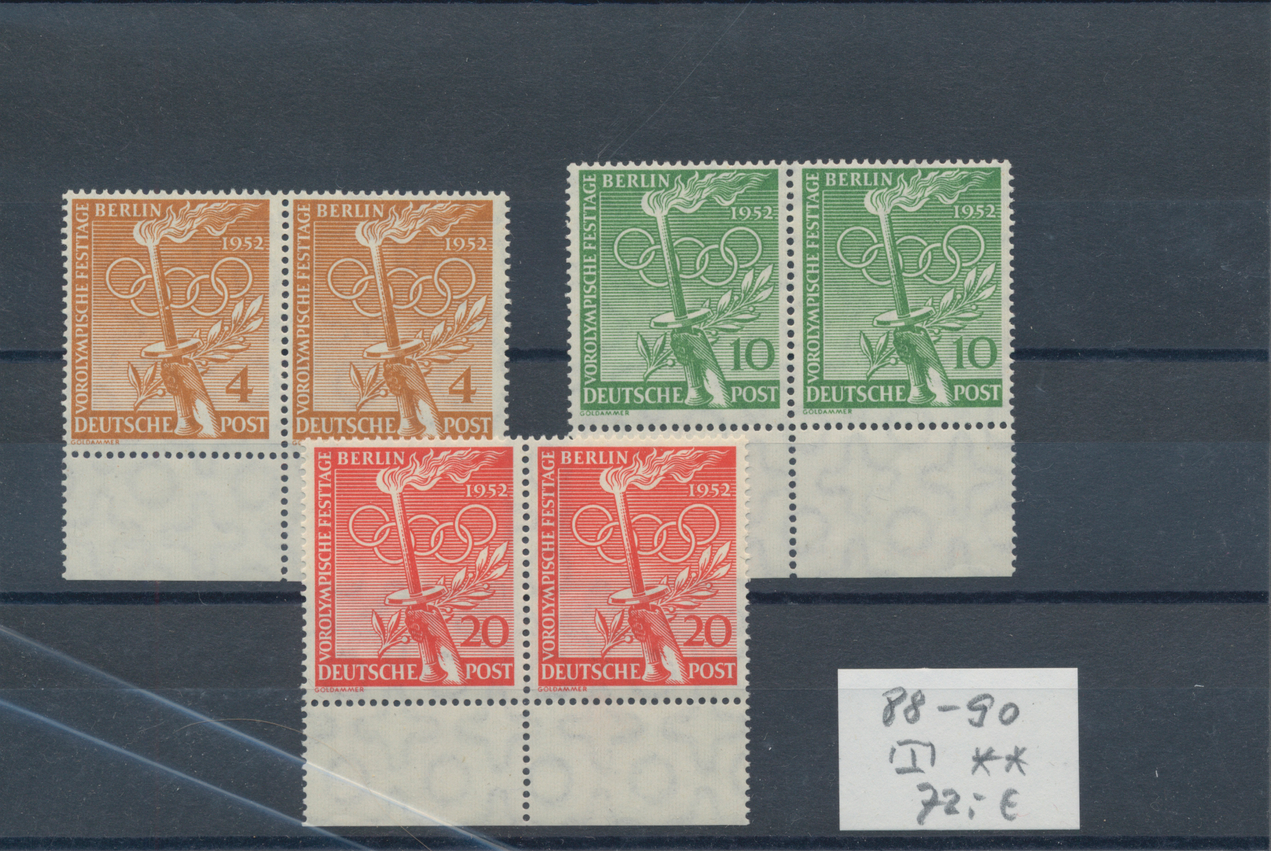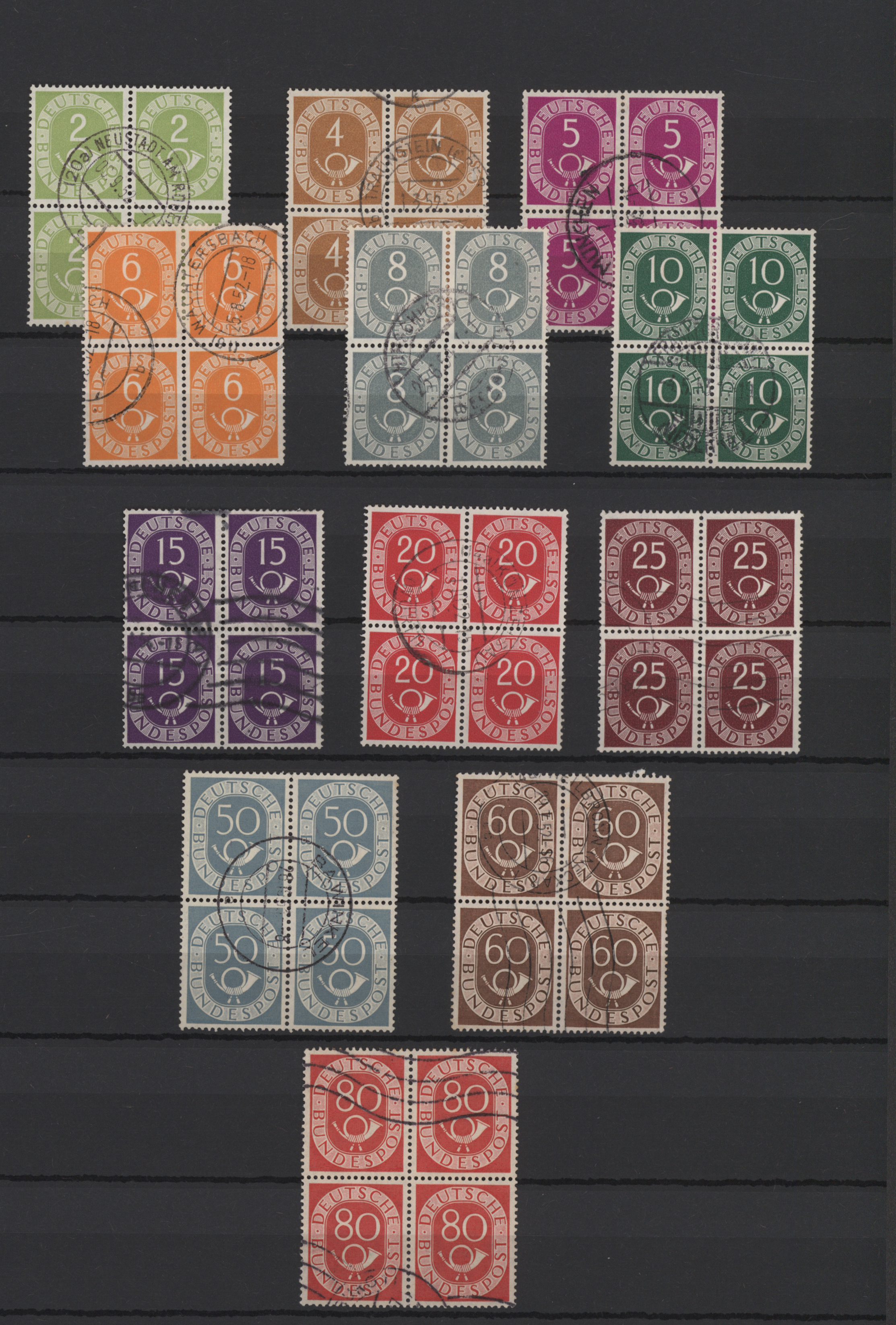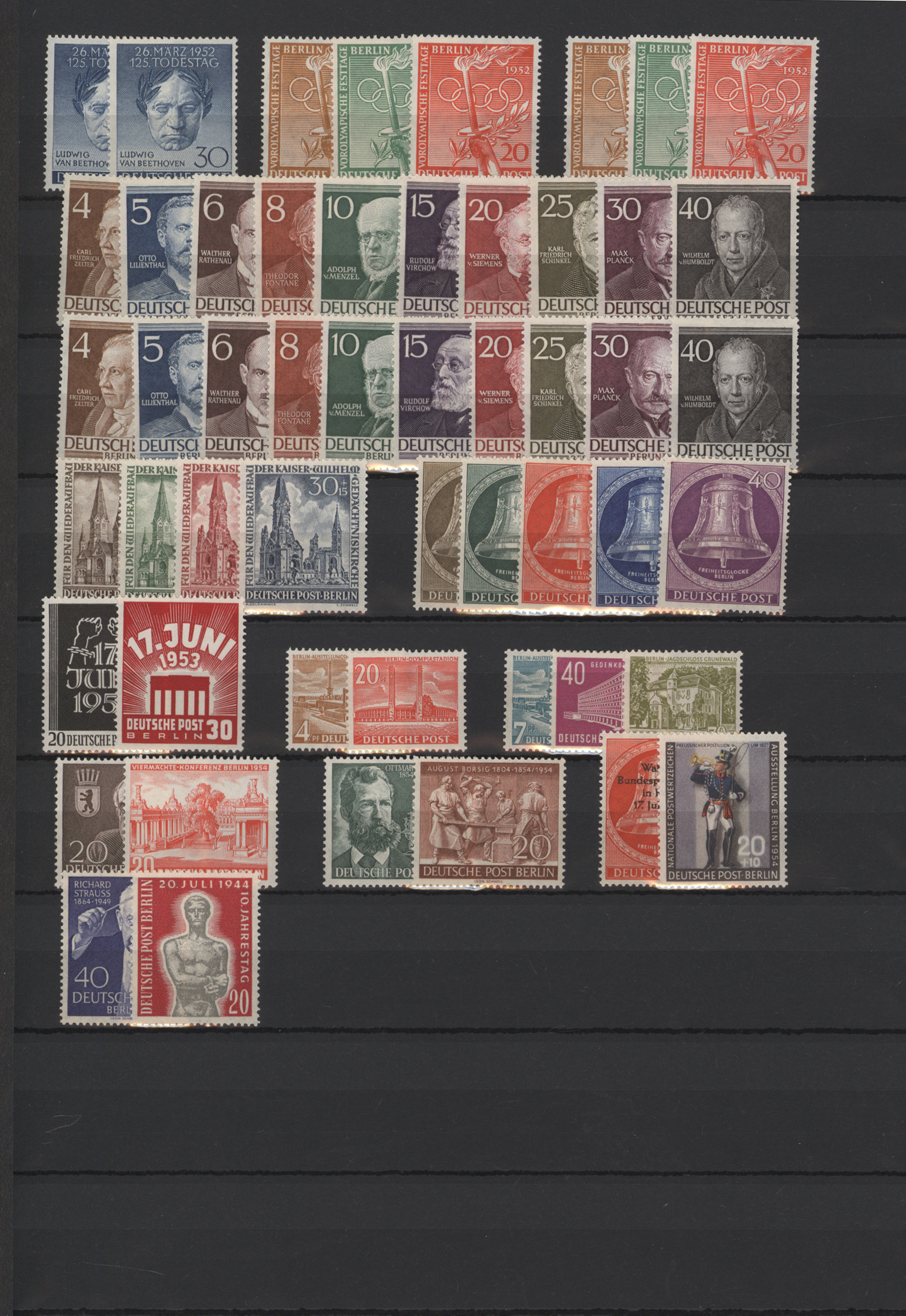 1949/1954, postfrische Berlin-Partie mit u.a. MiNr. 35/41, 42/60, 64/67, 68/70, 71/125 (Mi. 3.580,- €), ferner Bund mit gestempelten 4er-Blocks Posthorn ex 2 Pfg./80 Pfg. (Mi. 3.230,- €).