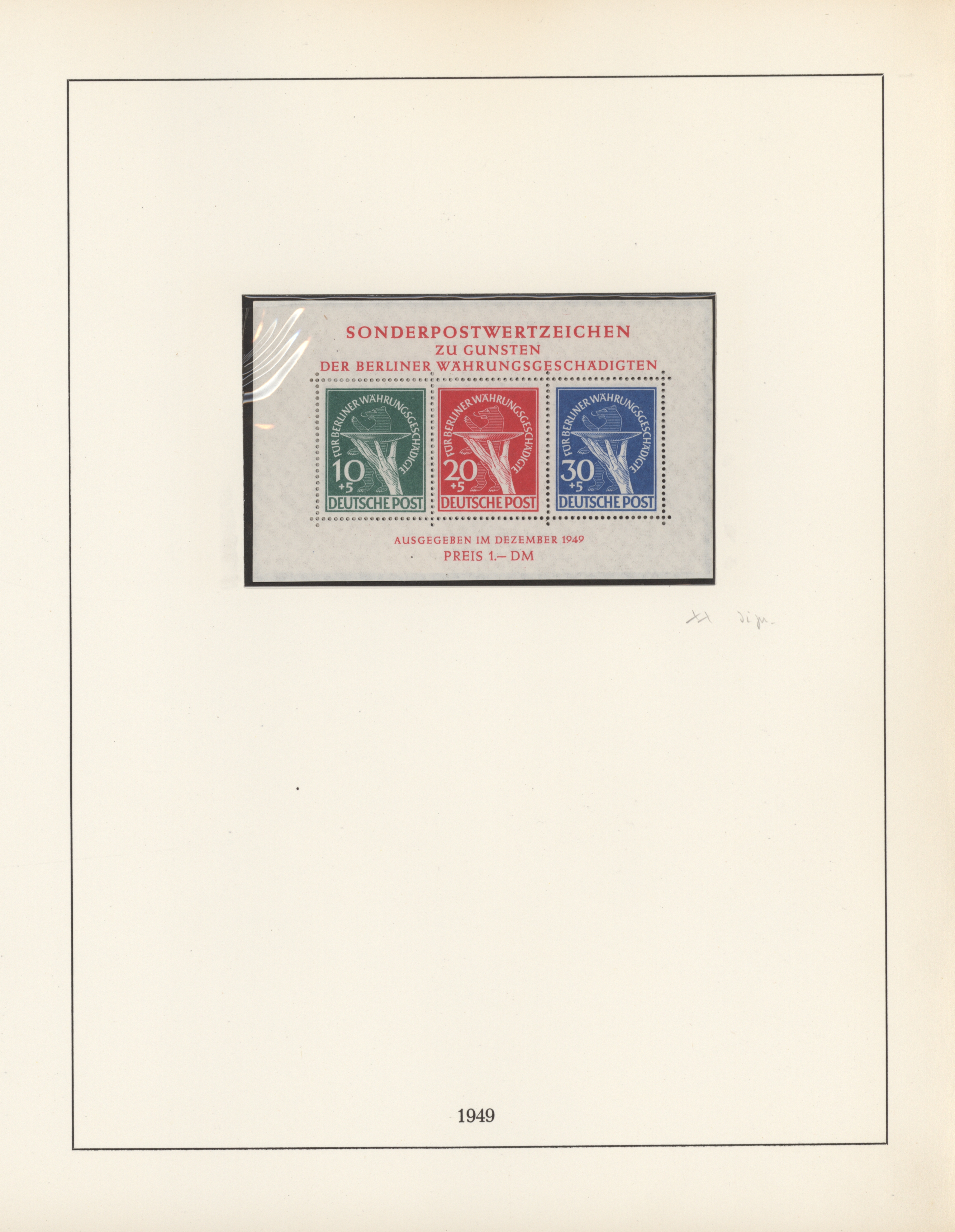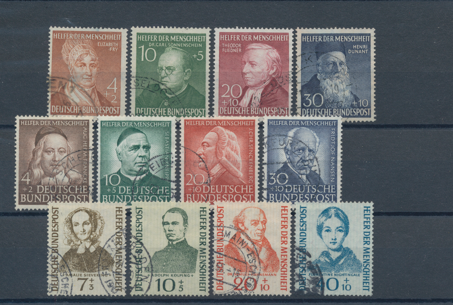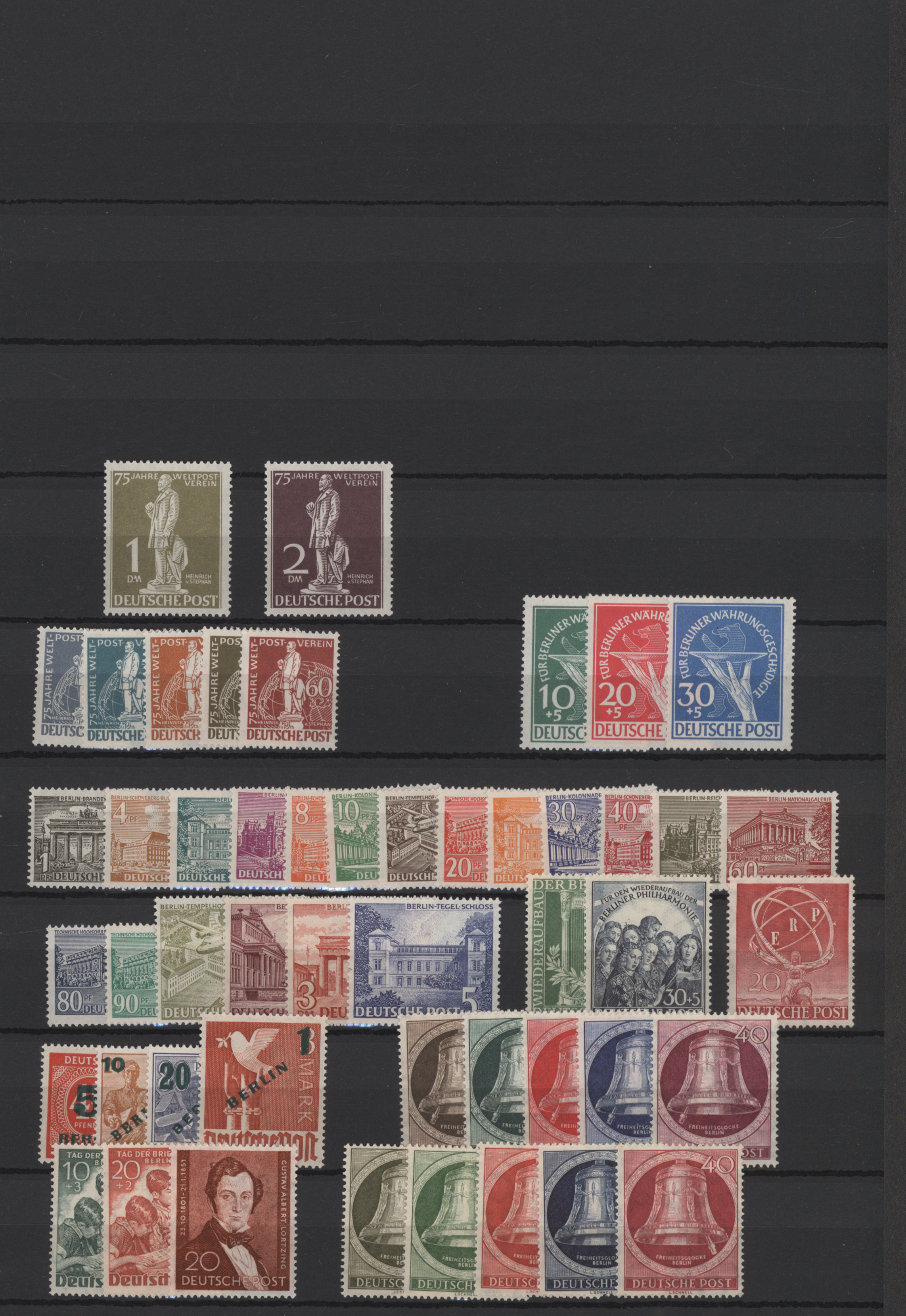 1949/59, kleine Partie auf Steckkarten mit besseren Sätzen in überwiegend gestempelter Erhaltung, dabei Bund 100 J. Briefmarken, Wohlfahrtssätze 1949, 52-55, Bach, dazu Berliner Frühwerte ab UPU ebenfalls überwiegend gestempelt.