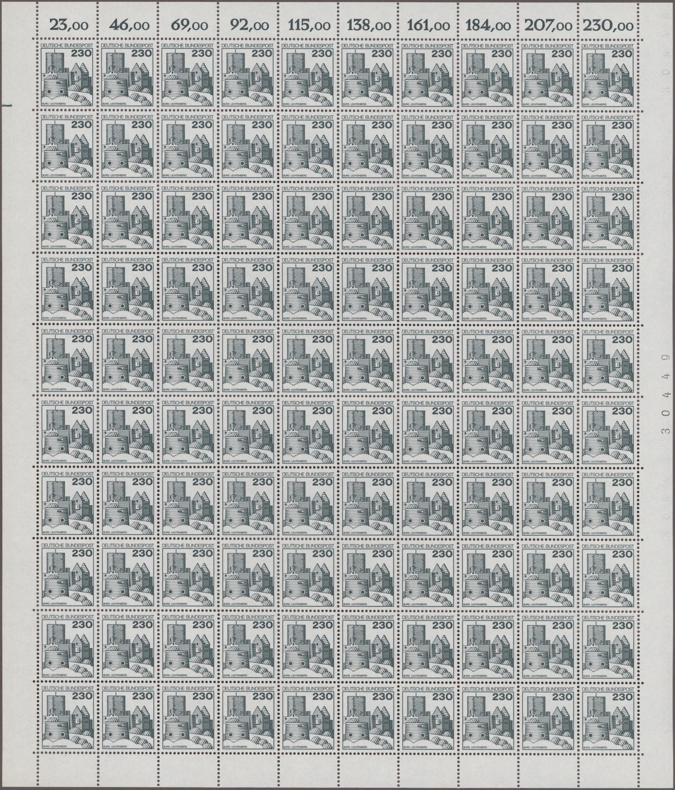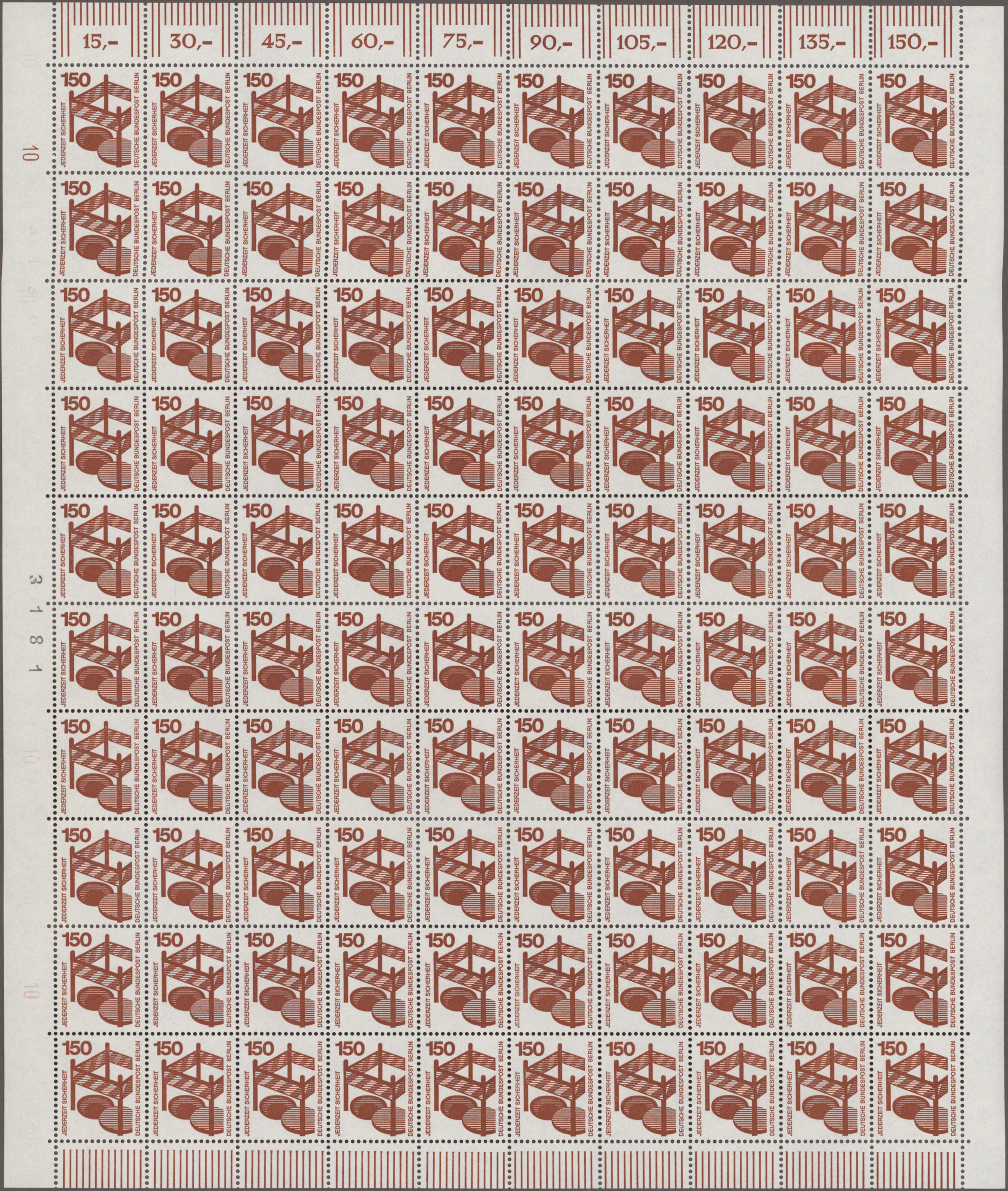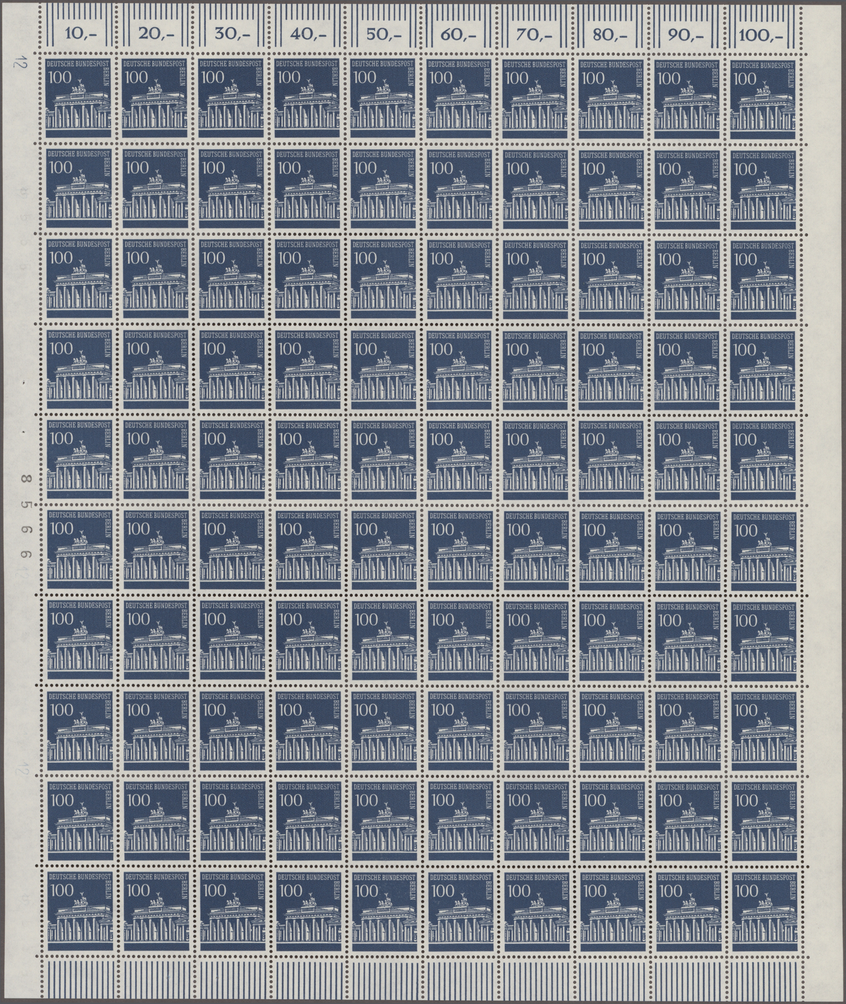 1956/95 (ca.), umfassender Bestand von vielen hundert zumeist kompletten Bögen Bund und Berlin von Ende der 50er bis in die 90er Jahre in 45 Bogenmappen(!), die vier Kartons füllen, dabei Sonder- und Zuschlagswerte, komplette Sätze, Dauerserien B&S, Frauen und Sehenswürdigkeiten auch mit hohen Werten, teils mehr- bis vielfach. Wir haben nicht nachgerechnet wieviel DM hier ausgegeben wurde, die Post hat es jedenfalls sicherlich erfreut....