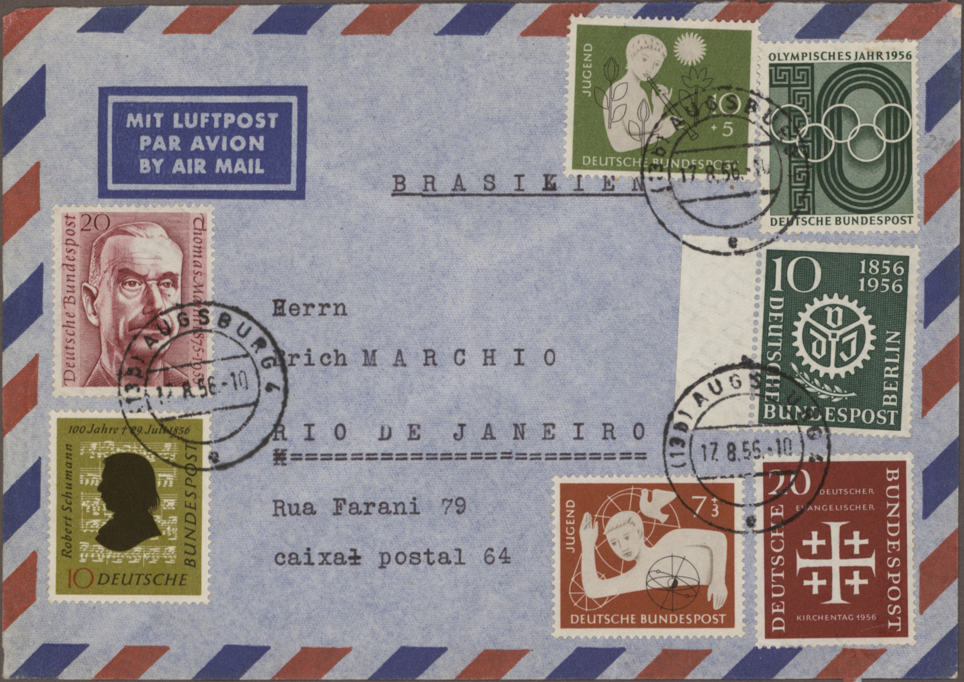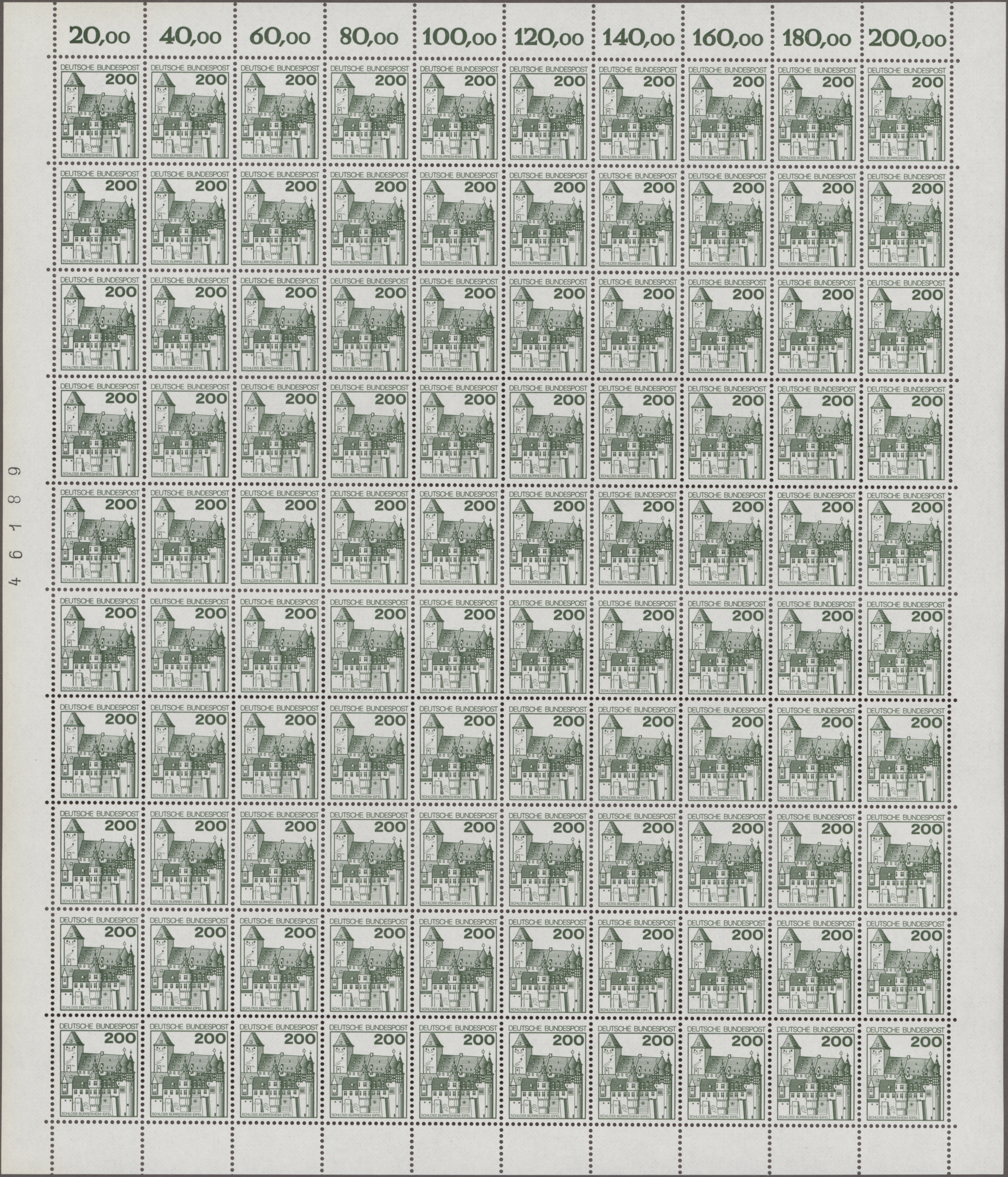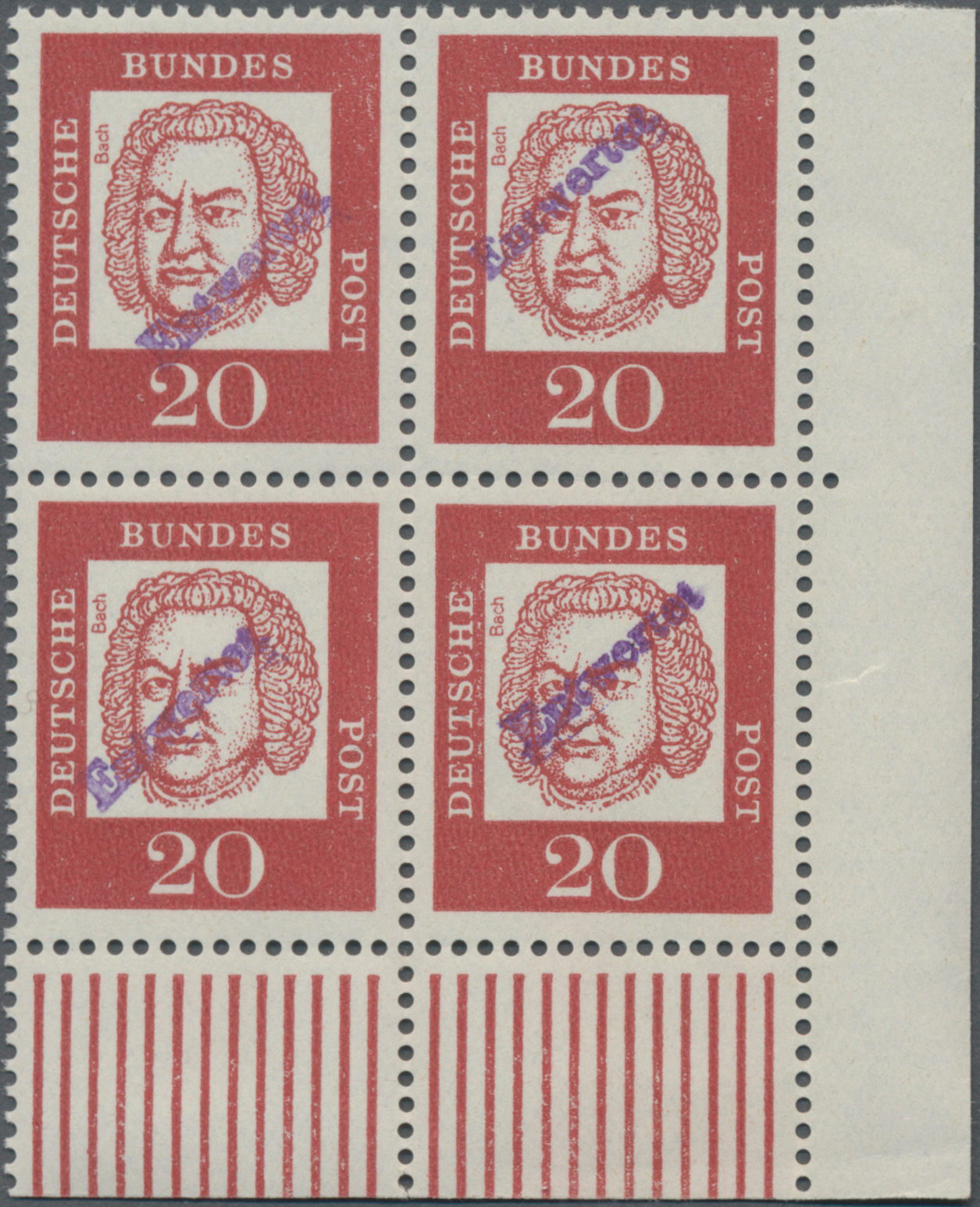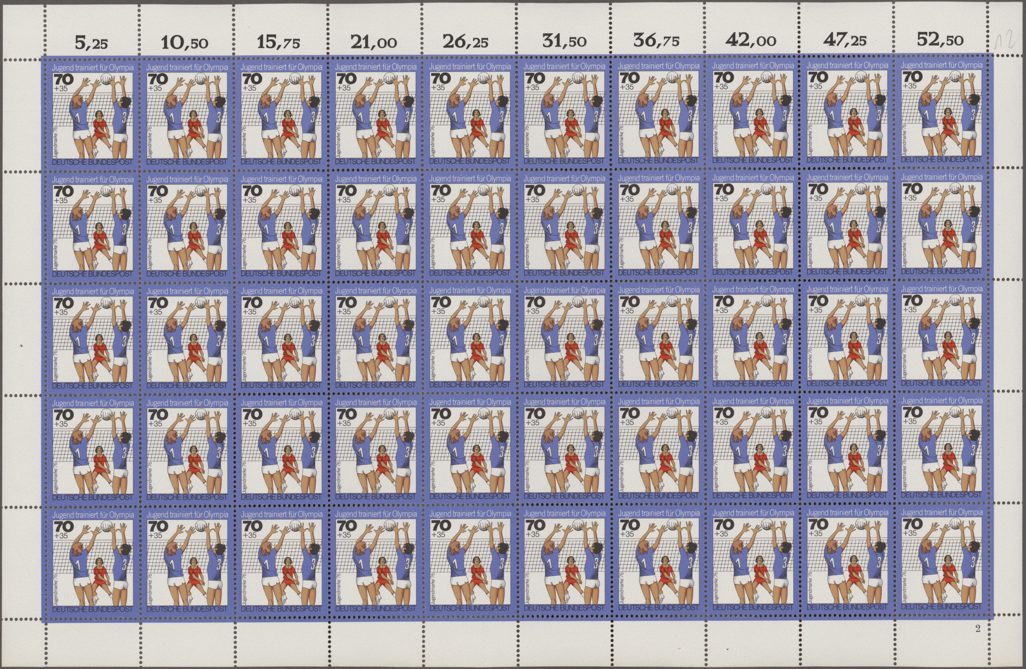 1956/95 (ca.), umfassender Bestand von vielen hundert zumeist kompletten Bögen Bund und Berlin von Ende der 50er bis in die 90er Jahre in 45 Bogenmappen(!), die vier Kartons füllen, dabei Sonder- und Zuschlagswerte, komplette Sätze, Dauerserien B&S, Frauen und Sehenswürdigkeiten auch mit hohen Werten, teils mehr- bis vielfach. Wir haben nicht nachgerechnet wieviel DM hier ausgegeben wurde, die Post hat es jedenfalls sicherlich erfreut....