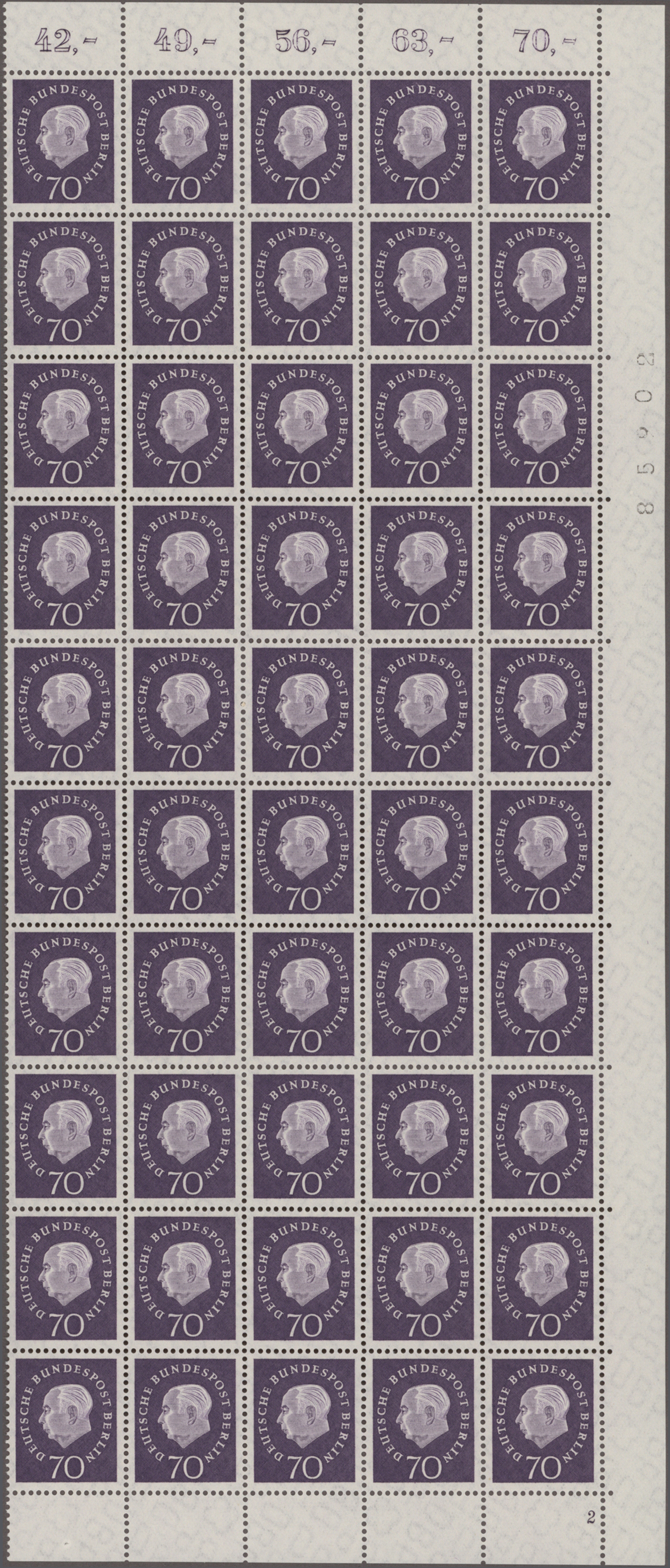 1959/79, zwei Bogenmappen mit kompletten Bogen oder größeren Einheiten mit entsprechenden Randbesonderheiten inkl. Dauer- und Zuschlagsserien teils sogar mehr- bis vielfach, dabei z.B. 50 Sätze Berlin Heuss III, komplette Bogen Brandenburger Tor, Unfallverhütung und Burgen & Schlösser sowie viele verschiedenen Jugendserien. Riesiger Katalogwert und der ehemalige Einstandspreis erst....