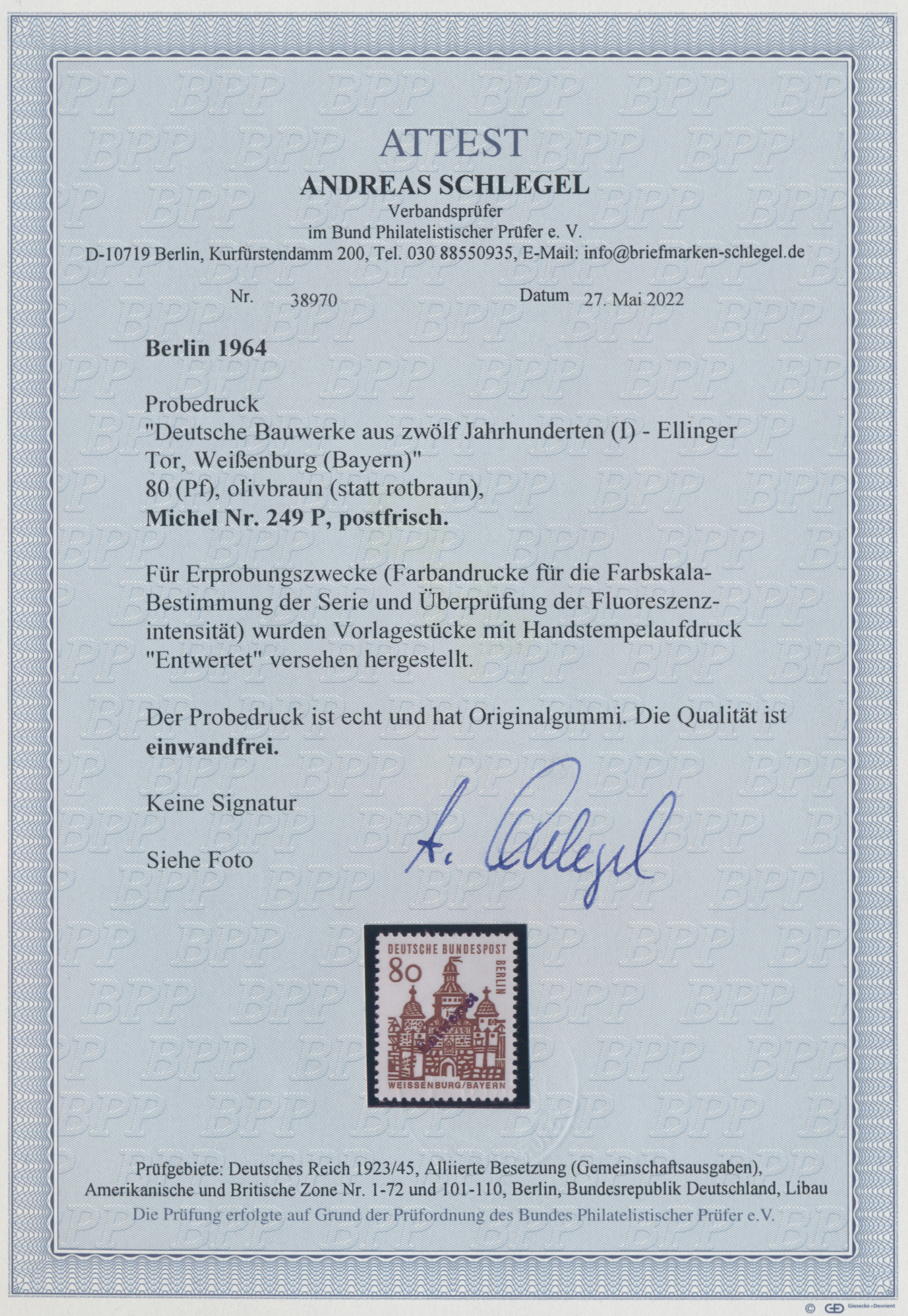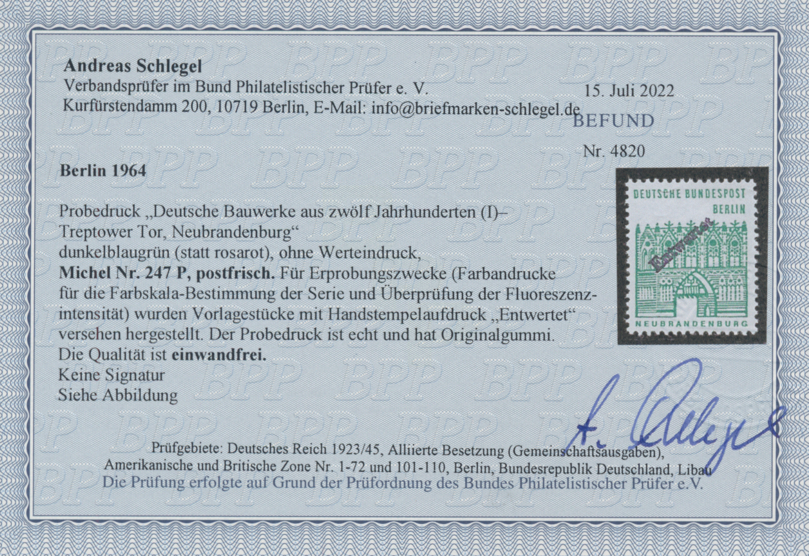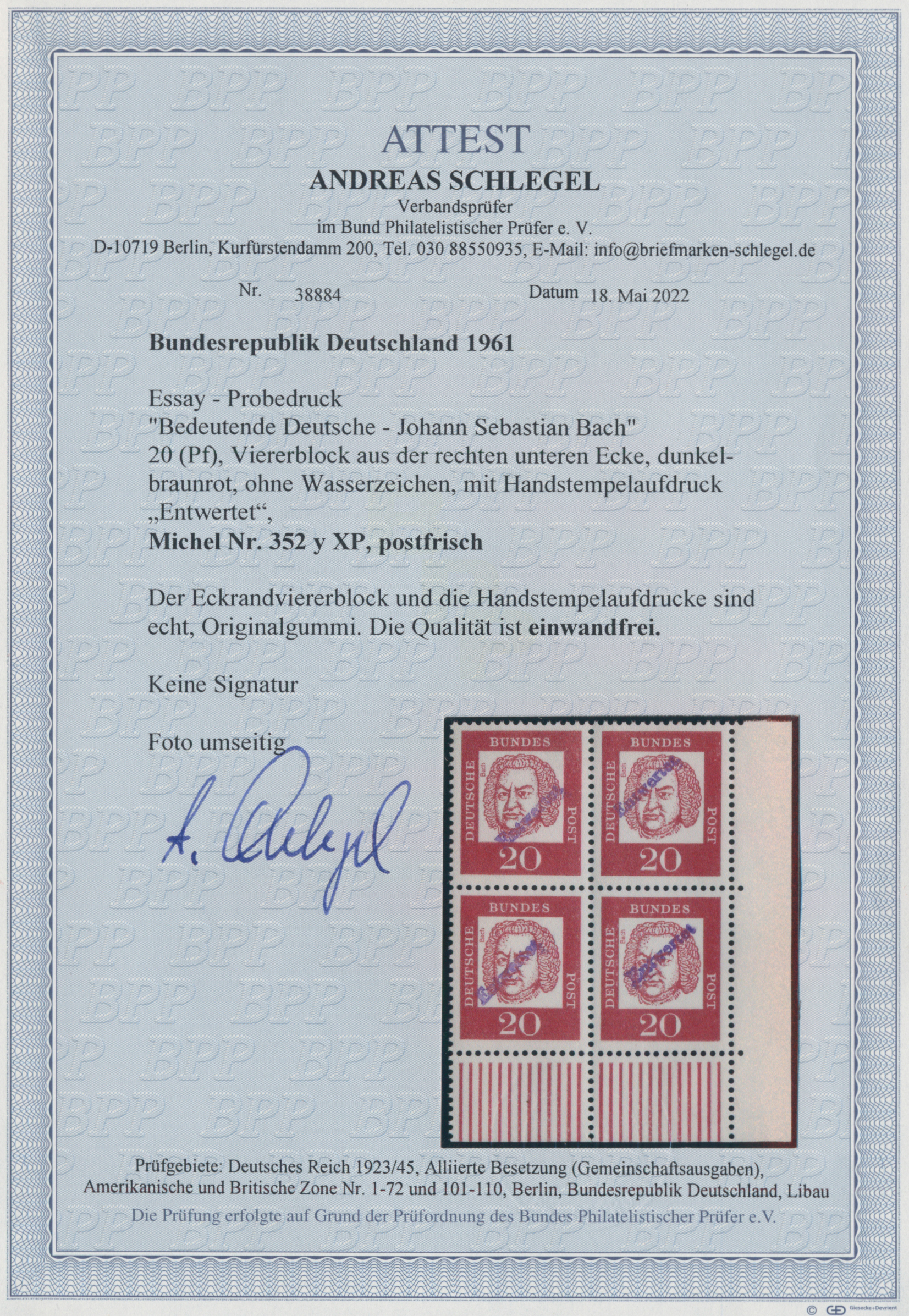 1961/1964, Essays/Probedrucke mit "Entwertet"-Aufdruck, Lot mit Bund MiNr. 352yXP im Eckrand-4er-Block sowie Berlin MiNr. 247P und 249P, je mit Attest/Befund Schlegel BPP "einwandfrei". Mi. 2.230,- €.