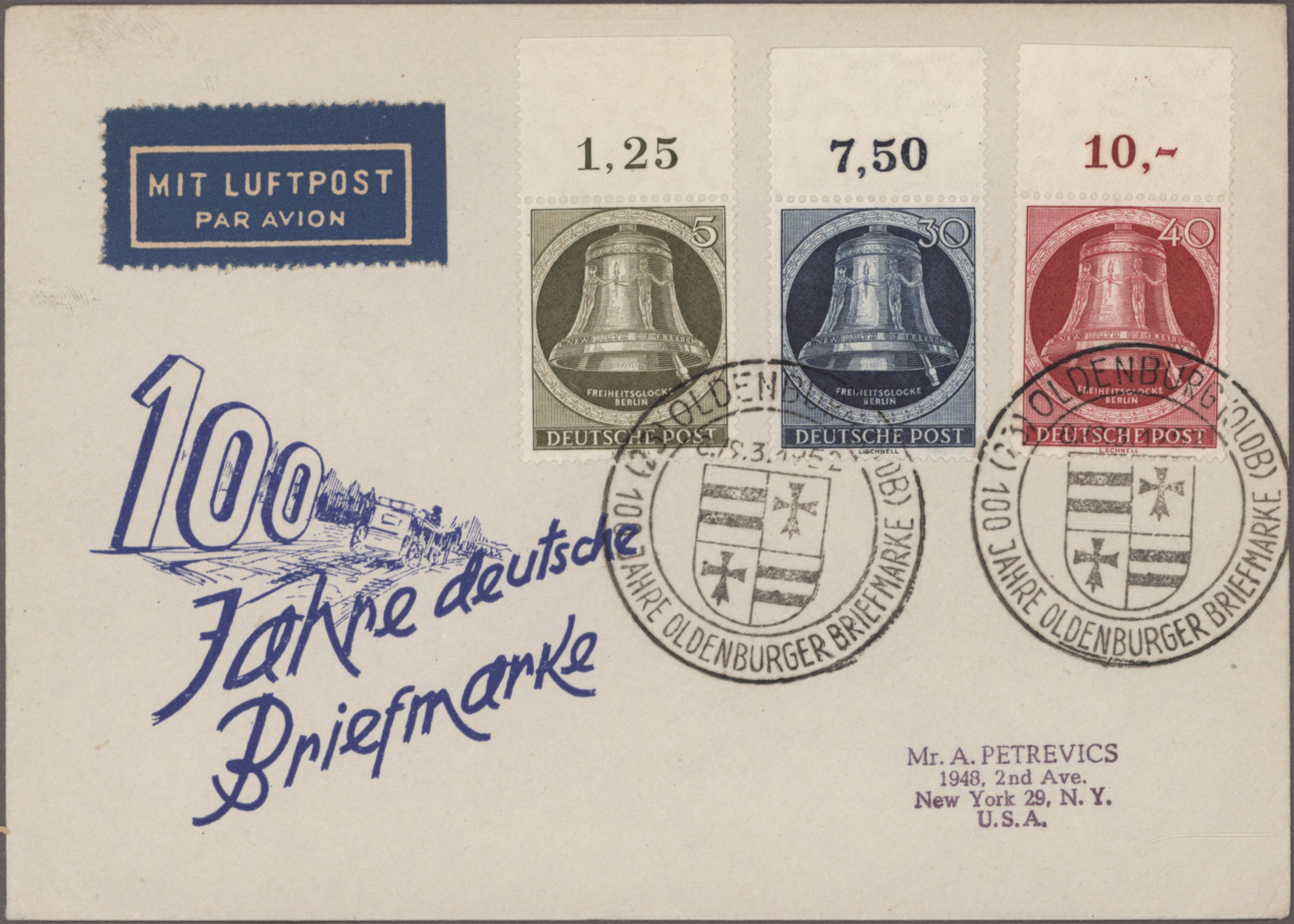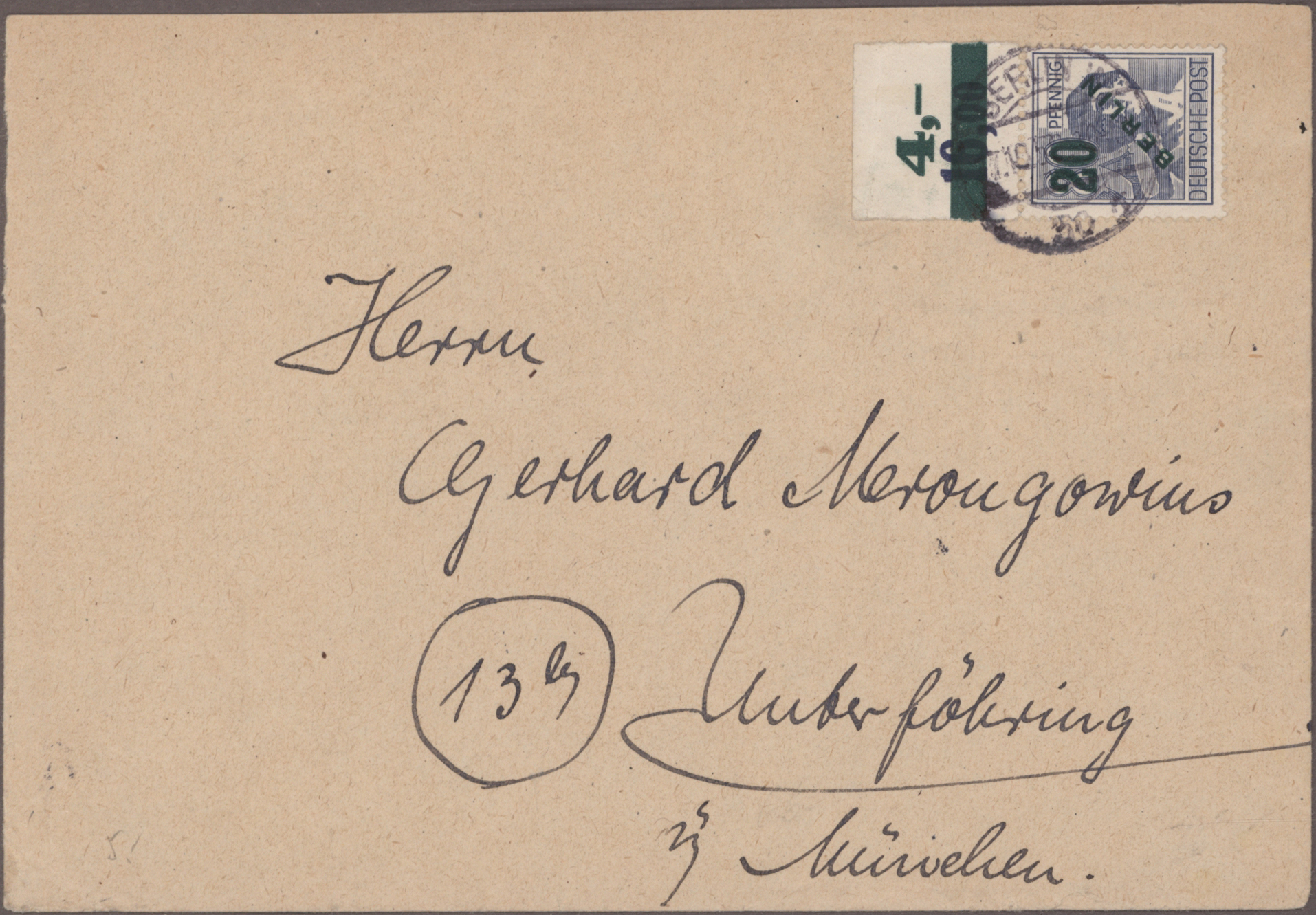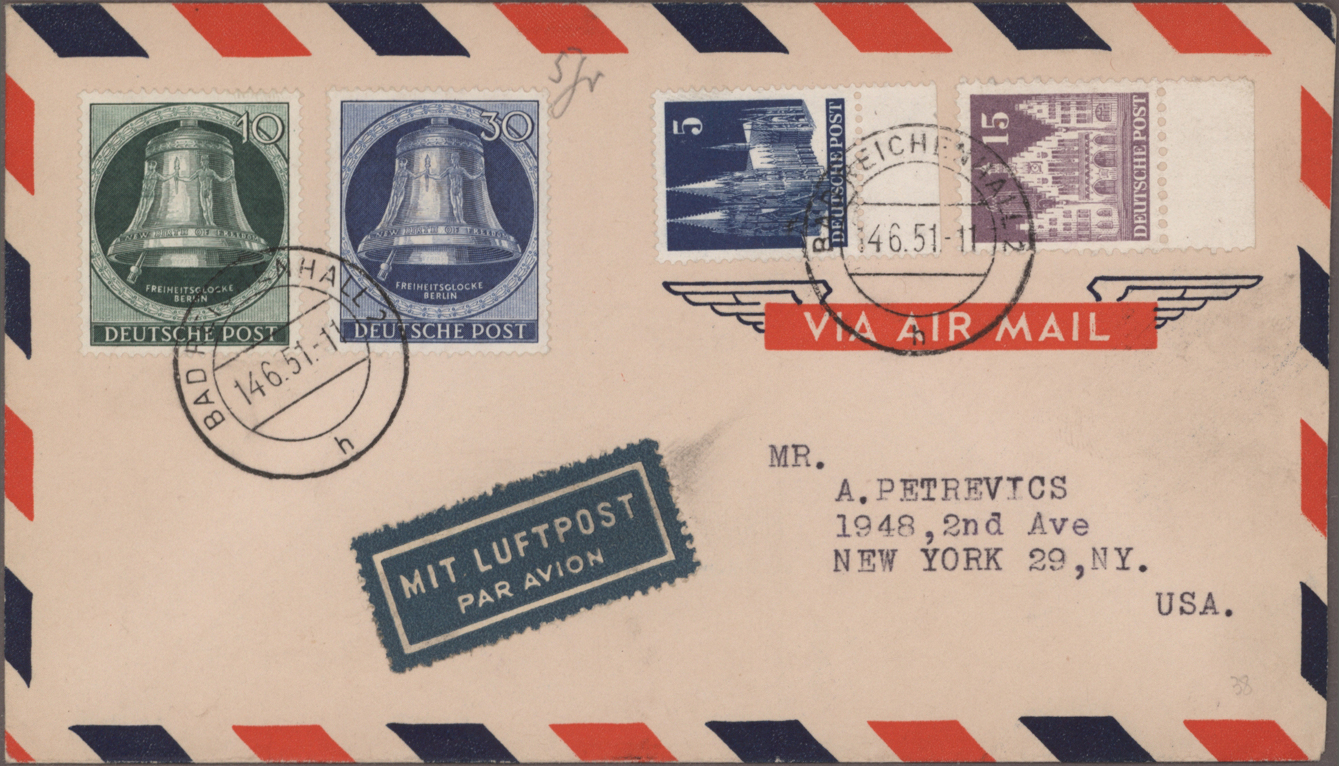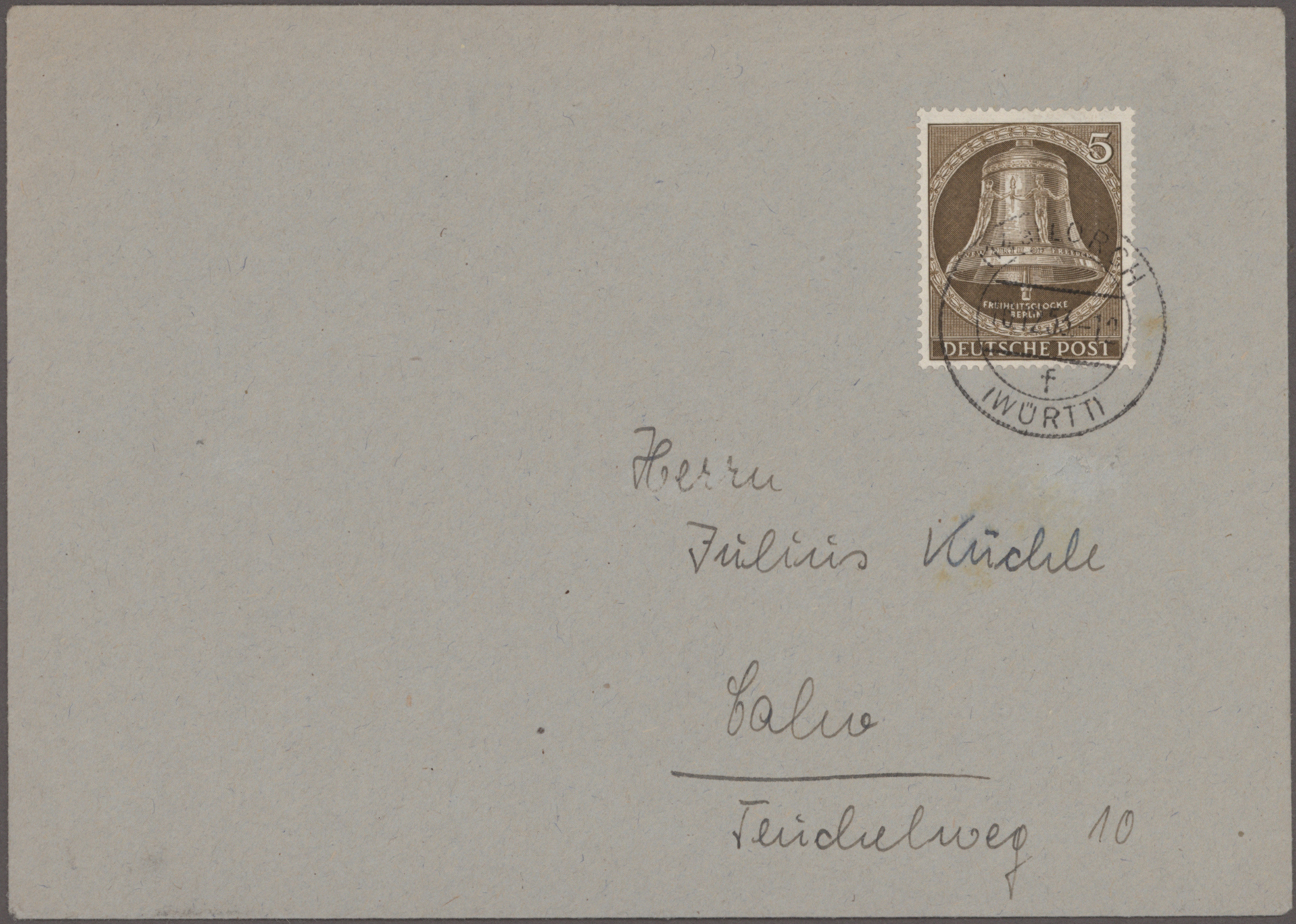 1946/1949, kleine Sammlung von 55 Briefen und Karten der Anfangsjahre, dabei Vorläufer, Aufdruckmarken mit u.a. MiNr. 11 EF auf Postkarte in die USA, 15 EF auf Brief der
