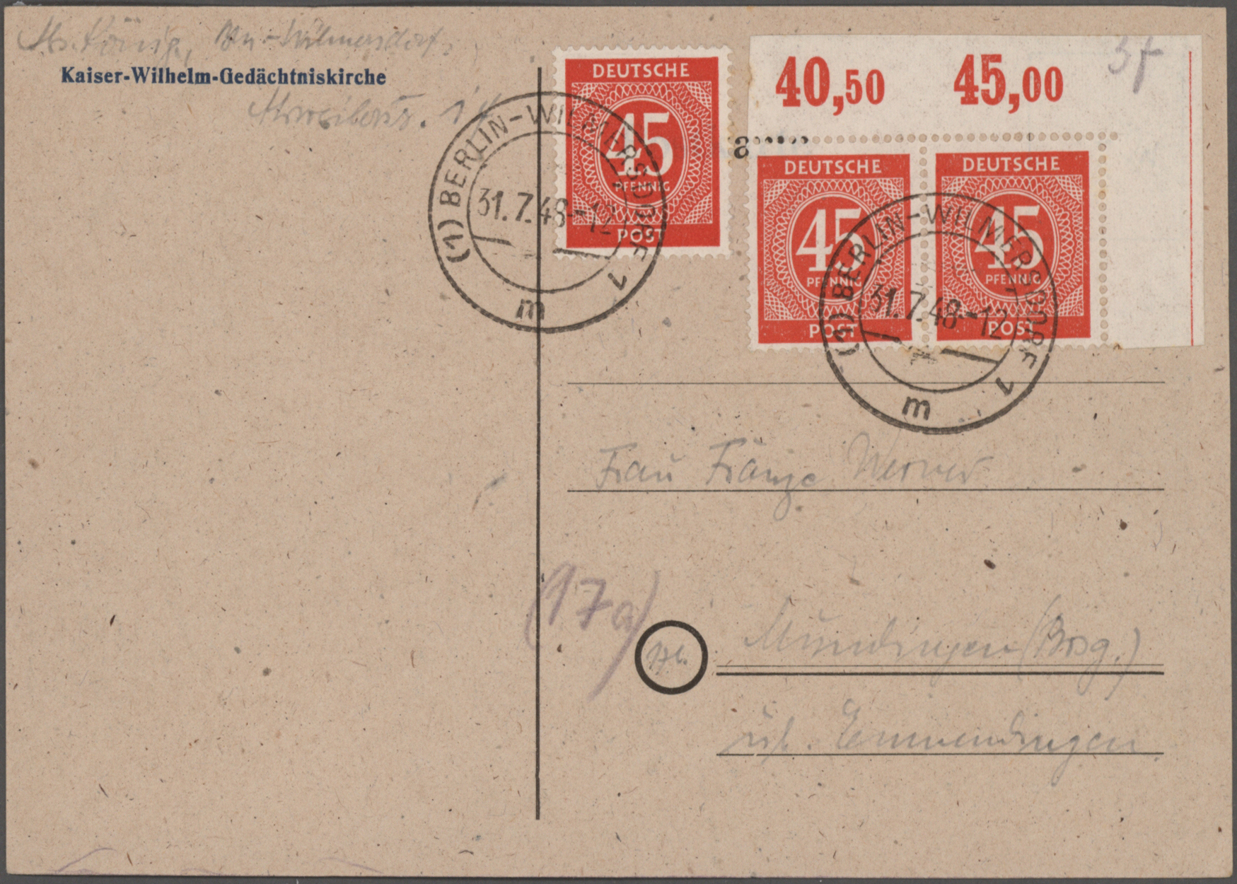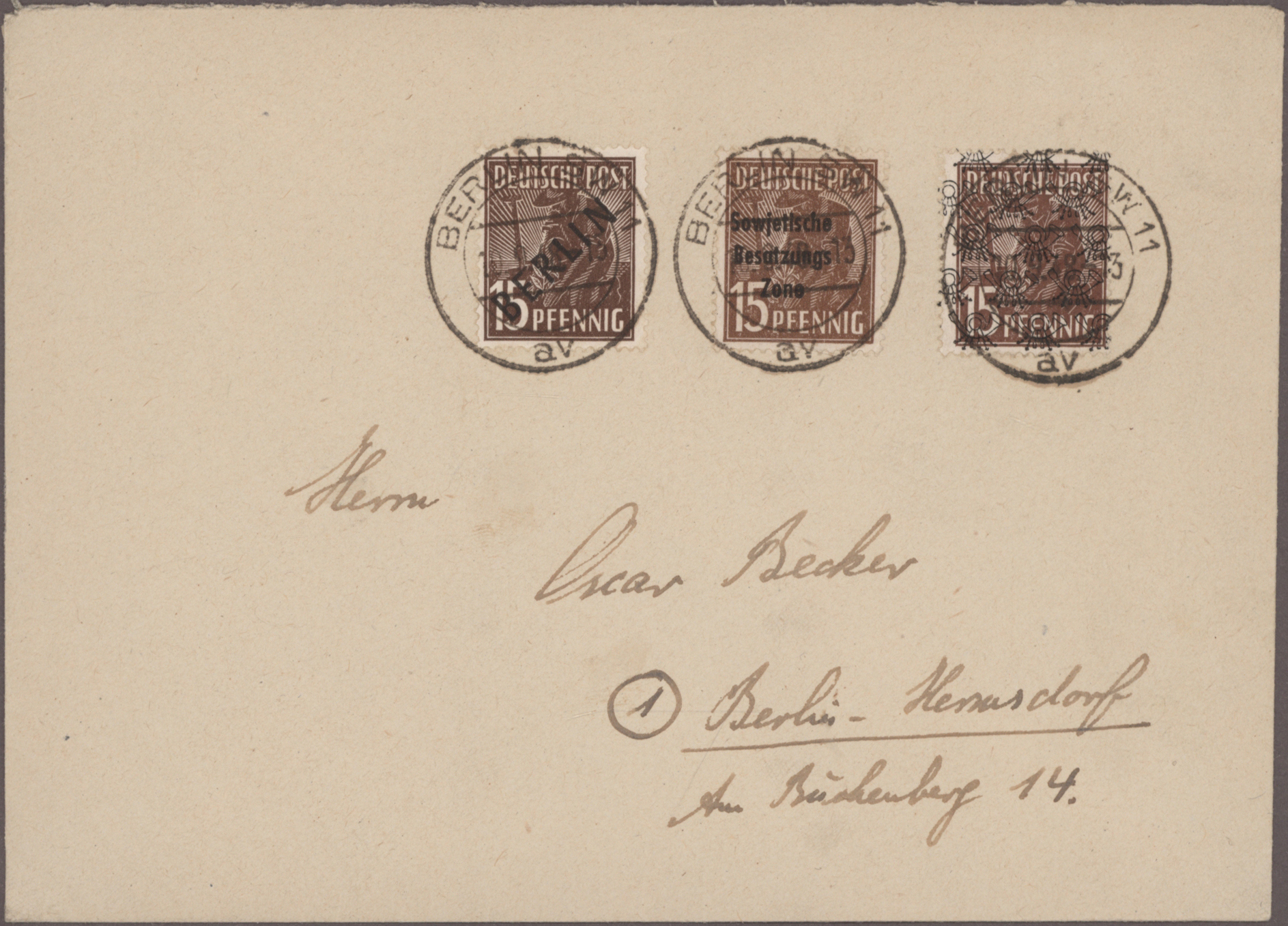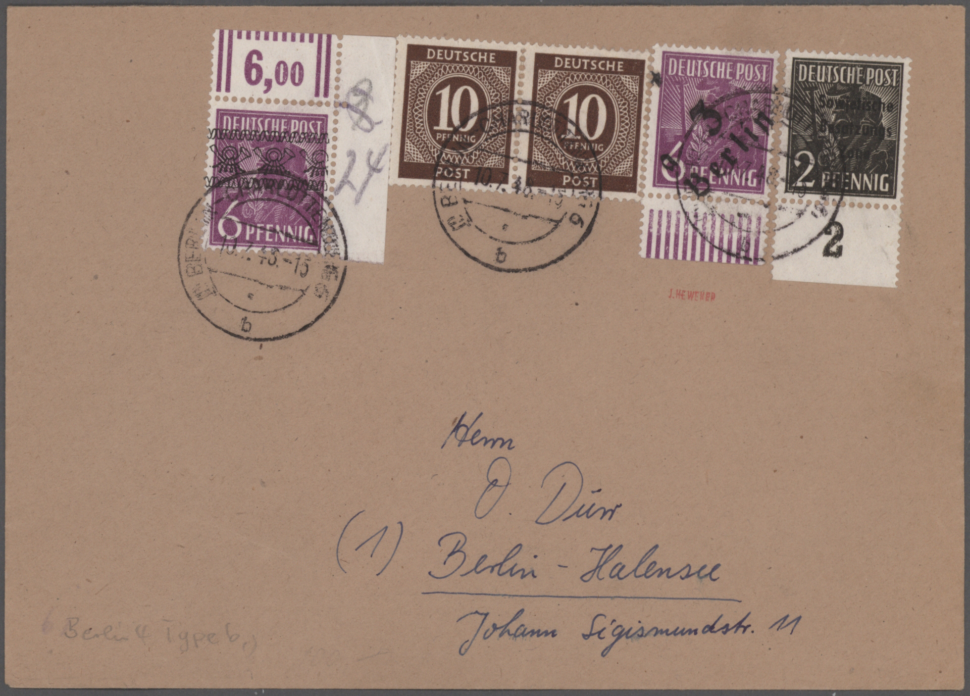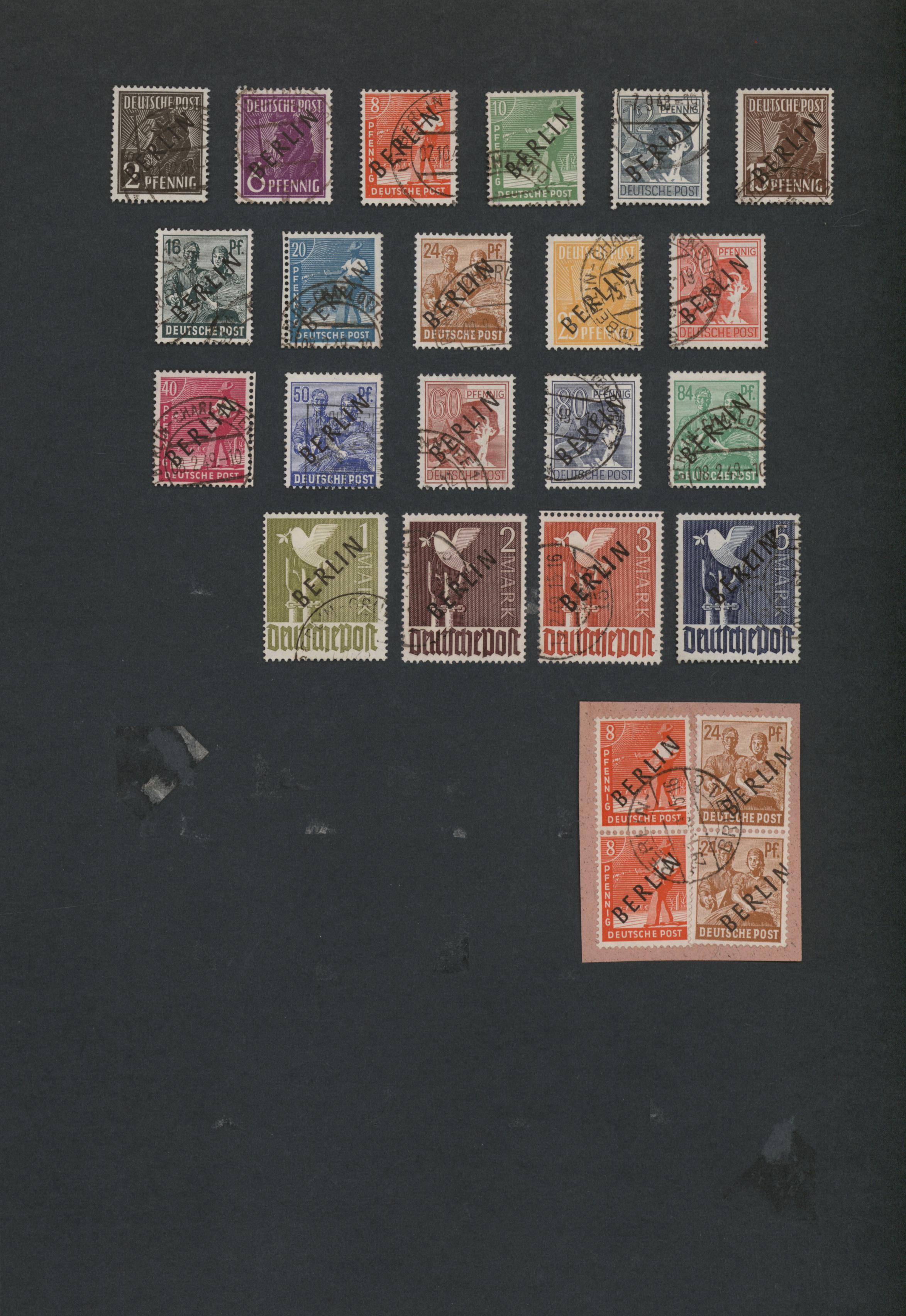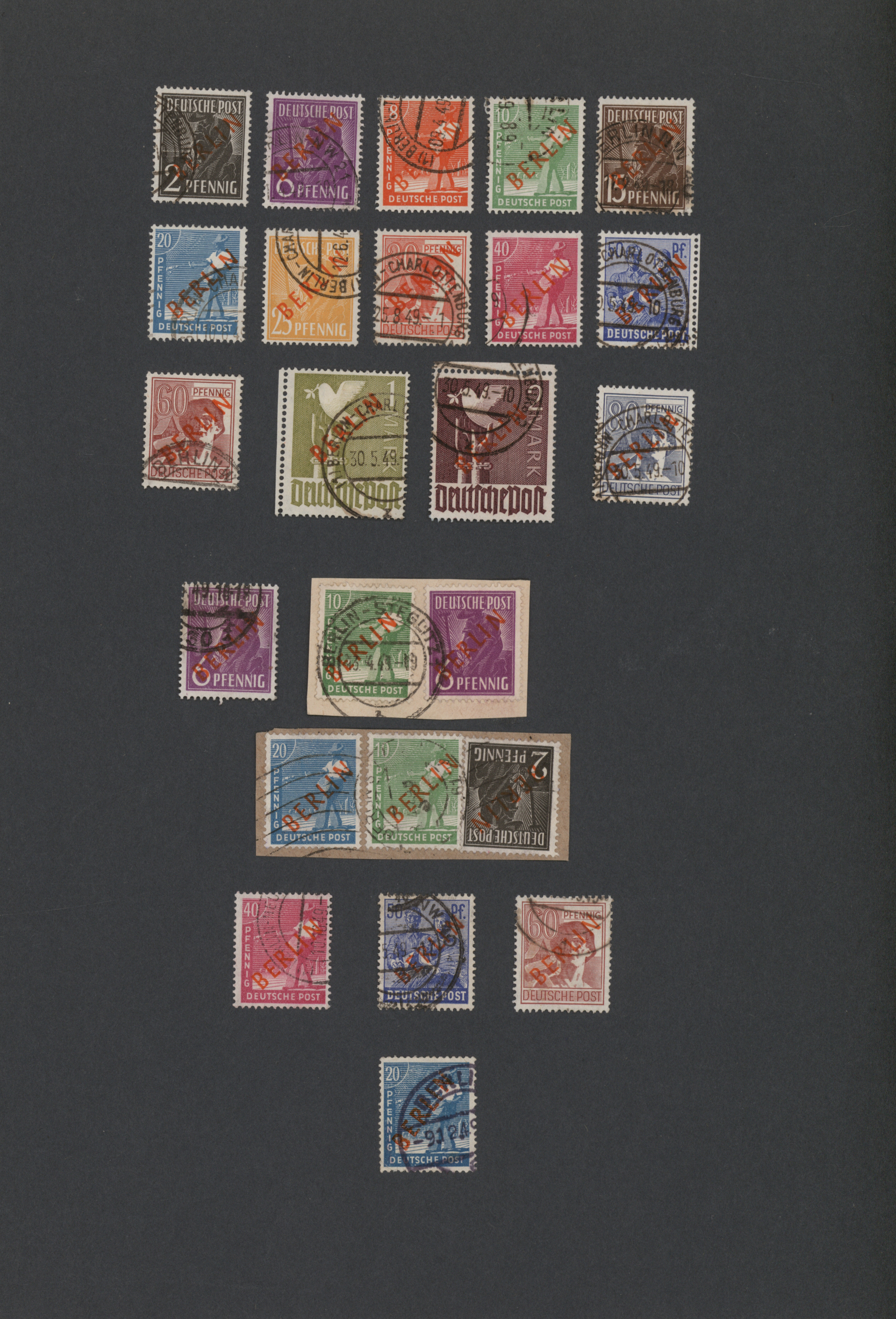 u.a. gutem Teil SBZ Bären-Ausgabe, Kontrollrats-Ausgaben als Berlin-Vorläufer (u.a. zwei komplette Serien Ziffern je gest. "BERLIN-TEGEL"), reguläre Ausgaben mit besseren Frankaturen wie Glocken, Lortzing, aber auch ein Oberrandstück 20 Pfg.