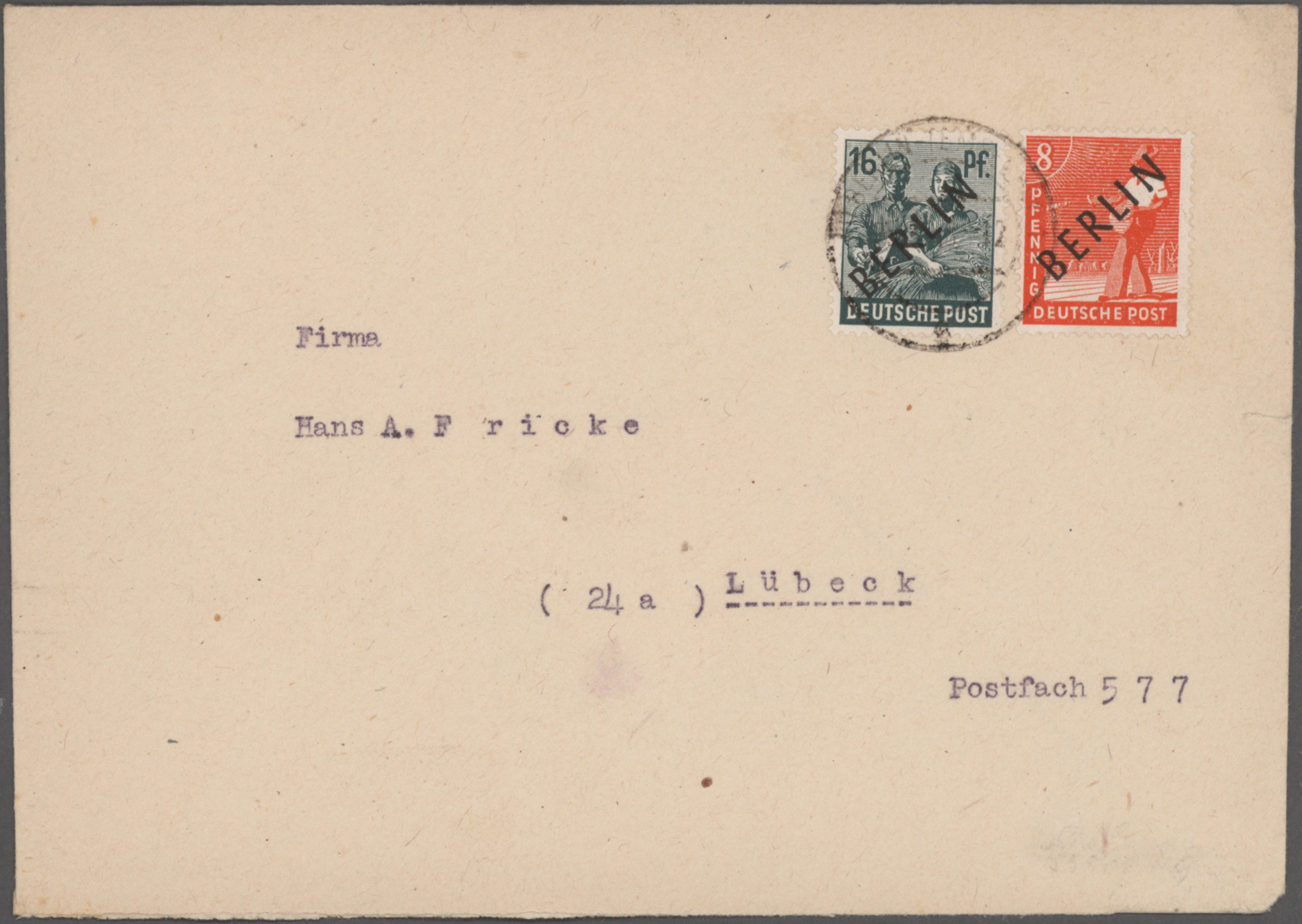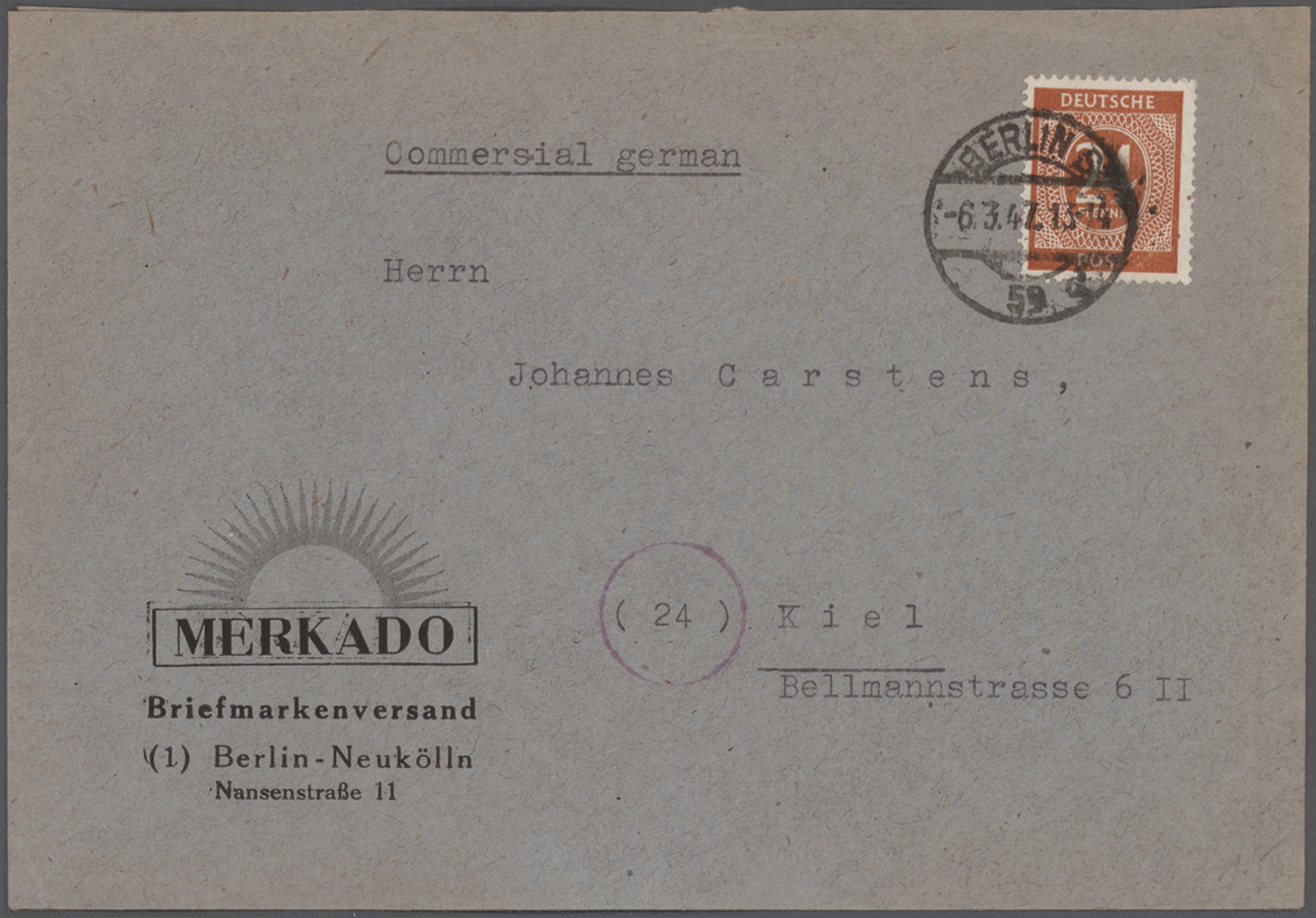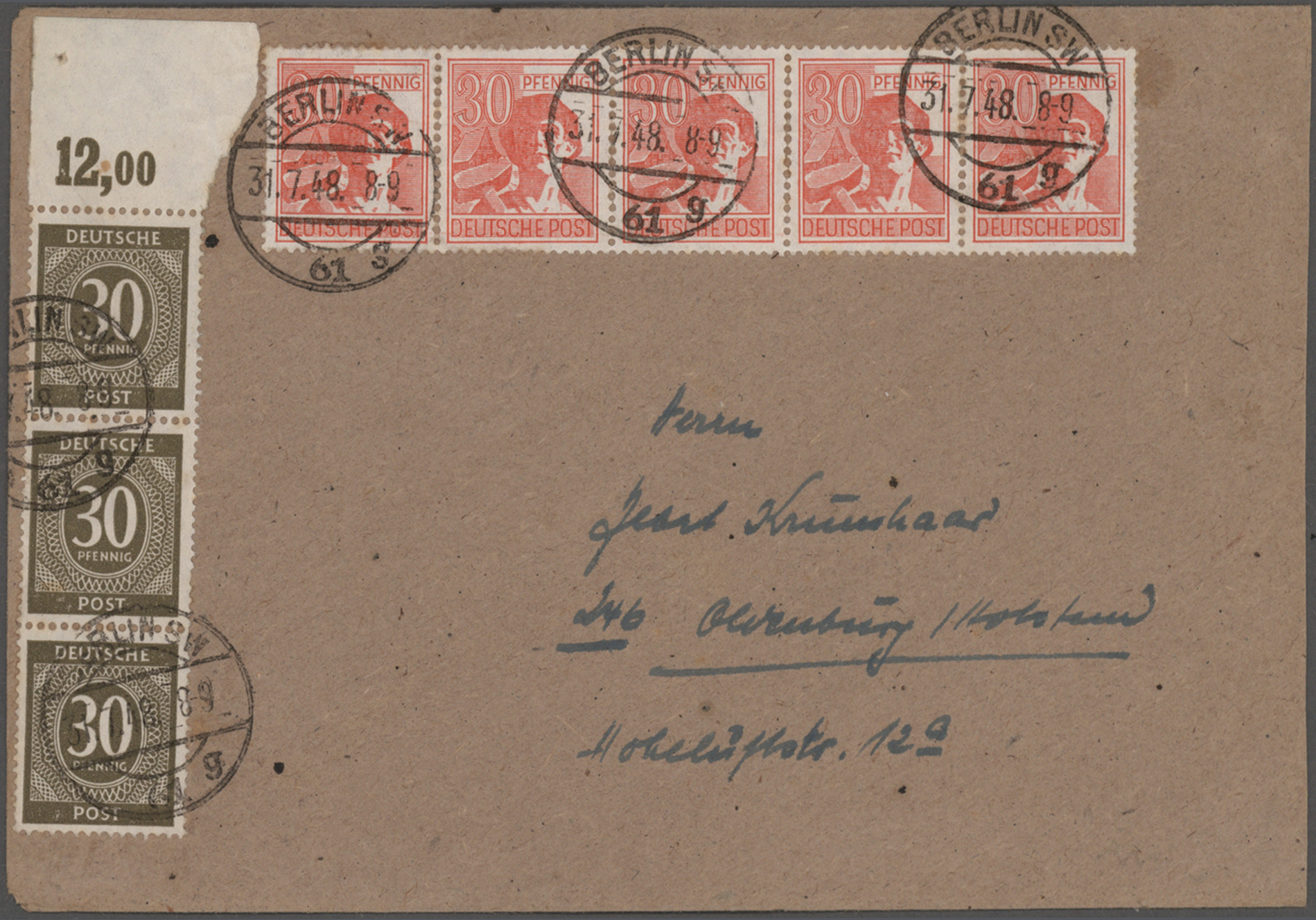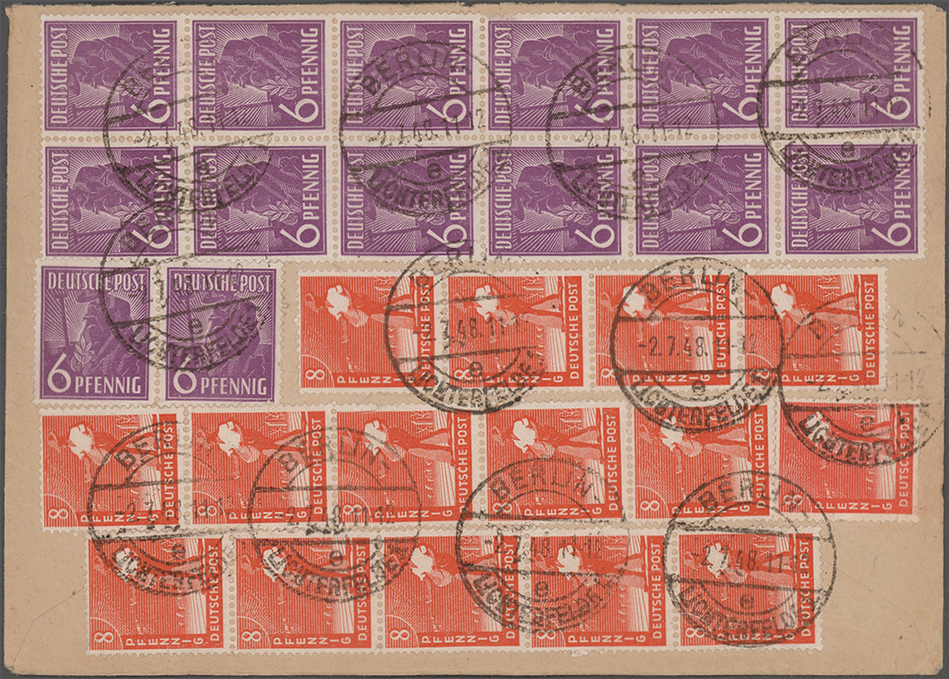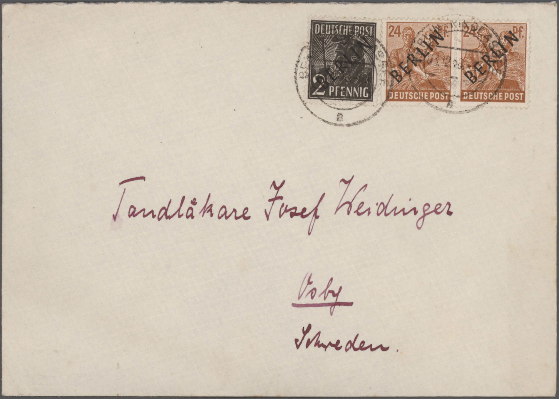 u.a. gutem Teil SBZ Bären-Ausgabe, Kontrollrats-Ausgaben als Berlin-Vorläufer (u.a. zwei komplette Serien Ziffern je gest. "BERLIN-TEGEL"), reguläre Ausgaben mit besseren Frankaturen wie Glocken, Lortzing, aber auch ein Oberrandstück 20 Pfg.