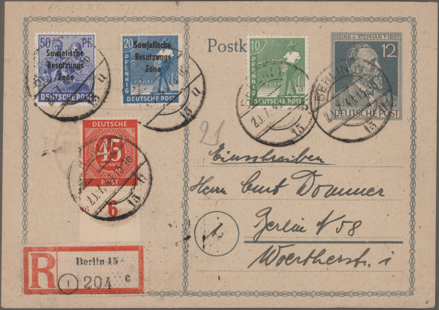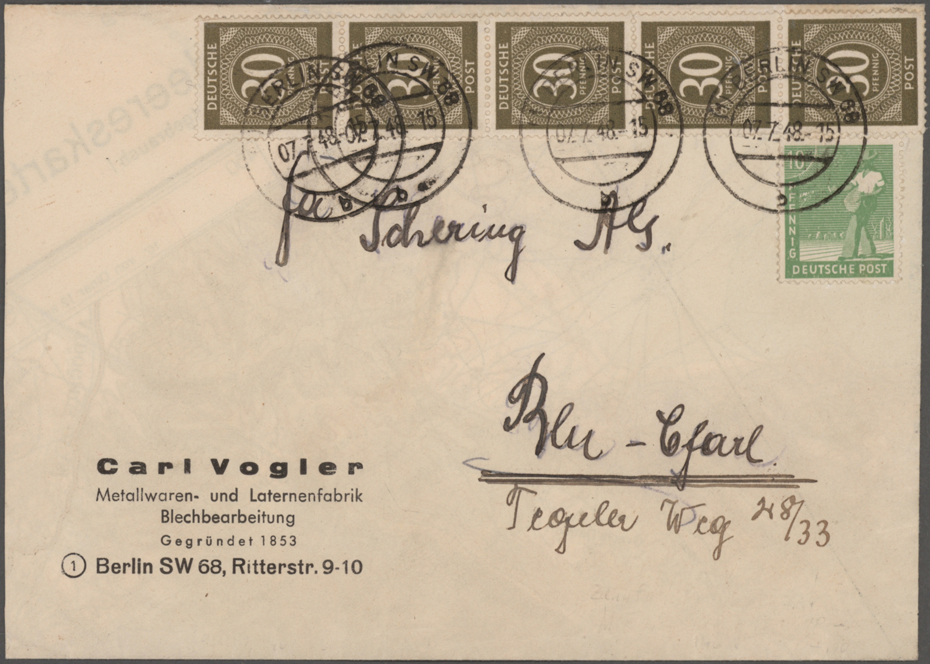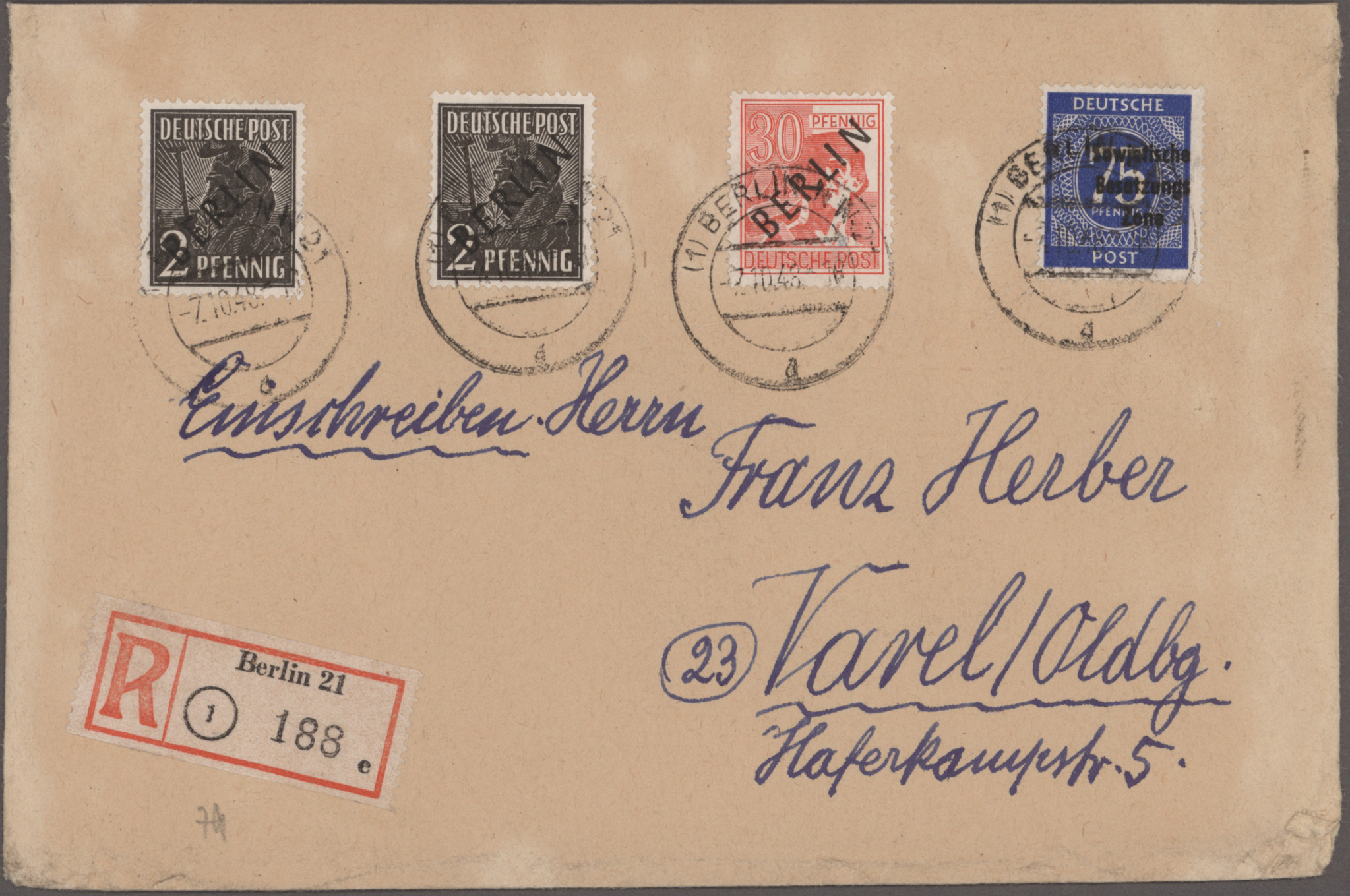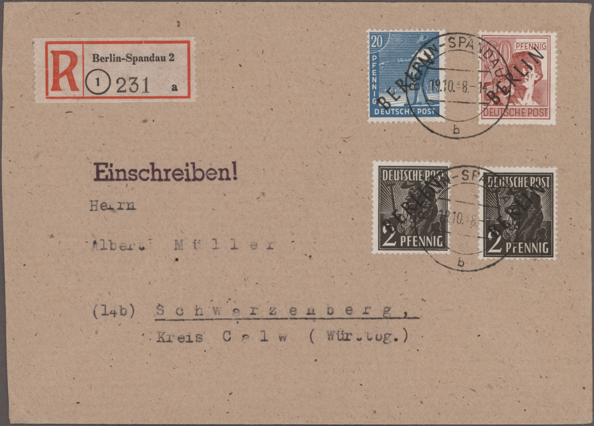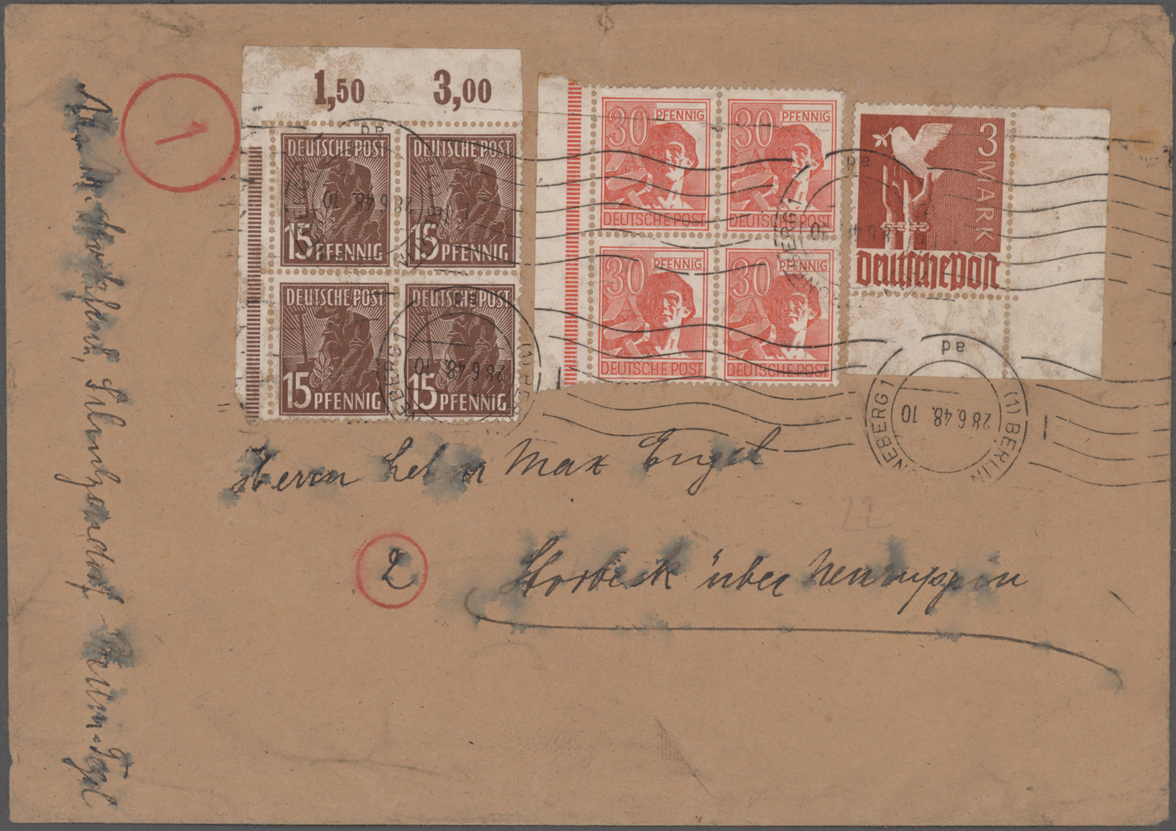 u.a. gutem Teil SBZ Bären-Ausgabe, Kontrollrats-Ausgaben als Berlin-Vorläufer (u.a. zwei komplette Serien Ziffern je gest. "BERLIN-TEGEL"), reguläre Ausgaben mit besseren Frankaturen wie Glocken, Lortzing, aber auch ein Oberrandstück 20 Pfg.
