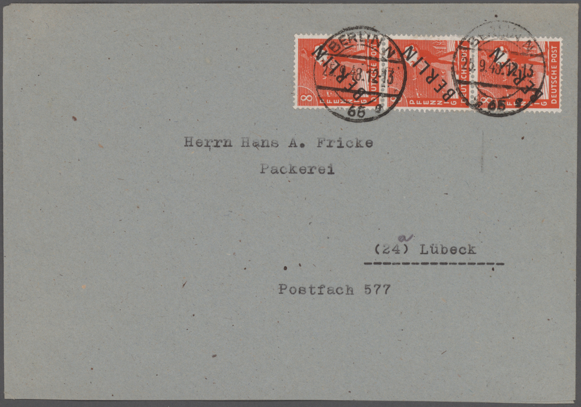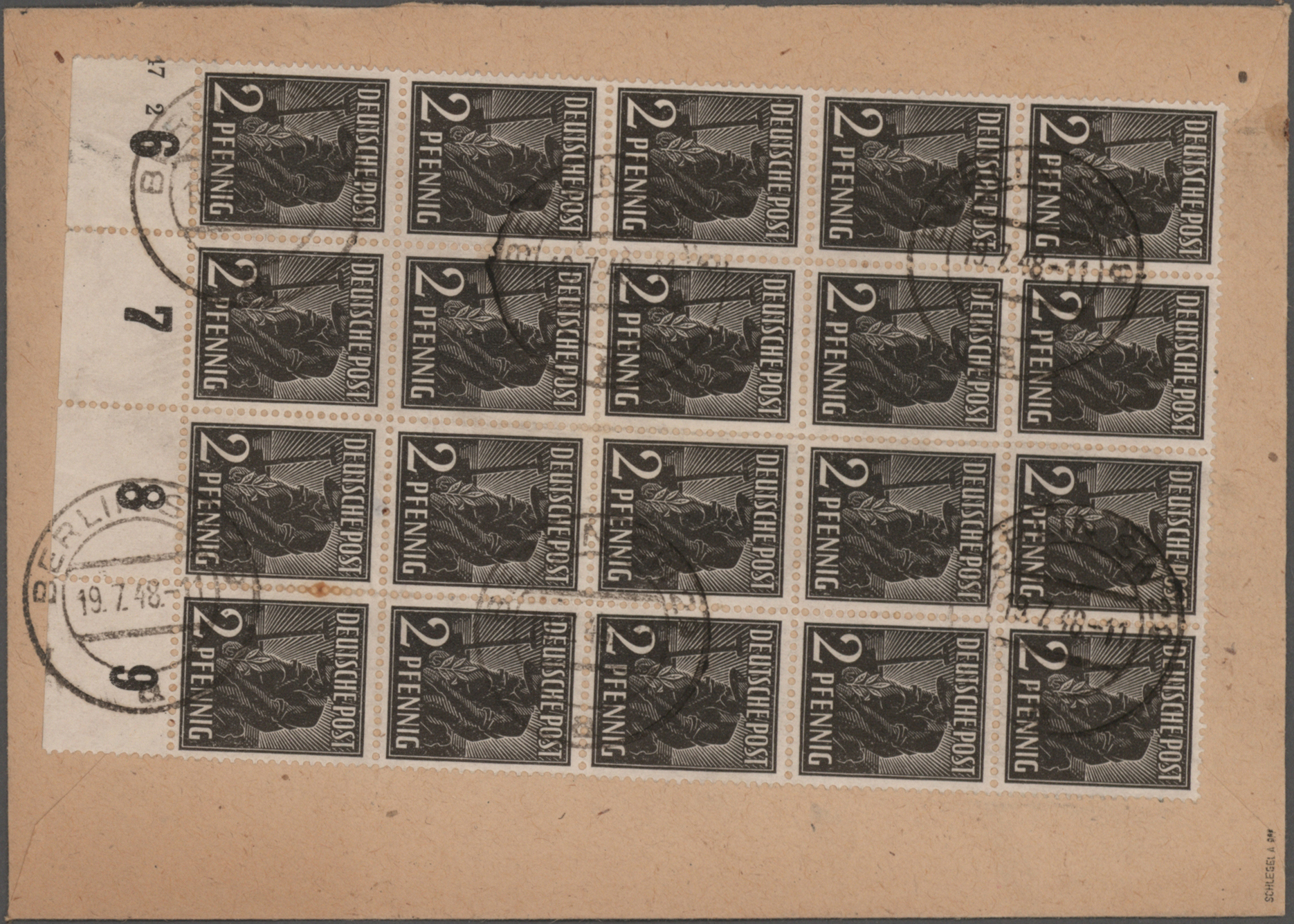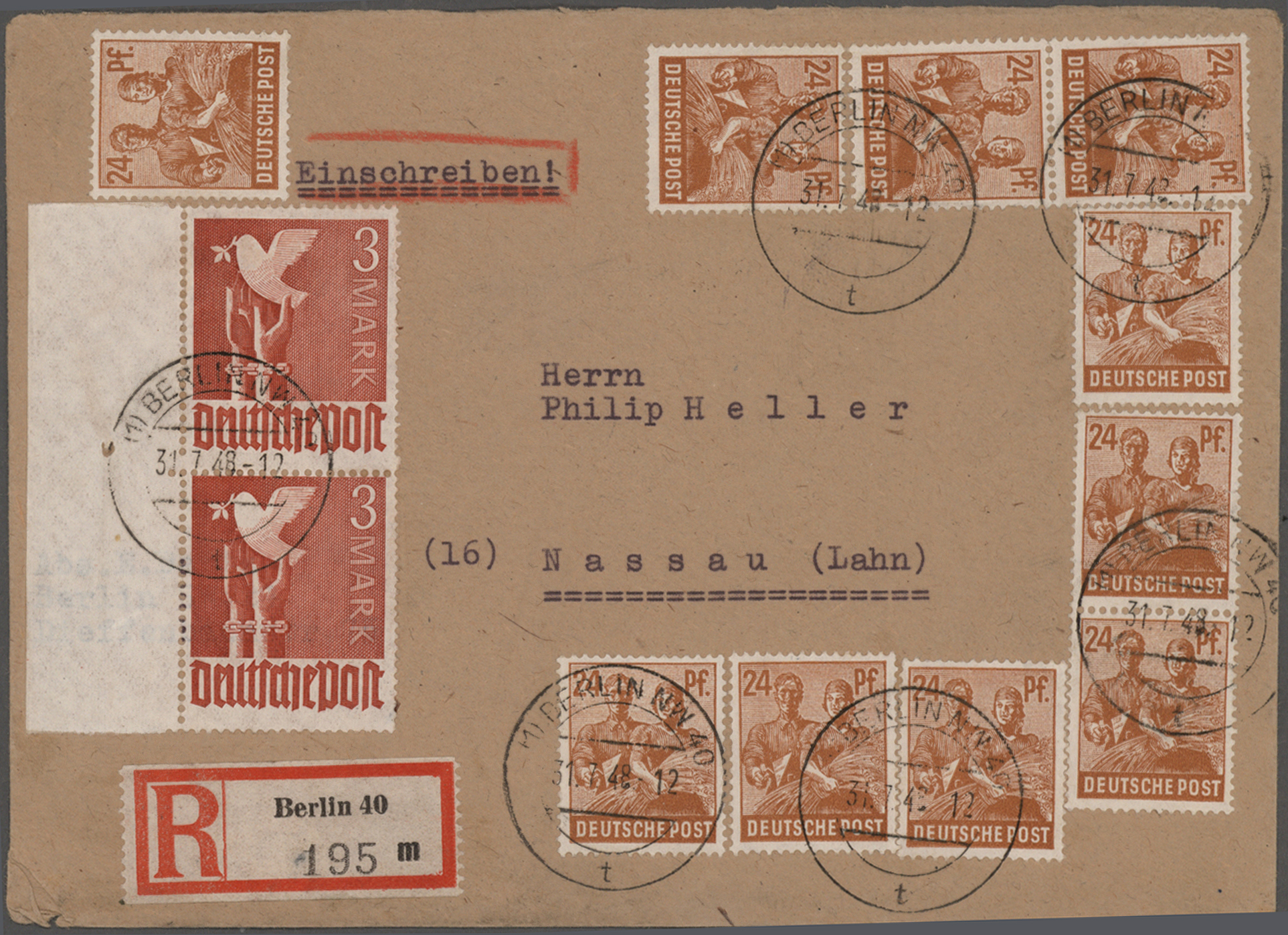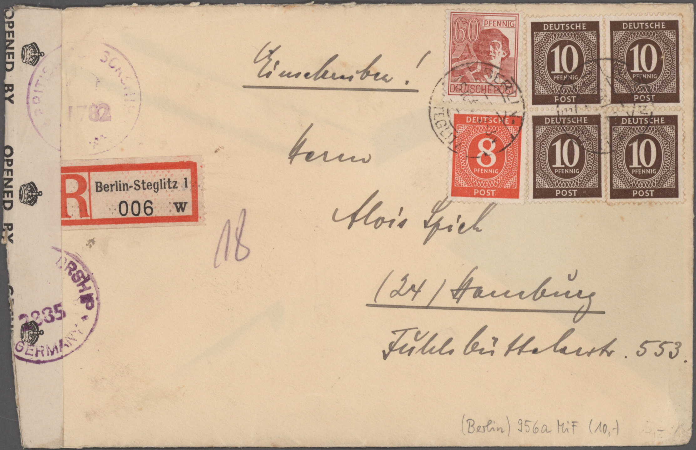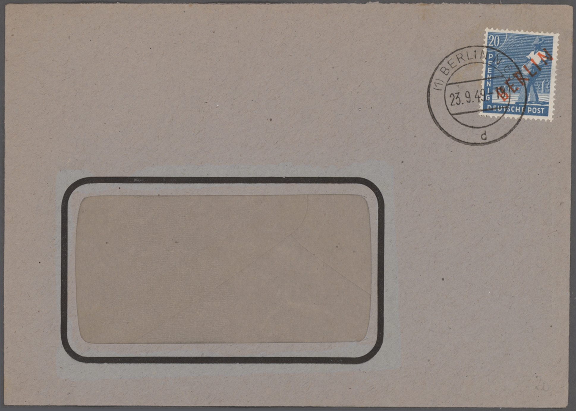 u.a. gutem Teil SBZ Bären-Ausgabe, Kontrollrats-Ausgaben als Berlin-Vorläufer (u.a. zwei komplette Serien Ziffern je gest. "BERLIN-TEGEL"), reguläre Ausgaben mit besseren Frankaturen wie Glocken, Lortzing, aber auch ein Oberrandstück 20 Pfg.