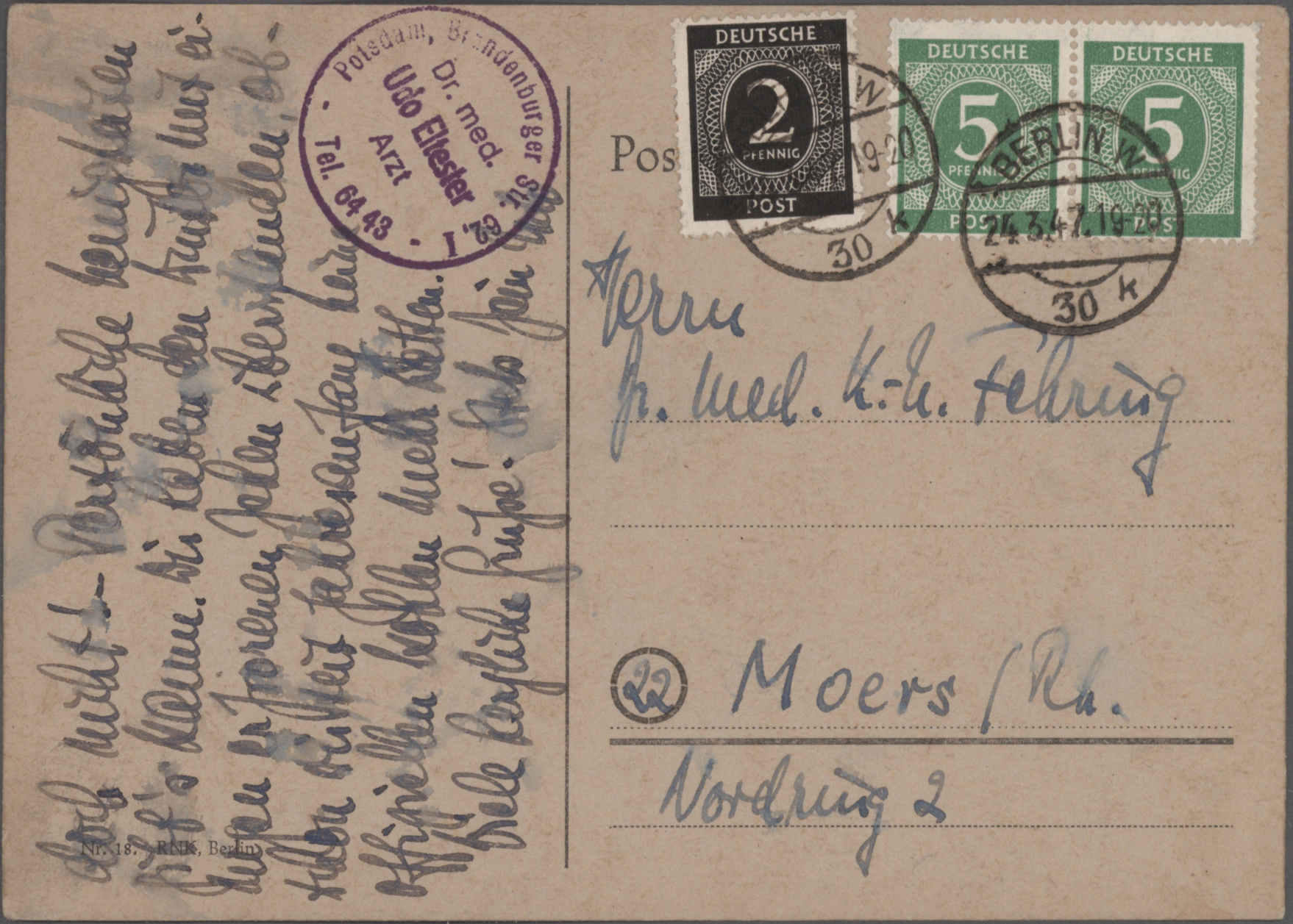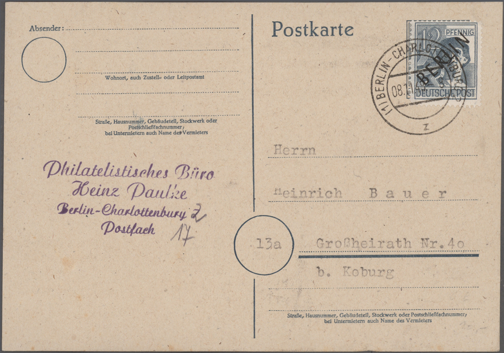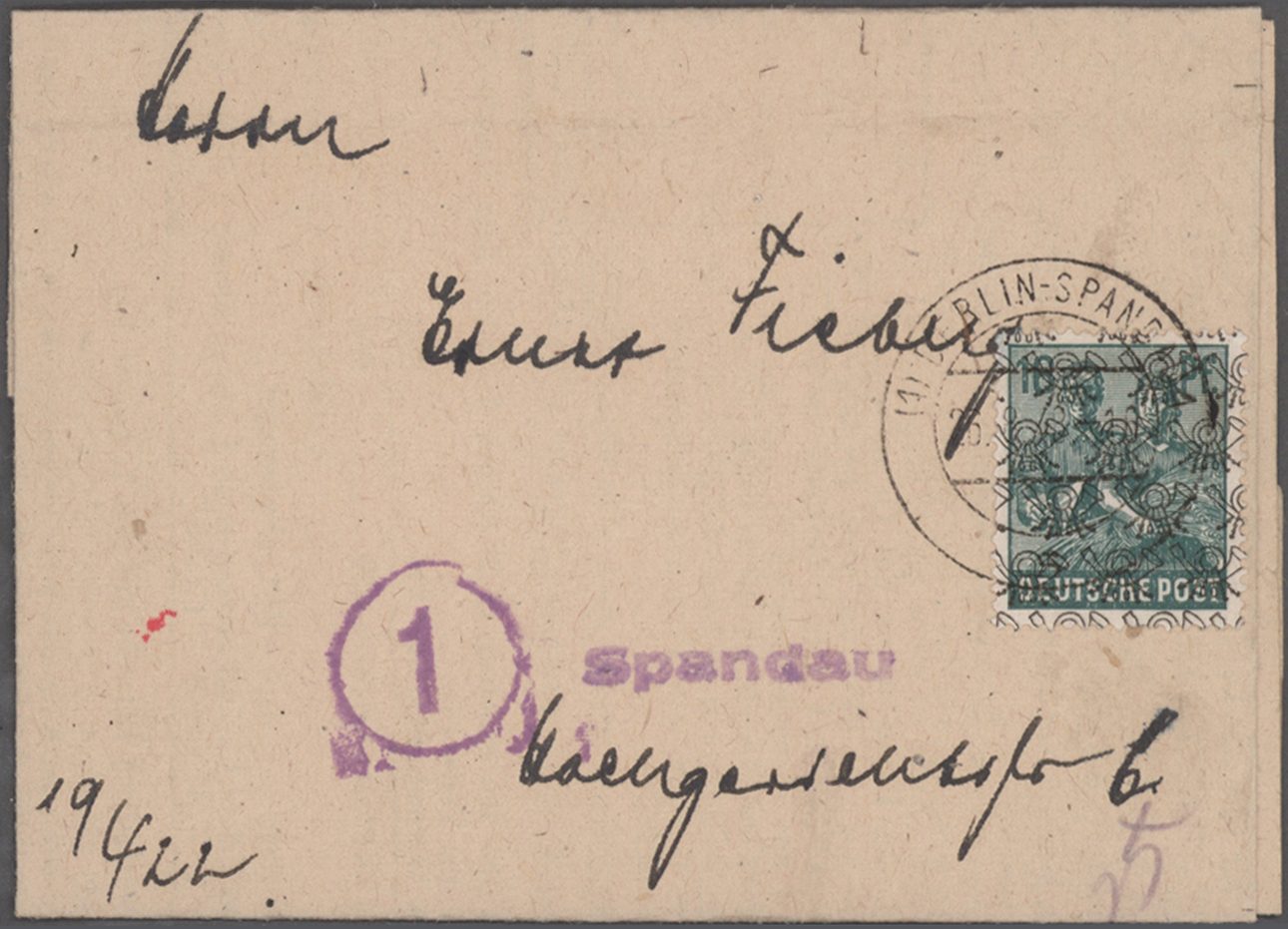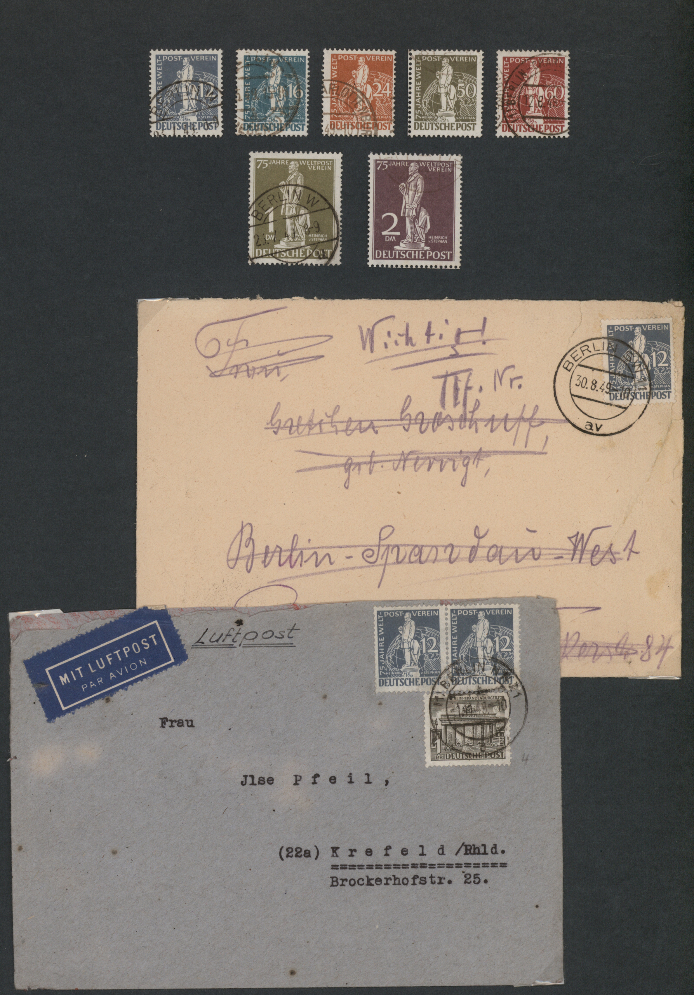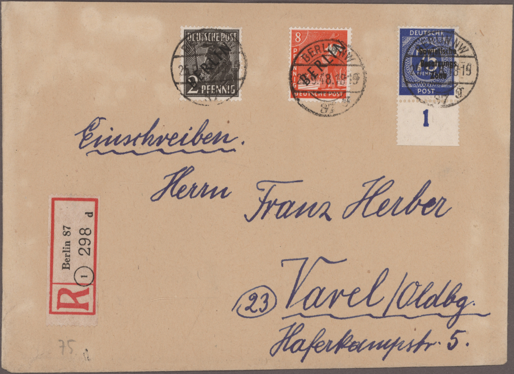 u.a. gutem Teil SBZ Bären-Ausgabe, Kontrollrats-Ausgaben als Berlin-Vorläufer (u.a. zwei komplette Serien Ziffern je gest. "BERLIN-TEGEL"), reguläre Ausgaben mit besseren Frankaturen wie Glocken, Lortzing, aber auch ein Oberrandstück 20 Pfg.