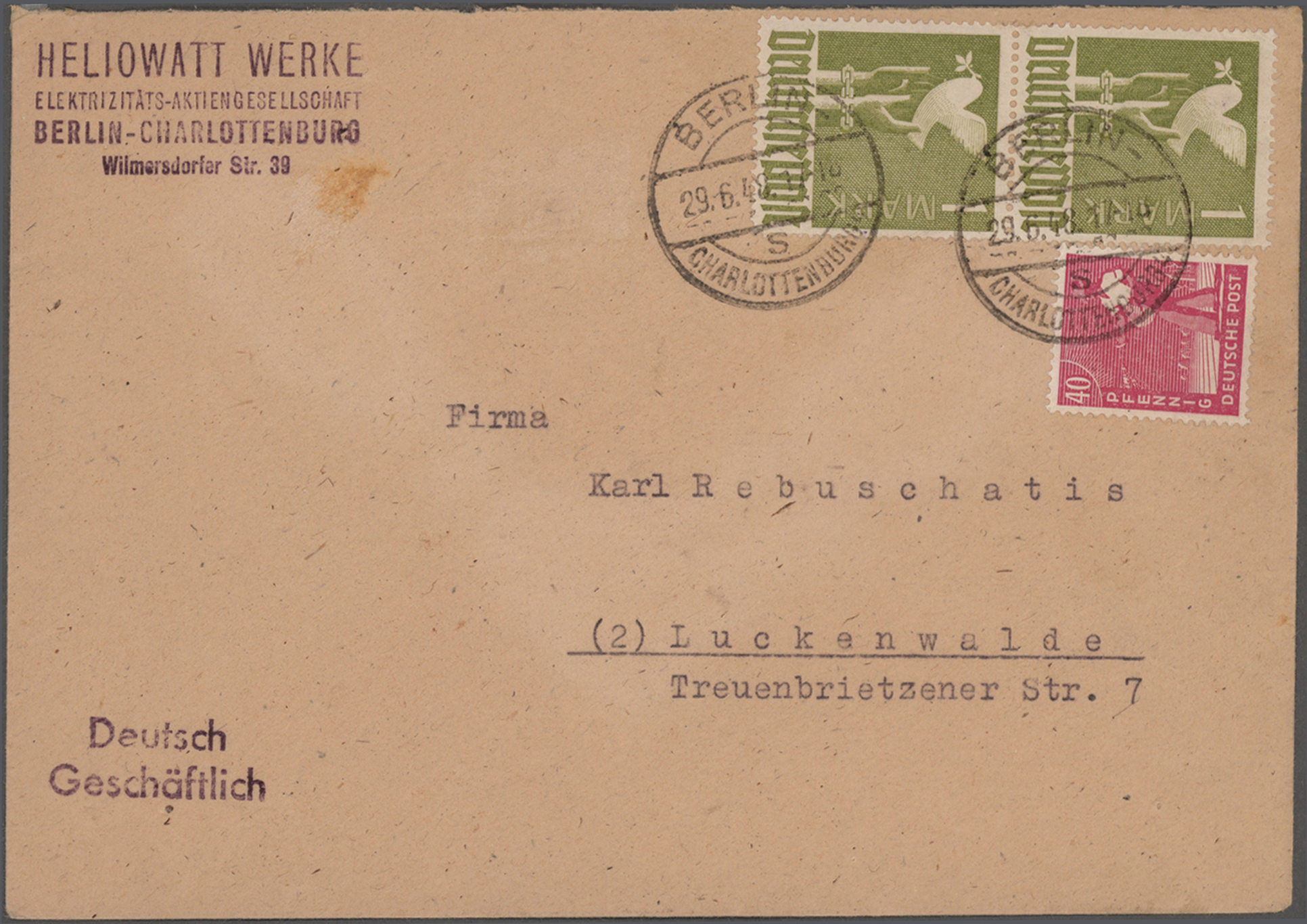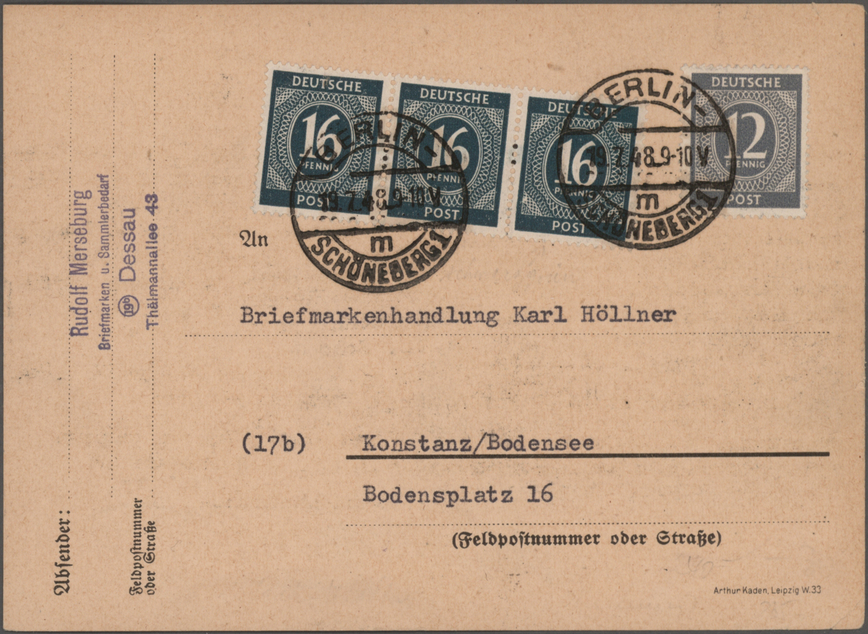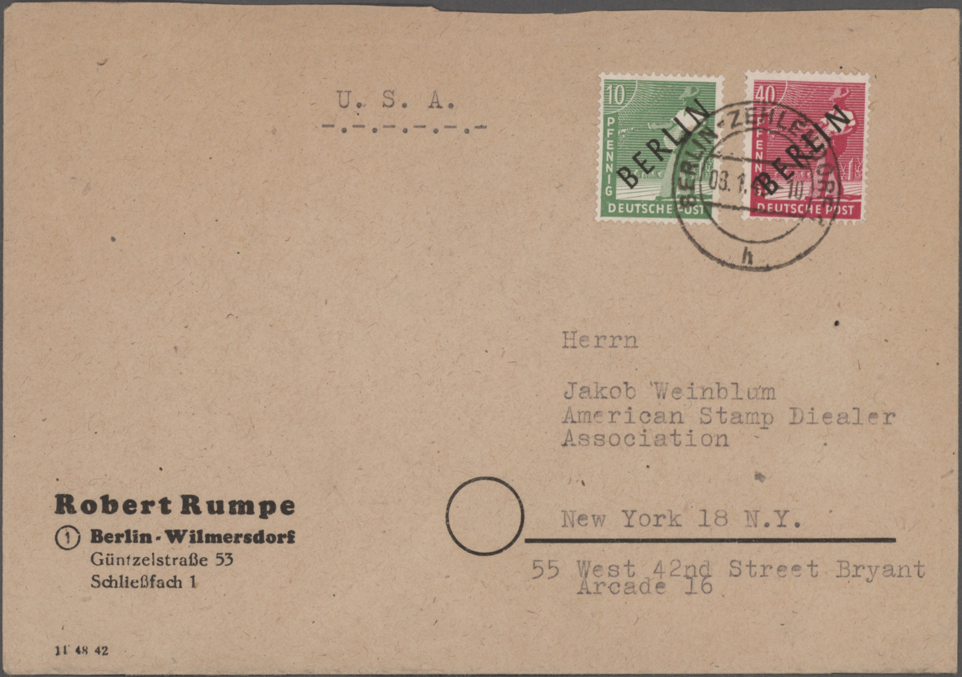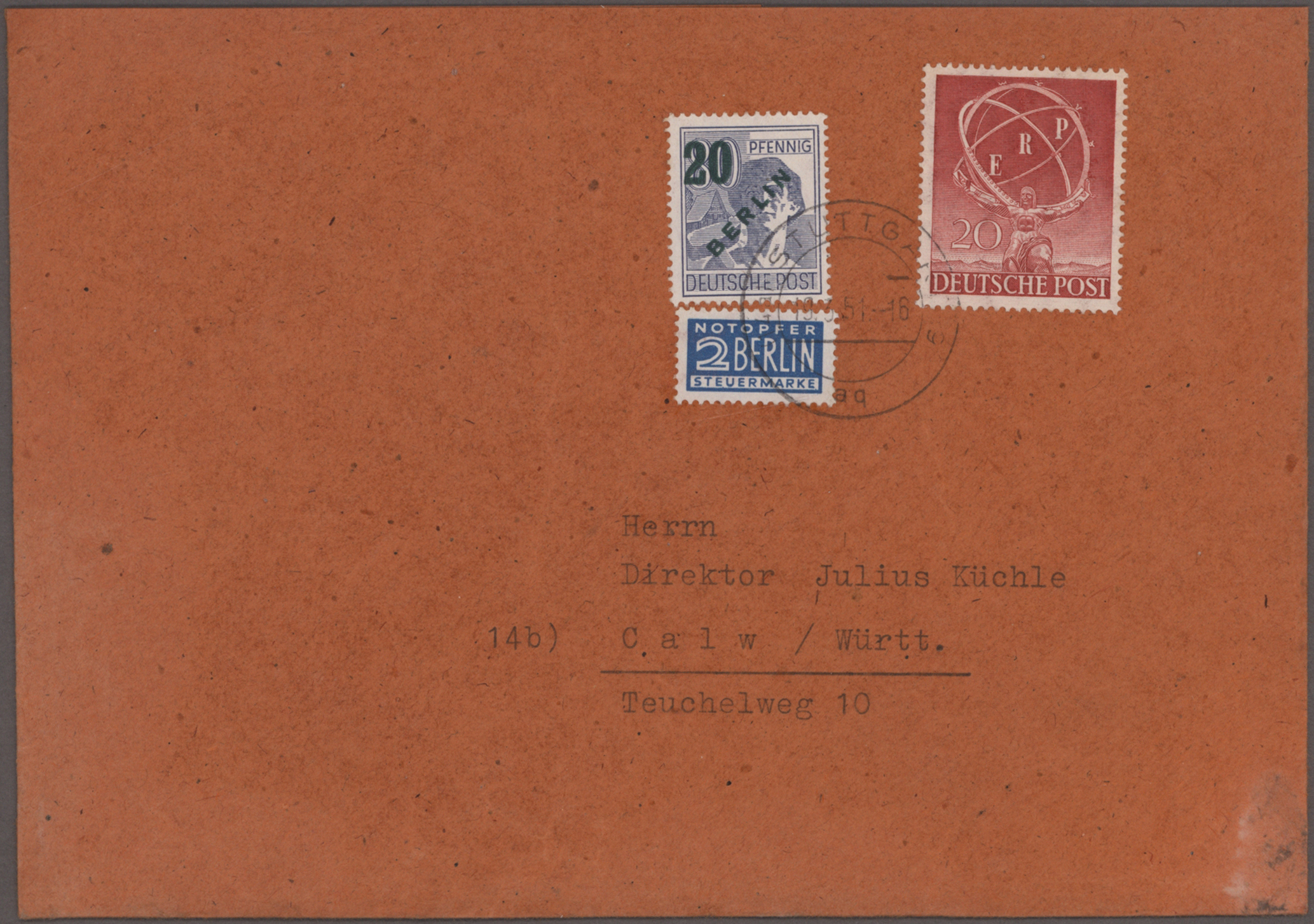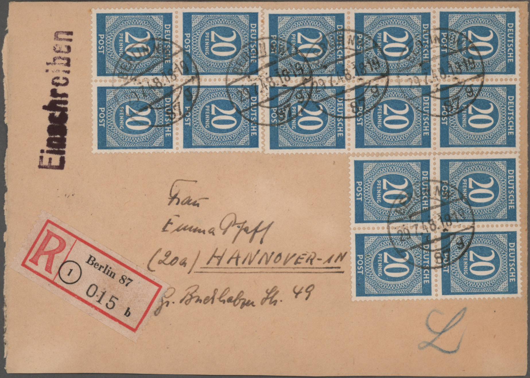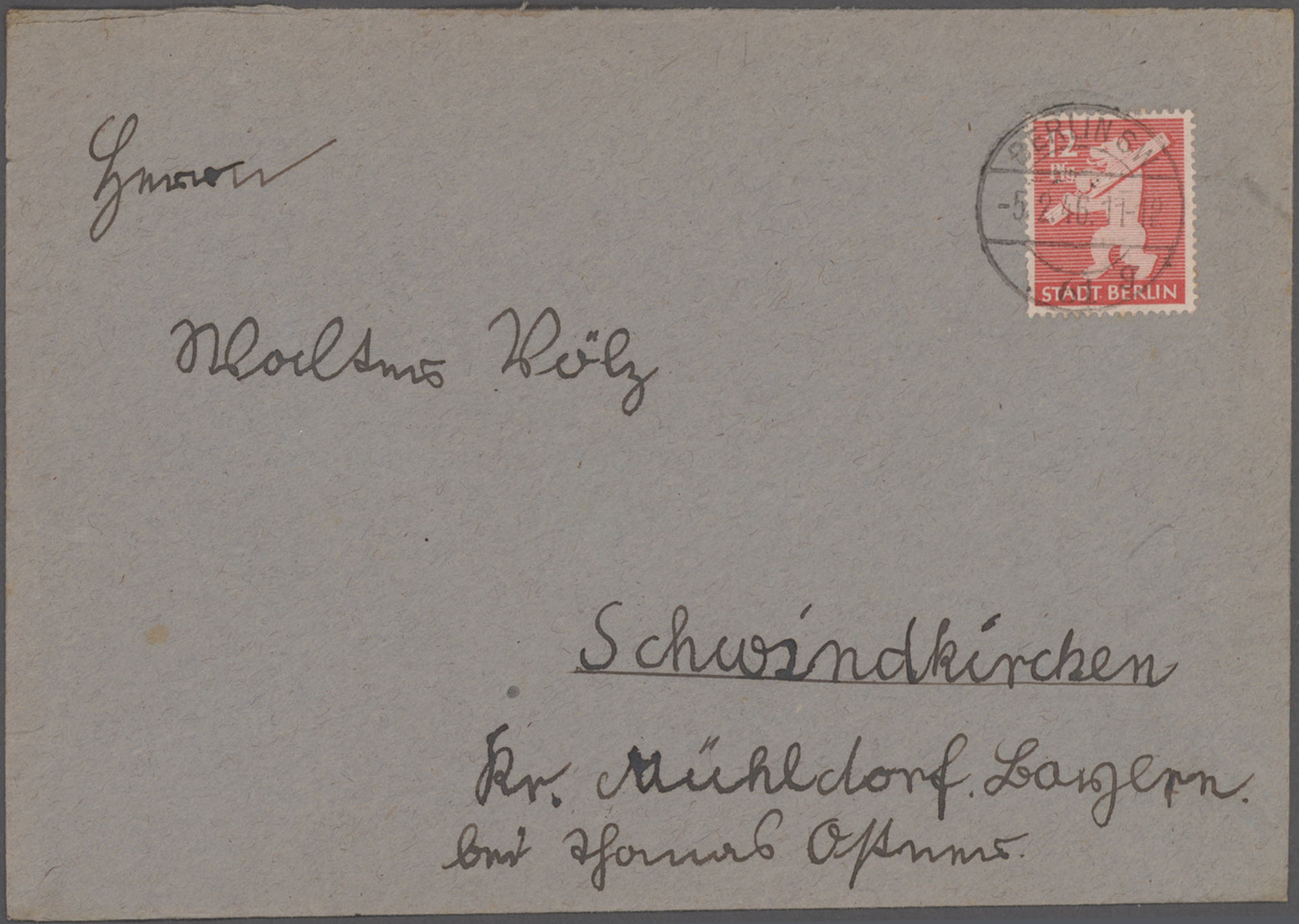 u.a. gutem Teil SBZ Bären-Ausgabe, Kontrollrats-Ausgaben als Berlin-Vorläufer (u.a. zwei komplette Serien Ziffern je gest. "BERLIN-TEGEL"), reguläre Ausgaben mit besseren Frankaturen wie Glocken, Lortzing, aber auch ein Oberrandstück 20 Pfg.