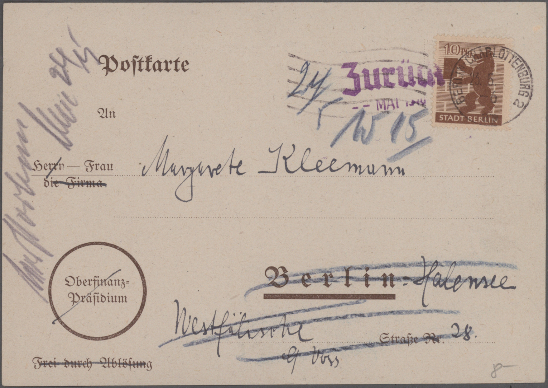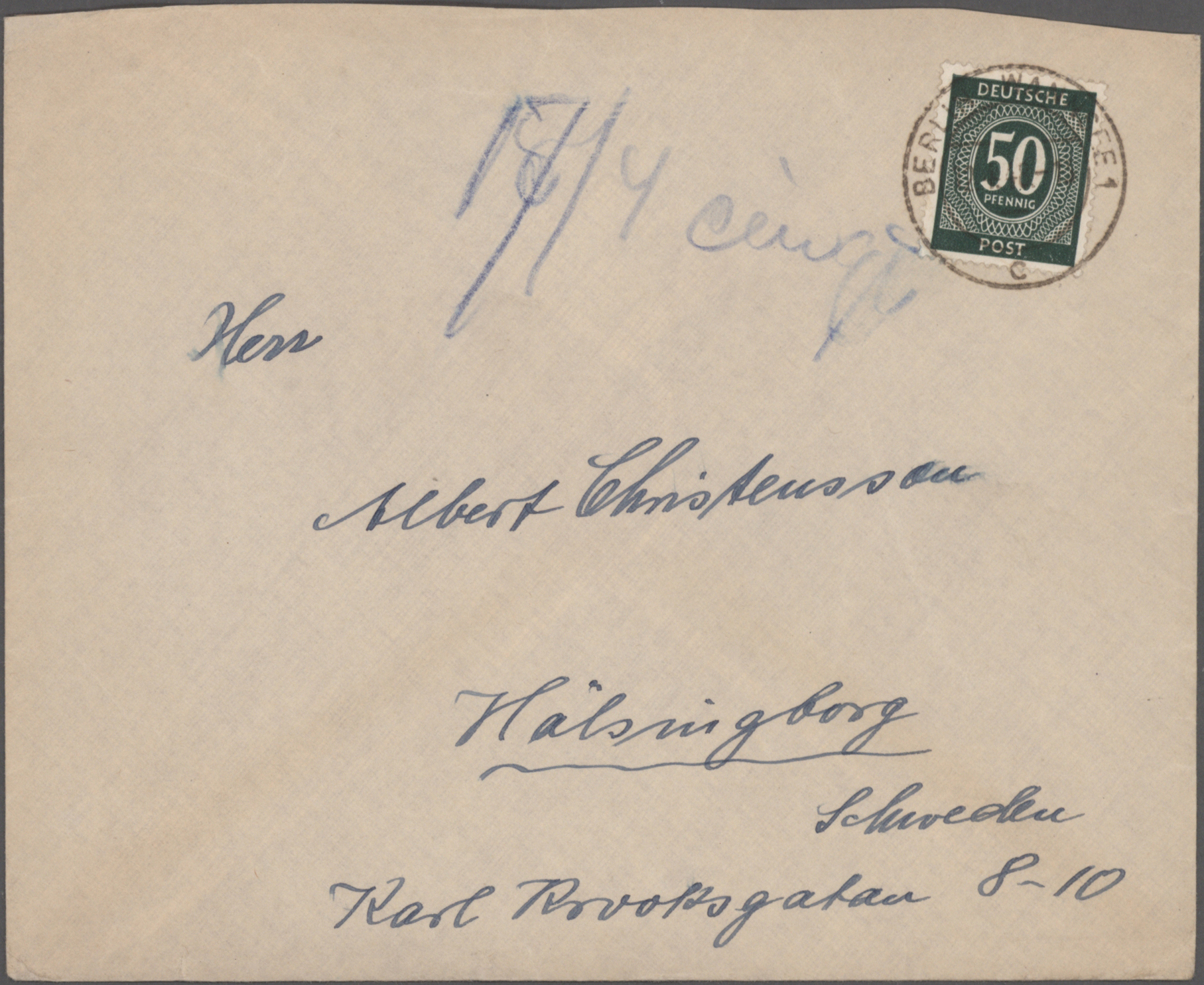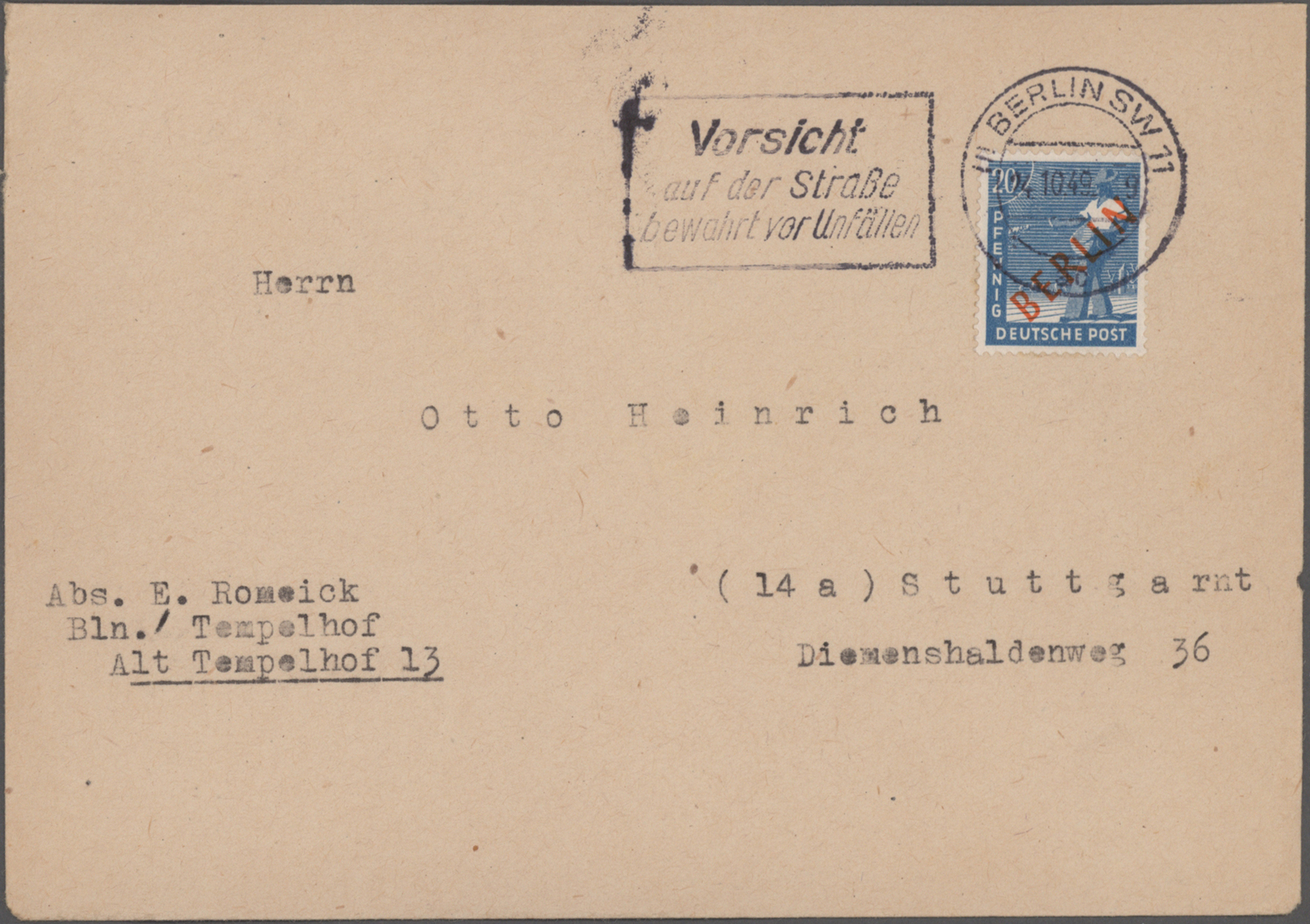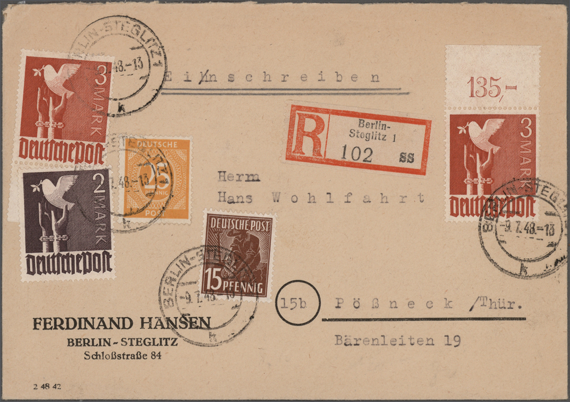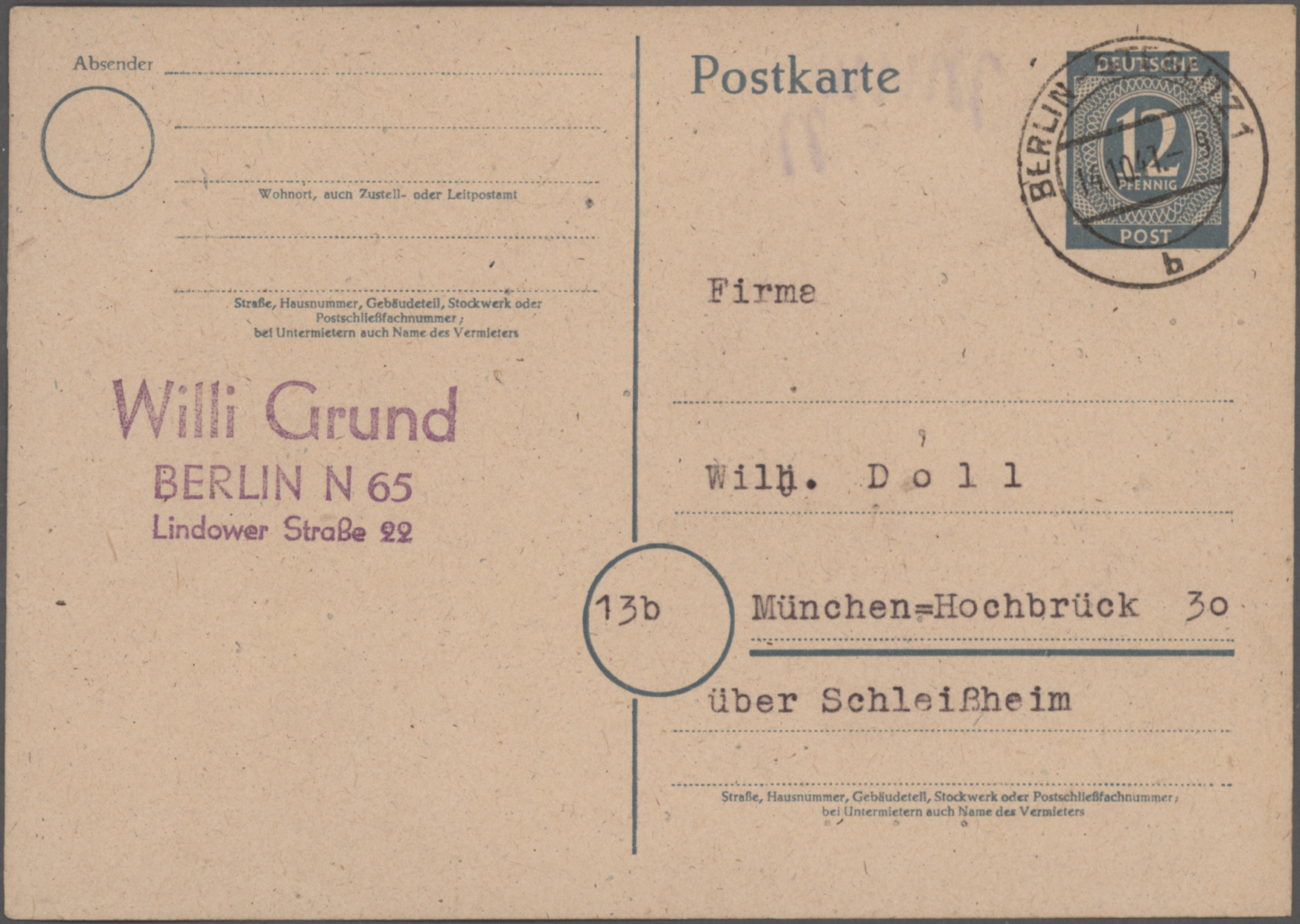u.a. gutem Teil SBZ Bären-Ausgabe, Kontrollrats-Ausgaben als Berlin-Vorläufer (u.a. zwei komplette Serien Ziffern je gest. "BERLIN-TEGEL"), reguläre Ausgaben mit besseren Frankaturen wie Glocken, Lortzing, aber auch ein Oberrandstück 20 Pfg.