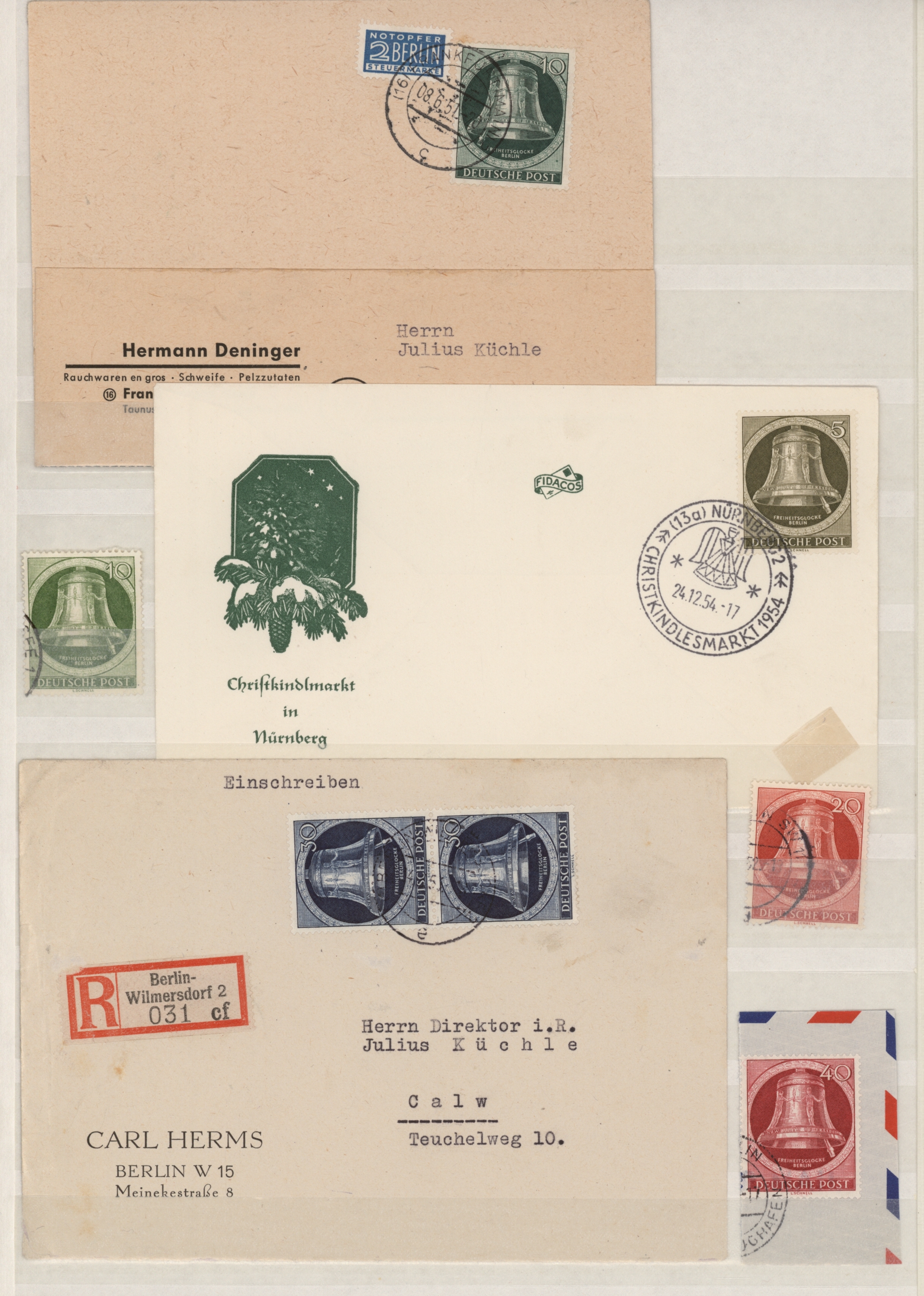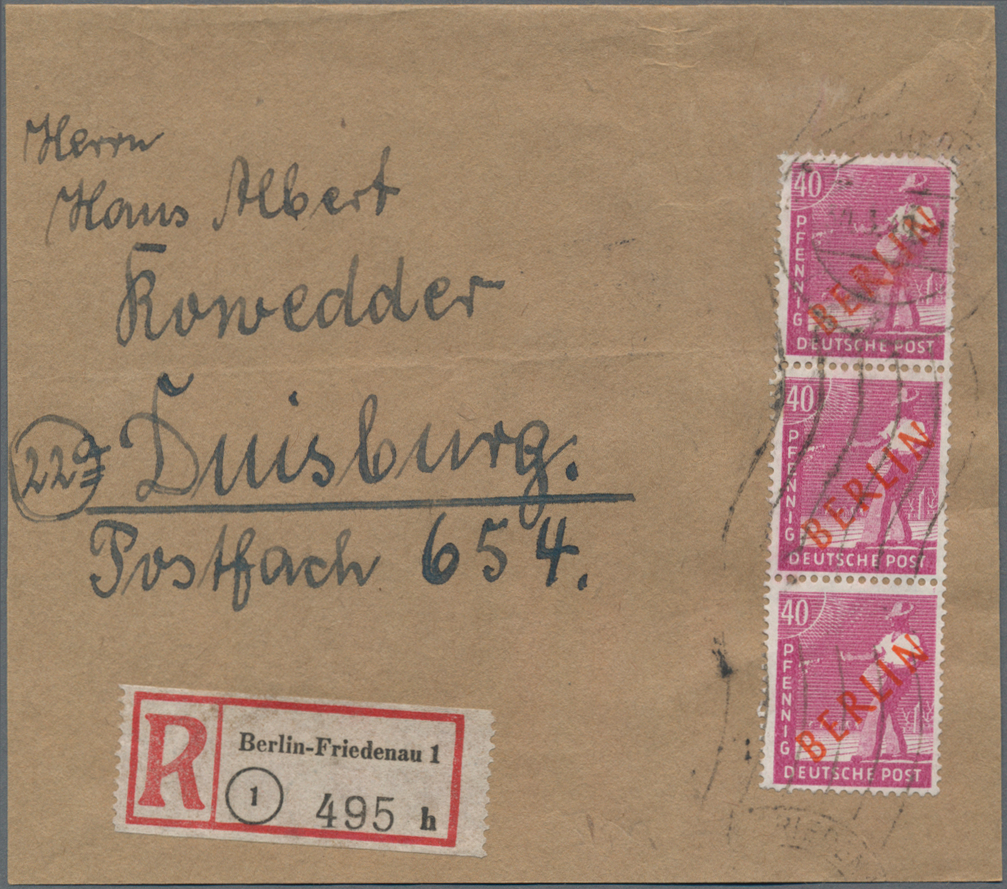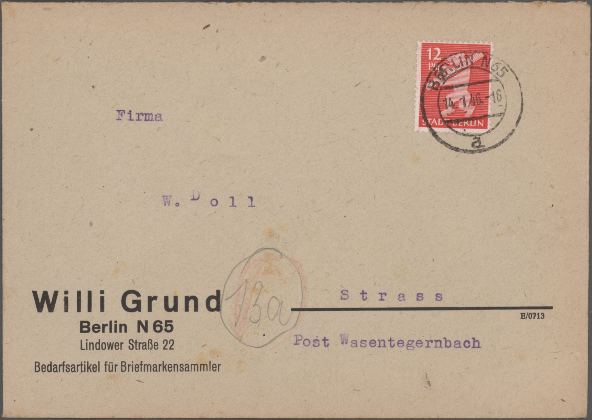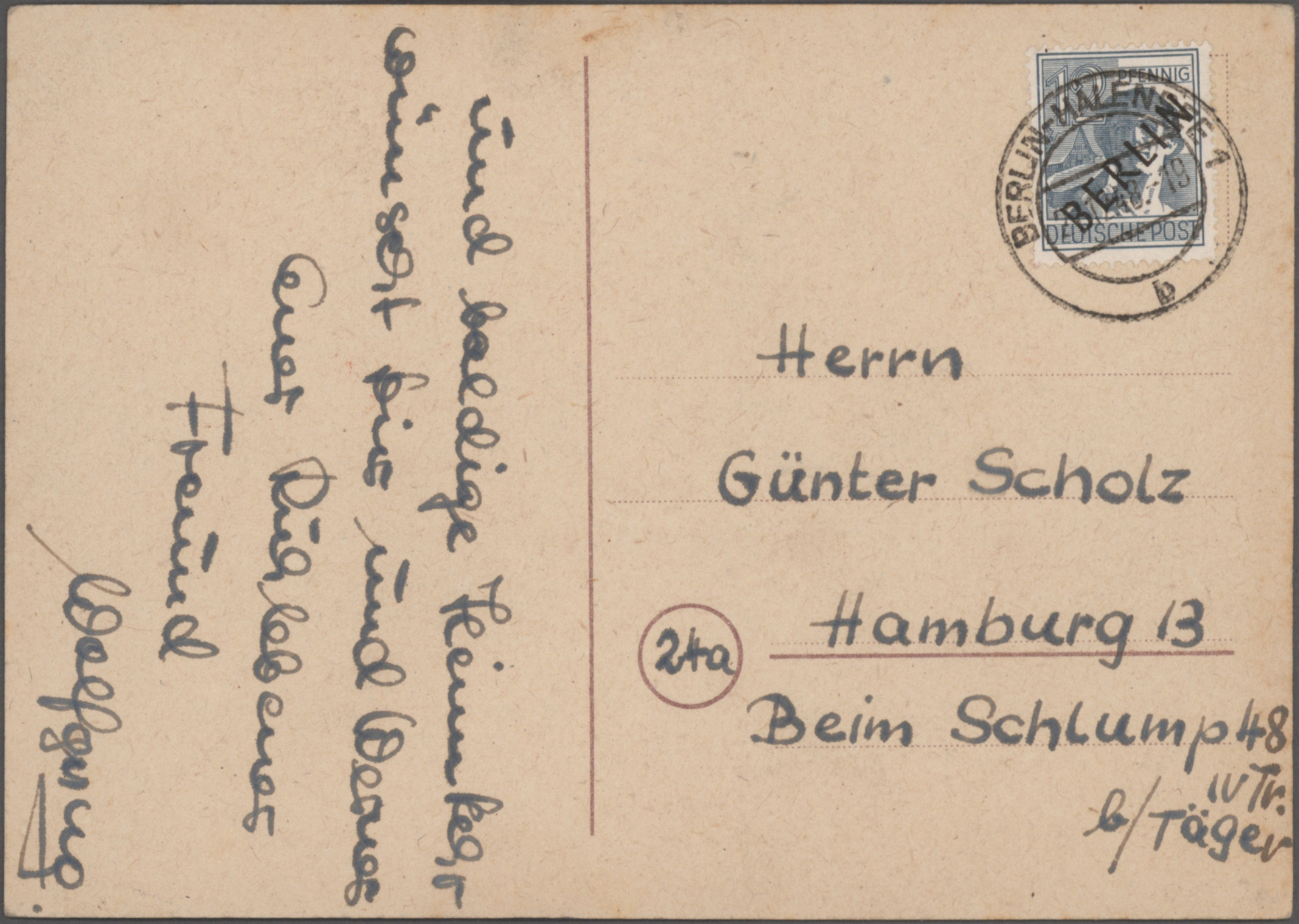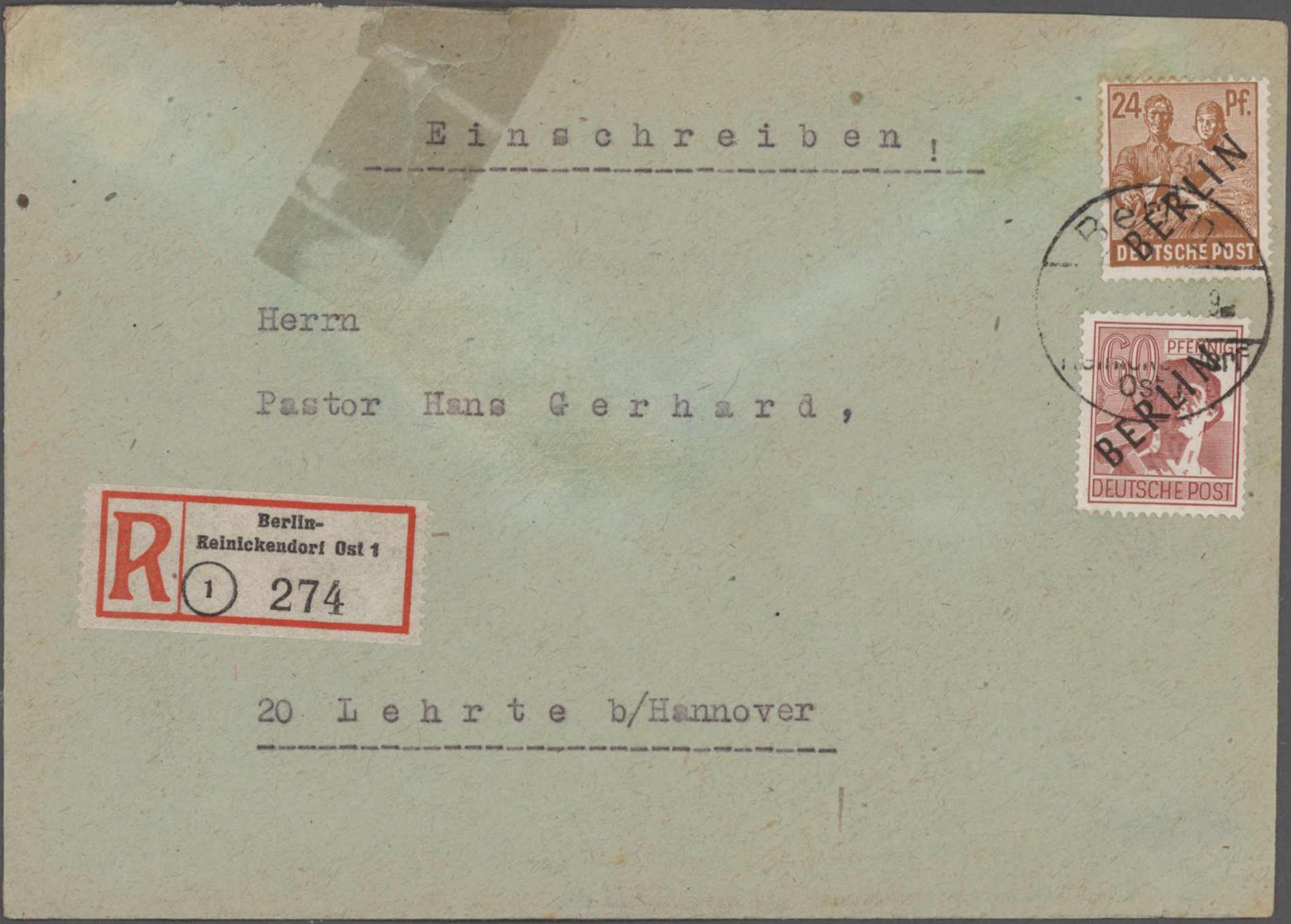 u.a. gutem Teil SBZ Bären-Ausgabe, Kontrollrats-Ausgaben als Berlin-Vorläufer (u.a. zwei komplette Serien Ziffern je gest. "BERLIN-TEGEL"), reguläre Ausgaben mit besseren Frankaturen wie Glocken, Lortzing, aber auch ein Oberrandstück 20 Pfg.
