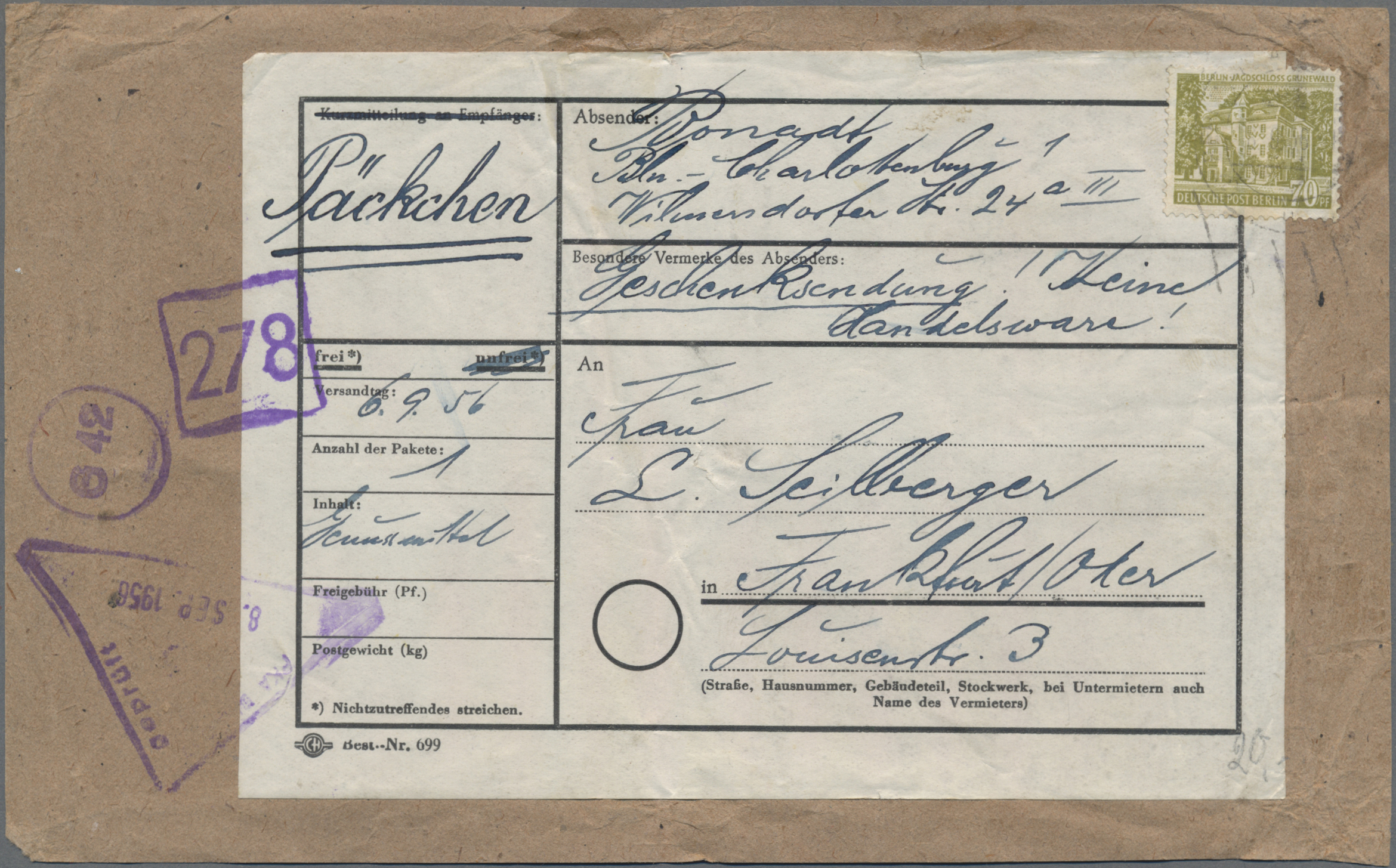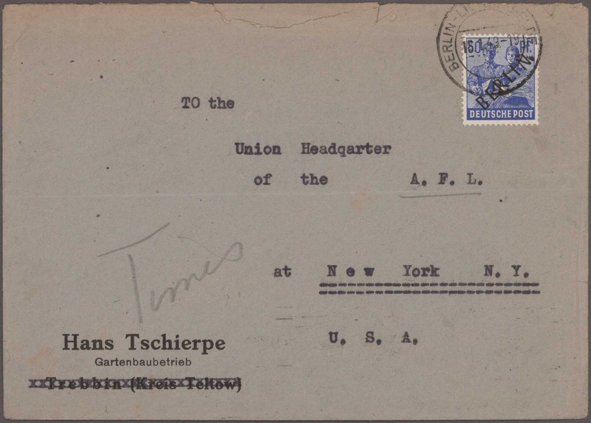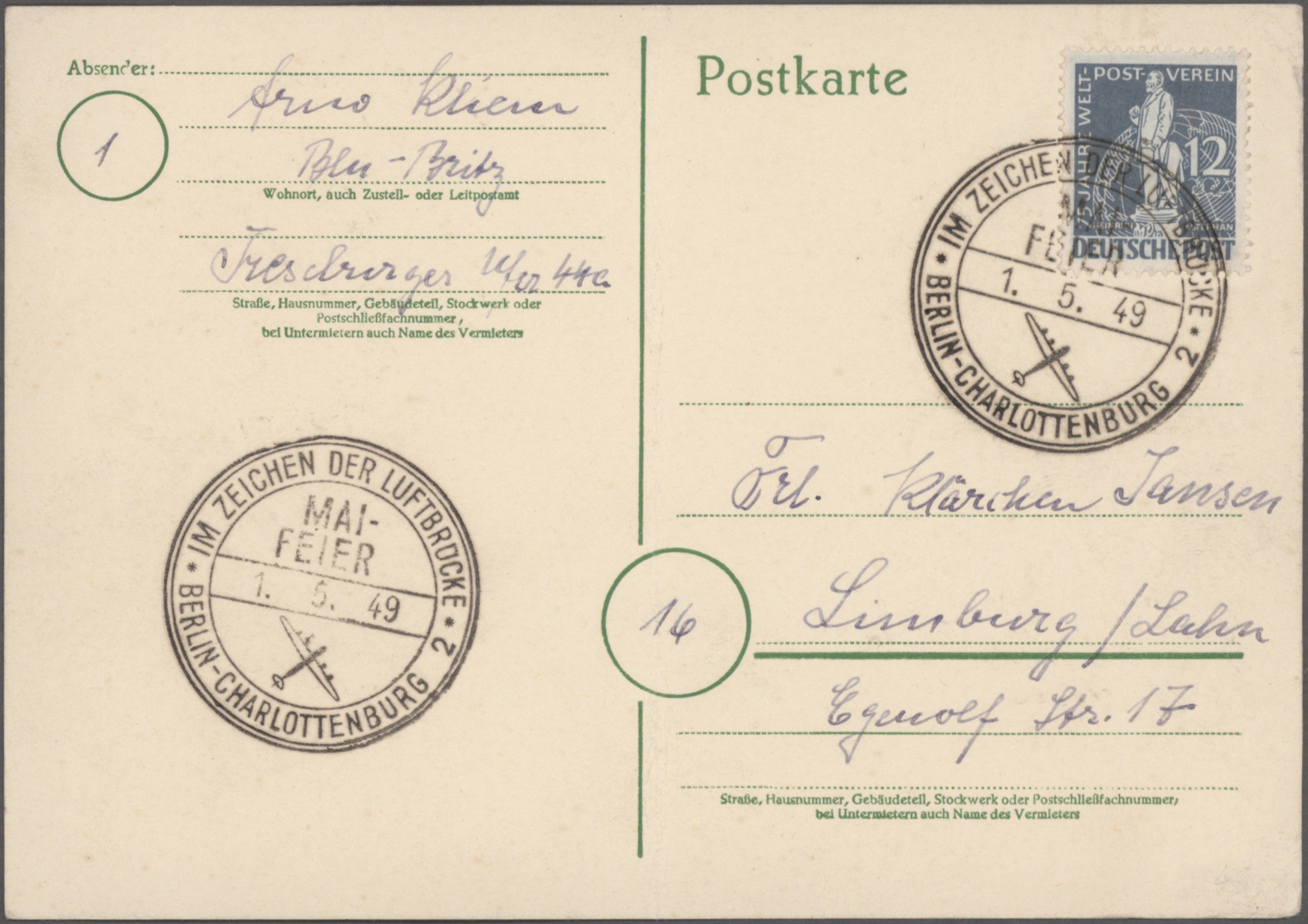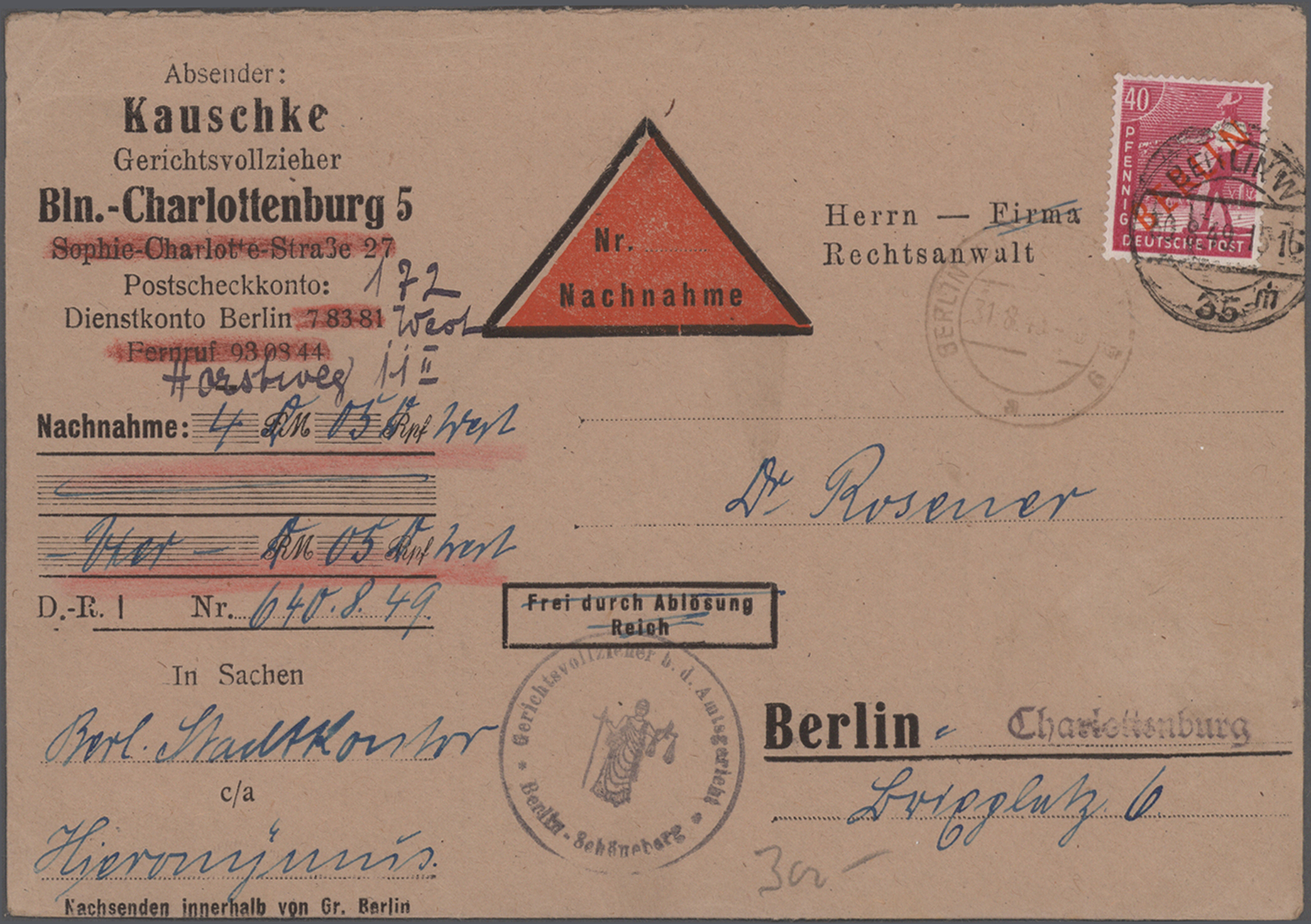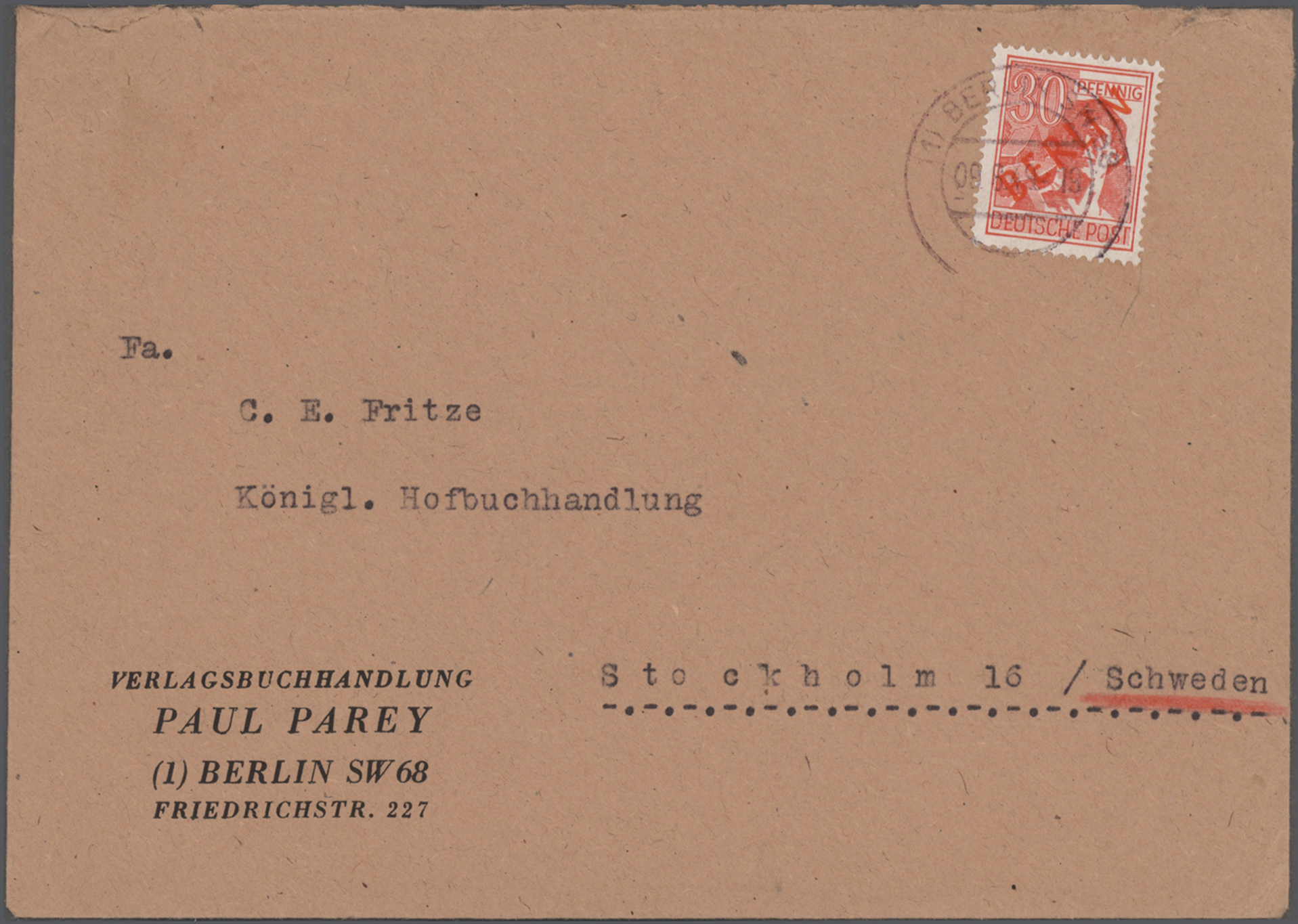 u.a. gutem Teil SBZ Bären-Ausgabe, Kontrollrats-Ausgaben als Berlin-Vorläufer (u.a. zwei komplette Serien Ziffern je gest. "BERLIN-TEGEL"), reguläre Ausgaben mit besseren Frankaturen wie Glocken, Lortzing, aber auch ein Oberrandstück 20 Pfg.