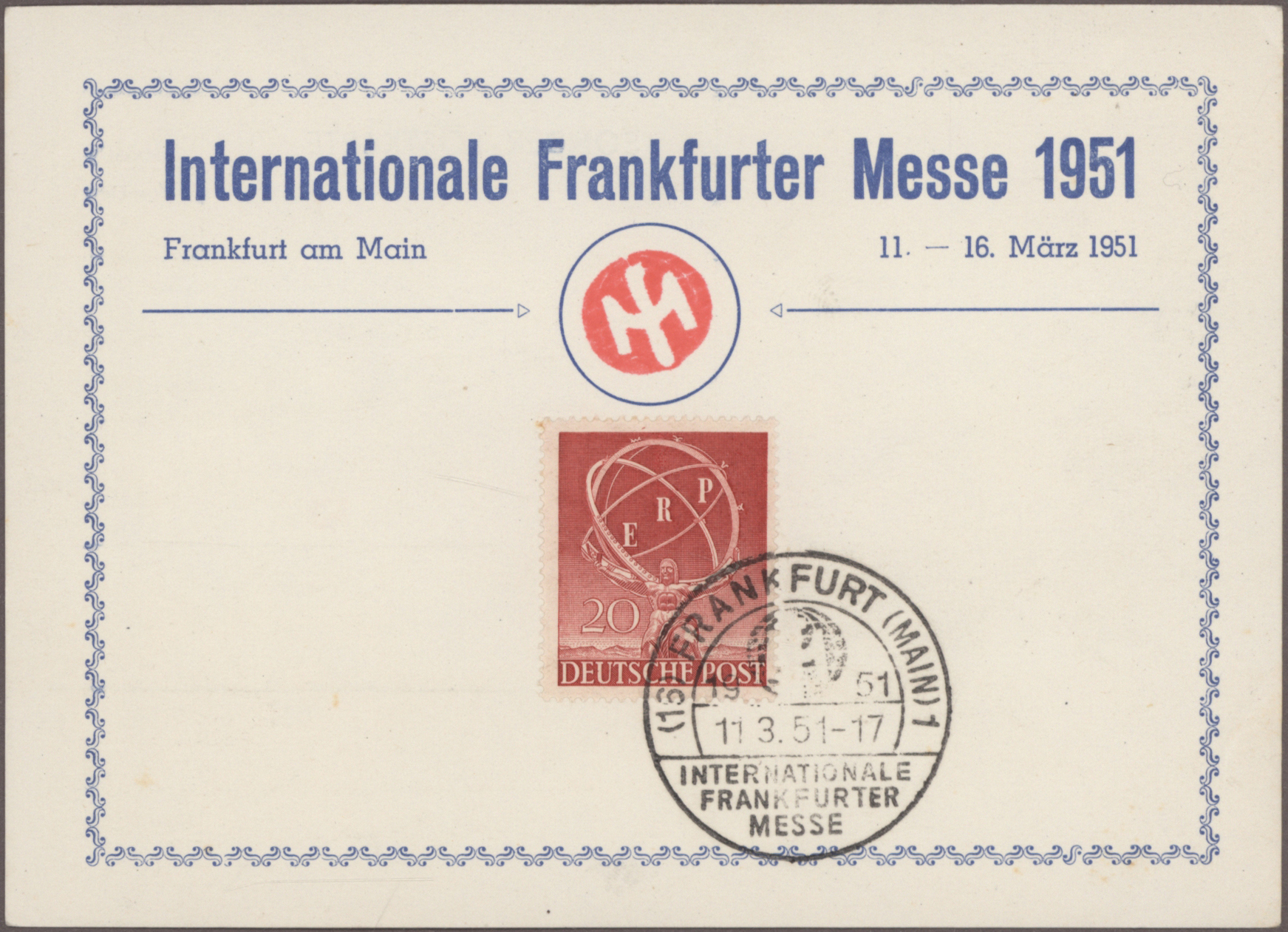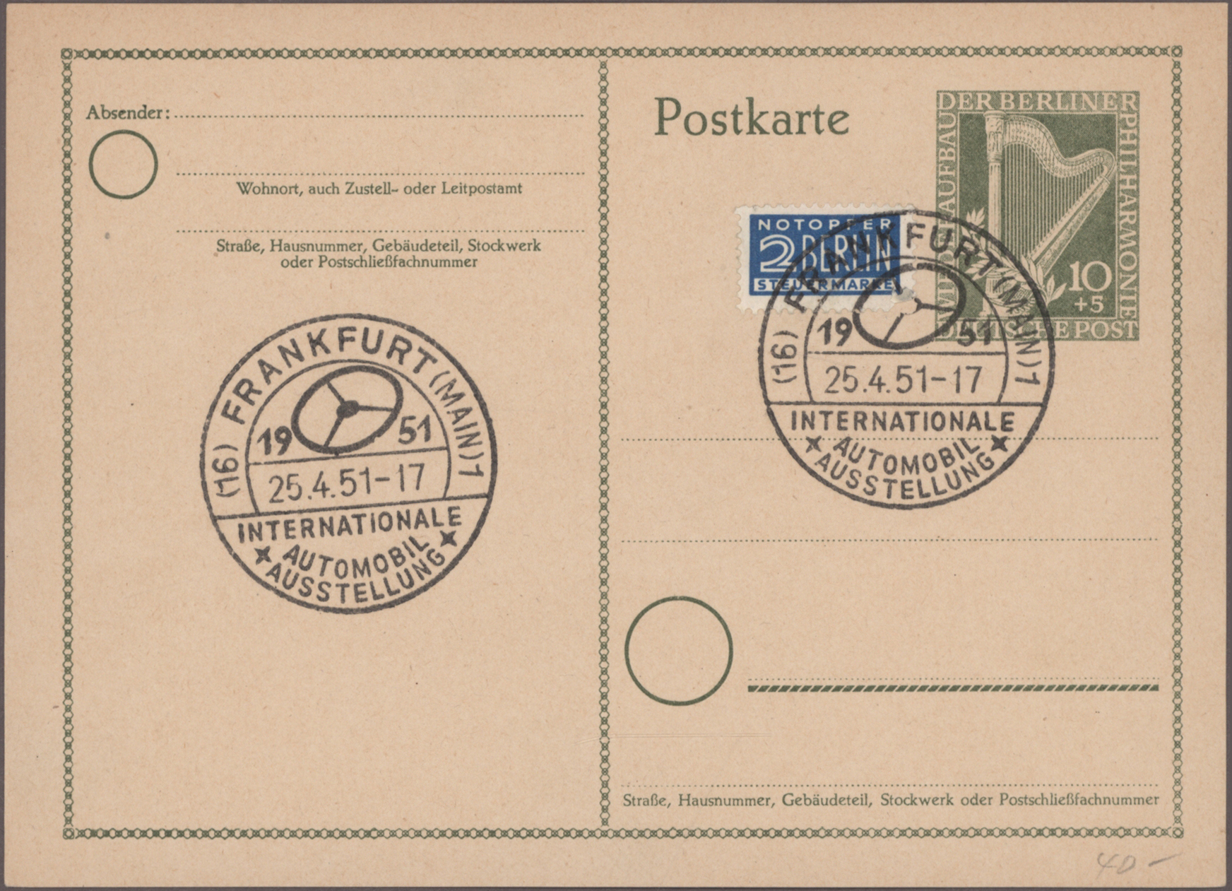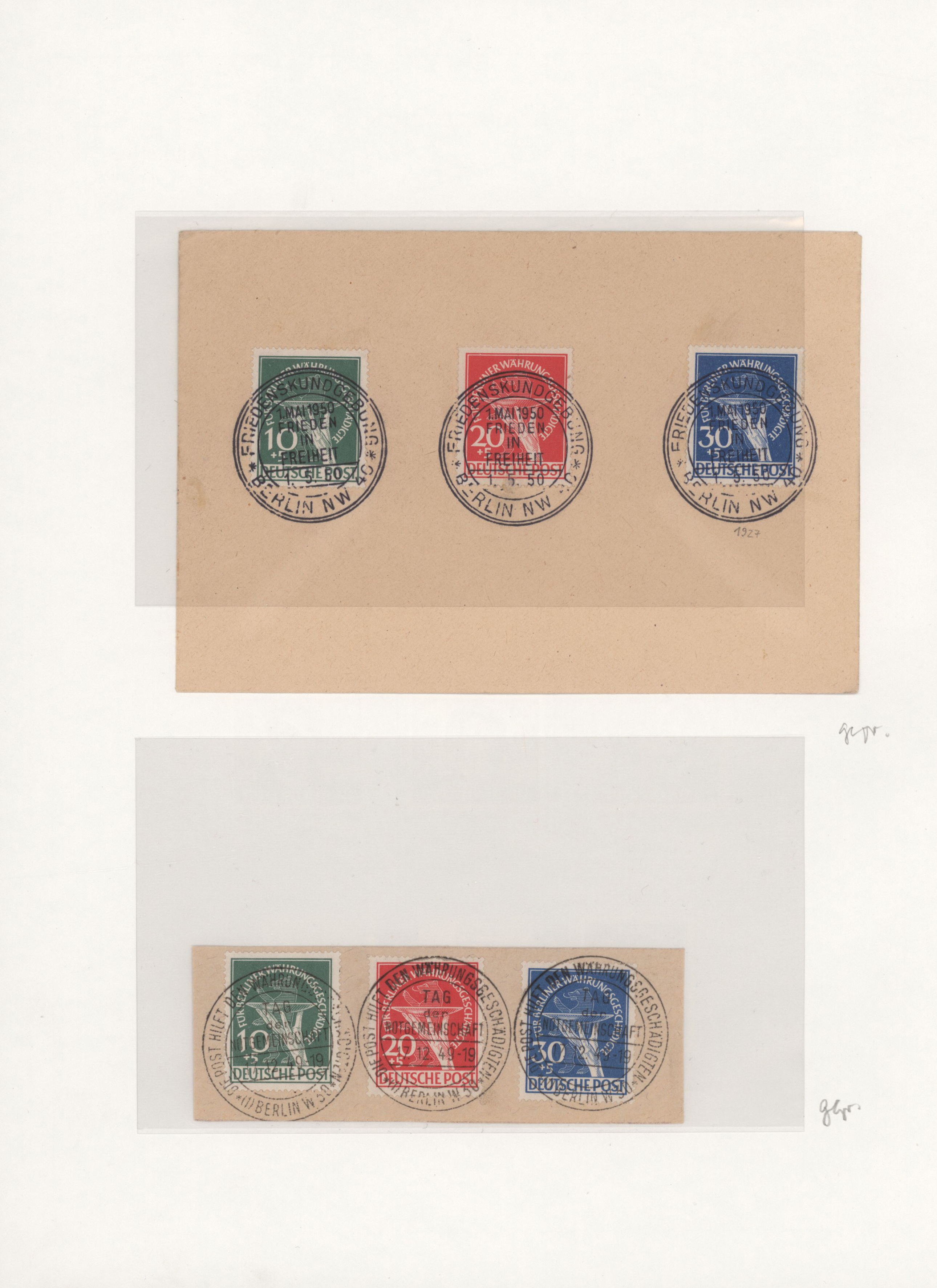 Berlin-Stempeln entwertet. Die Markwerte Schwarzaufdruck halten wir für falsch und sie blieben unbewertet, Rotaufdruck signiert Schlegel BPP, Währungs-Block mit Tagesstempel "Frankfurt" signiert Schlegel BPP. Trotz der kleinen Einschränkung eine