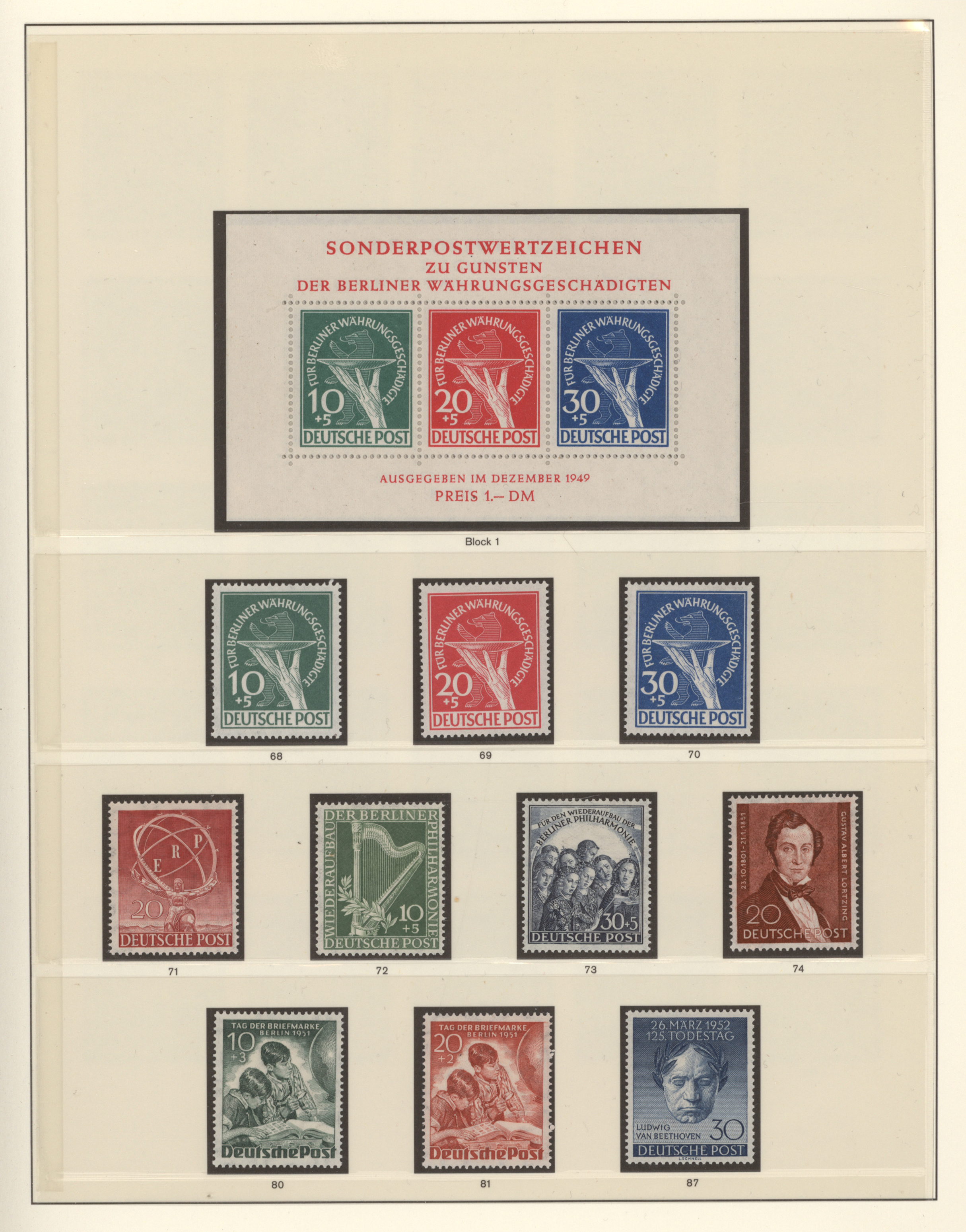 1948/49 Postfrischer Posten mit nur den werthaltigen Ausgaben: Schwarzaufdruck, Rotaufdruck, Stephan-Satz, Goethe-Satz, Berliner-Bauten-Satz I, Währungsgeschädigten-Satz und