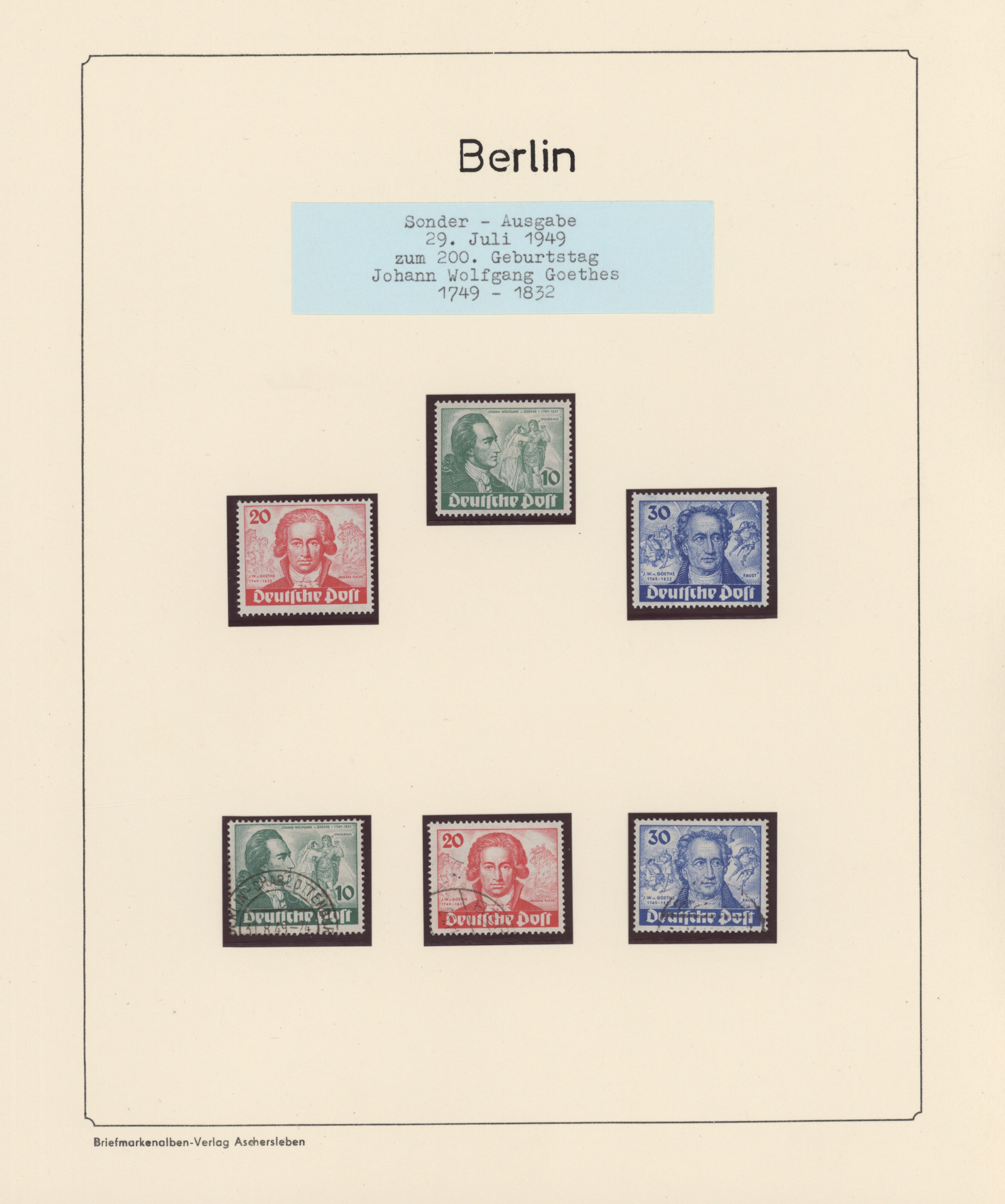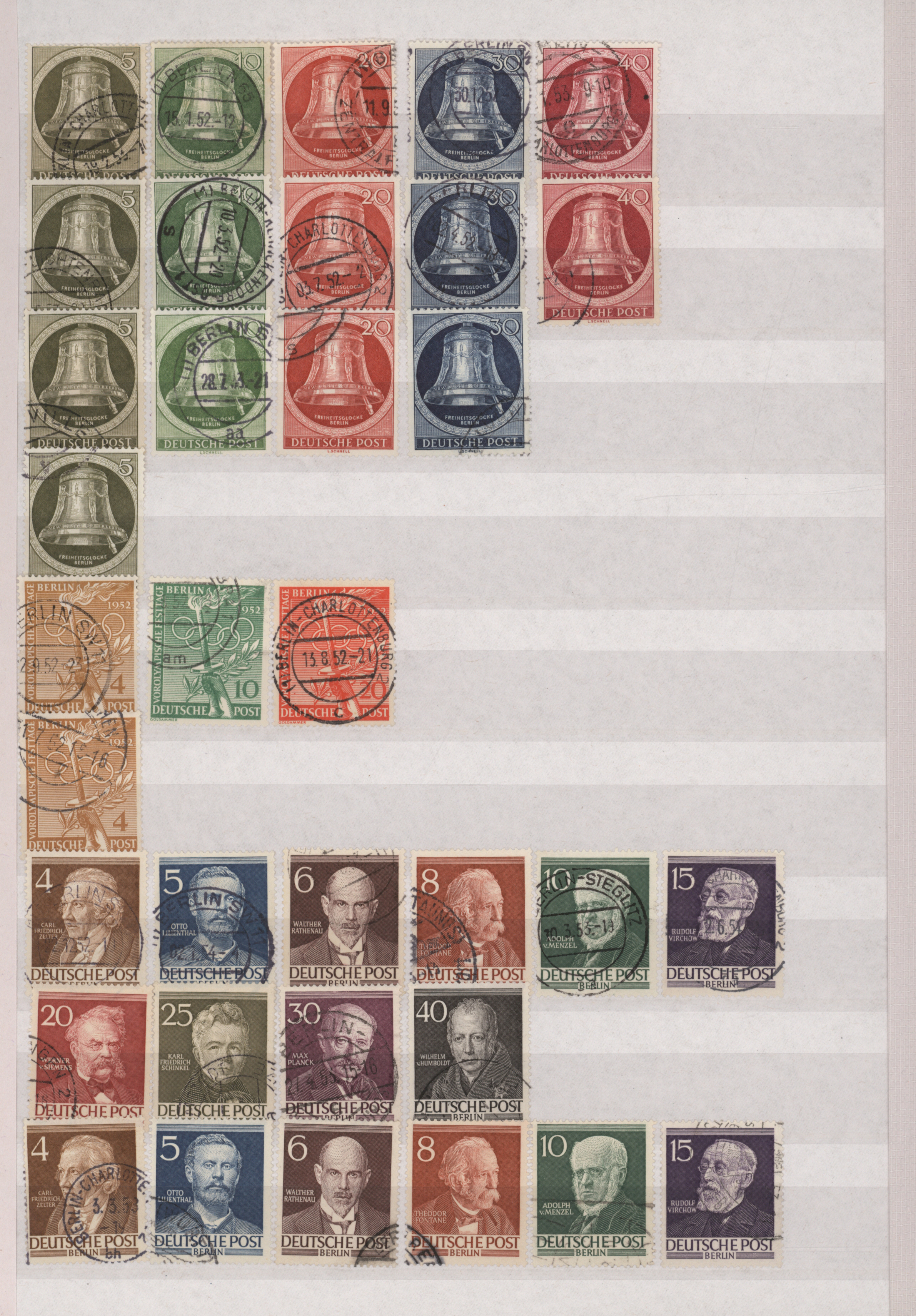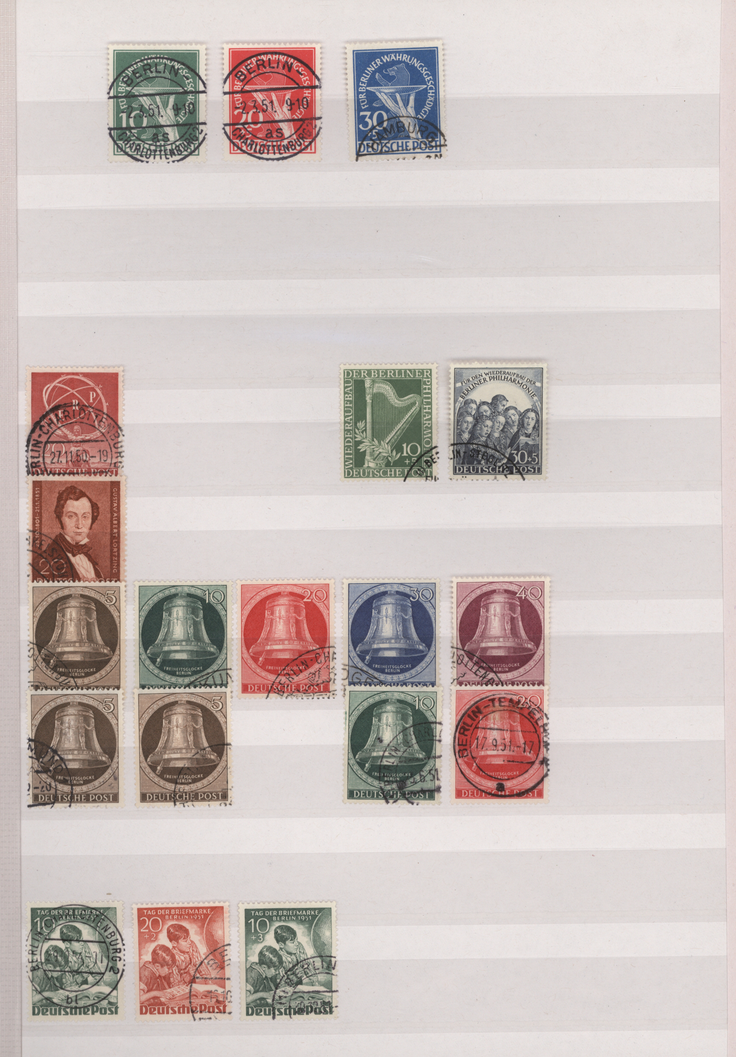 gestempelt, Berliner Bauten I mehrere Sätze postfrisch, Goethe in beiden Erhaltungen, mehrere Sätze Währunggeschädigte sowie dreimal Bl. 1 postfrisch, dazu weitere Ausgaben wie ERP, Philharmonie, Lortzing, Glocken, Männer, Bauten II/III und IV sowie