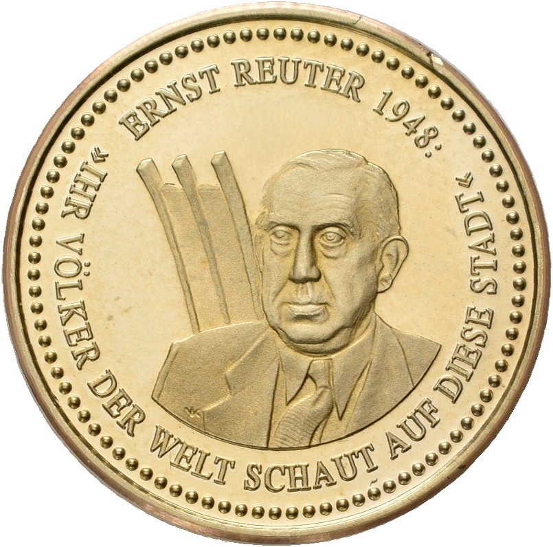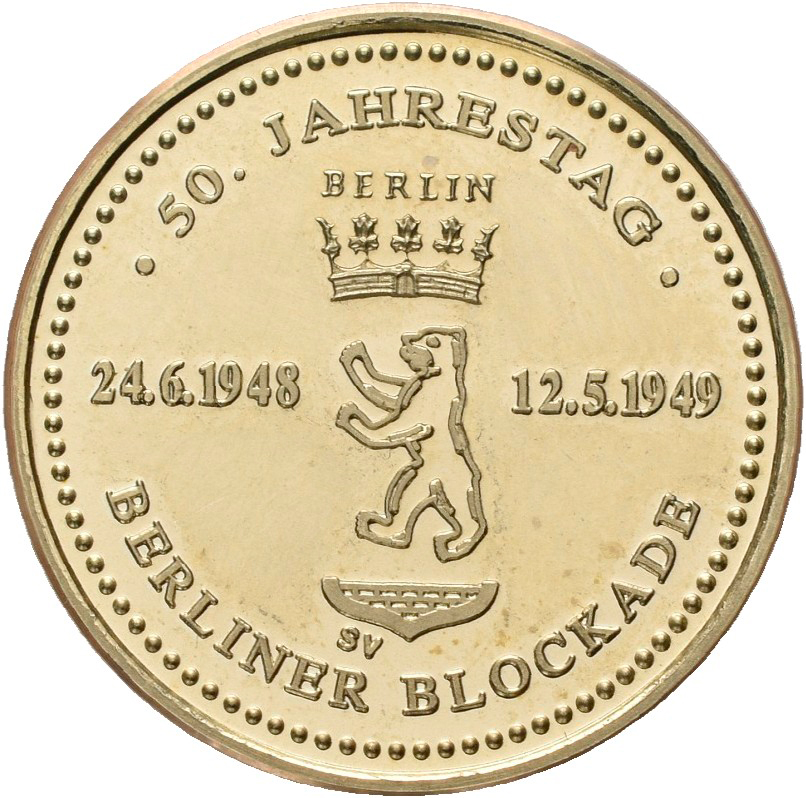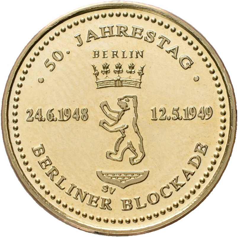 Berlin: 3 kleine goldfarbige Medaille auf den 50. Jahrestag der Berliner Blockade 24.6.1948 - 12.5.1949. Gemeinsame Rückseite, 3 verschiedene
