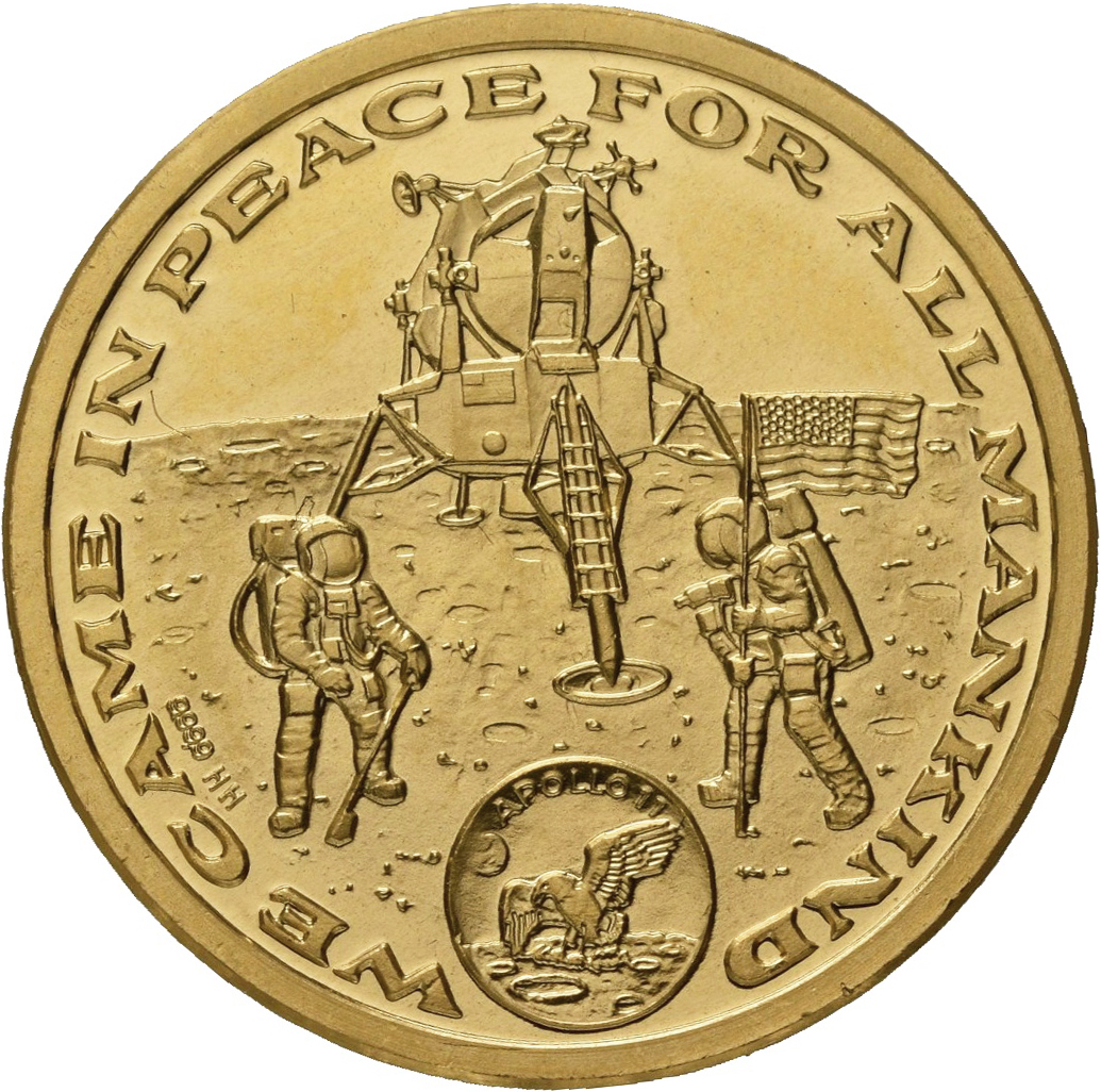 Mondlandung 1969: Goldmedaille Apollo 11 - Landing on the Moon mit Armstrong, Aldin und Collins. 7,9 g, 999,9/1000 Gold. Leicht berührt, polierte