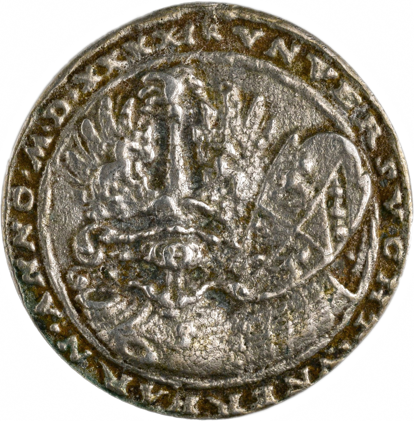 Zwei zusammengebundene Herzen mit den Familienwappen, IRRVPTA COPVLA (= Unauflösbares Band) // 13 Zeilen Schrift. 33 mm, 10,6 g Behrens 718, Röhl 310.19 Feine Patina, kleinste Randfehler, vorzüglich.