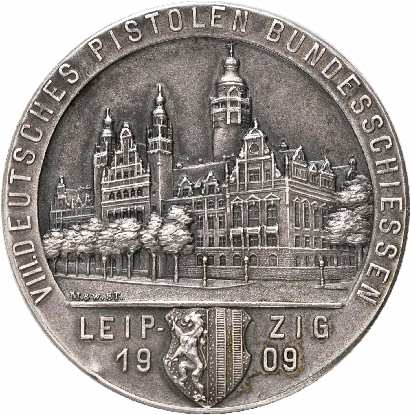 Schützenmedaille: VIII. Deutsches Pistolen Bundesschießen Leipzig 1909. Mattierte Silbermedaille von Mayer und Wilhelm. Ansicht des Rathauses //