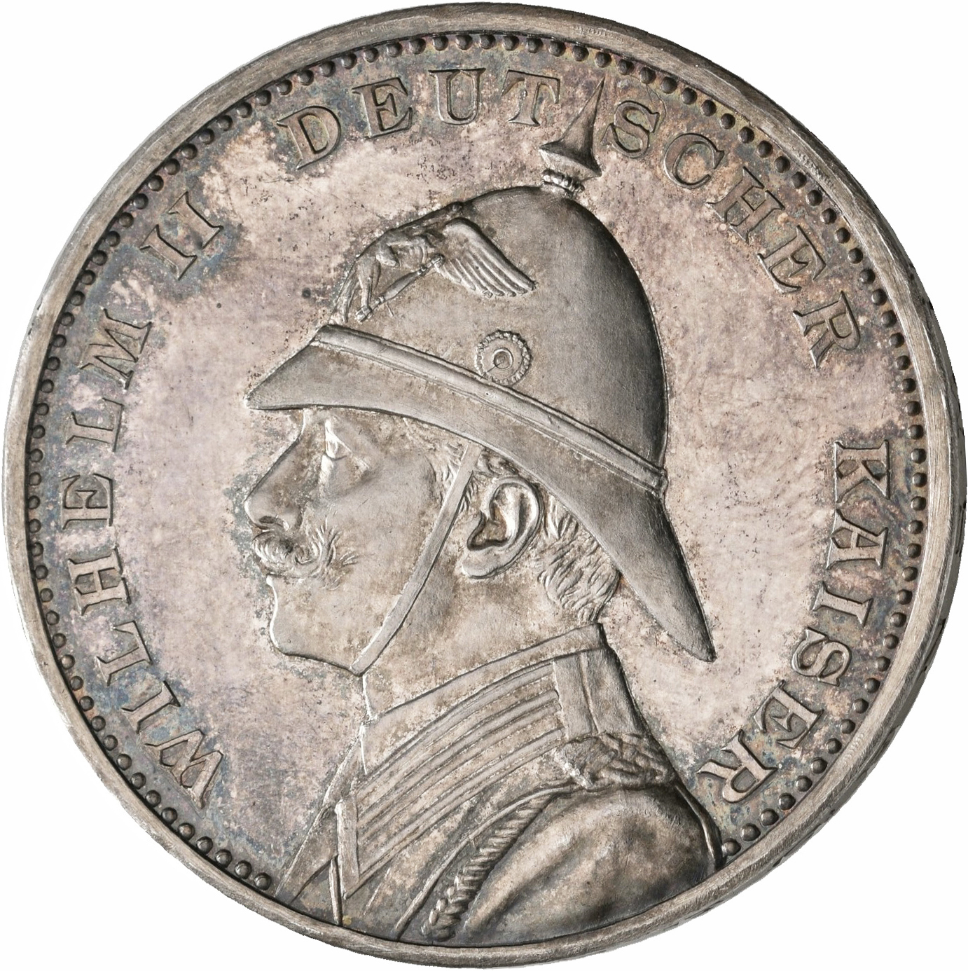 Brustbild in Truppenuniform nach links // Dampfer SMY Hohenzollern. Mit Randschrift: PALÄSTINA SEGENSMÜNZE. 34,6 mm, 18,6 g. Slg. Marienburg 7126. Feine Patina, feine Kratzer, ex polierte Platte.