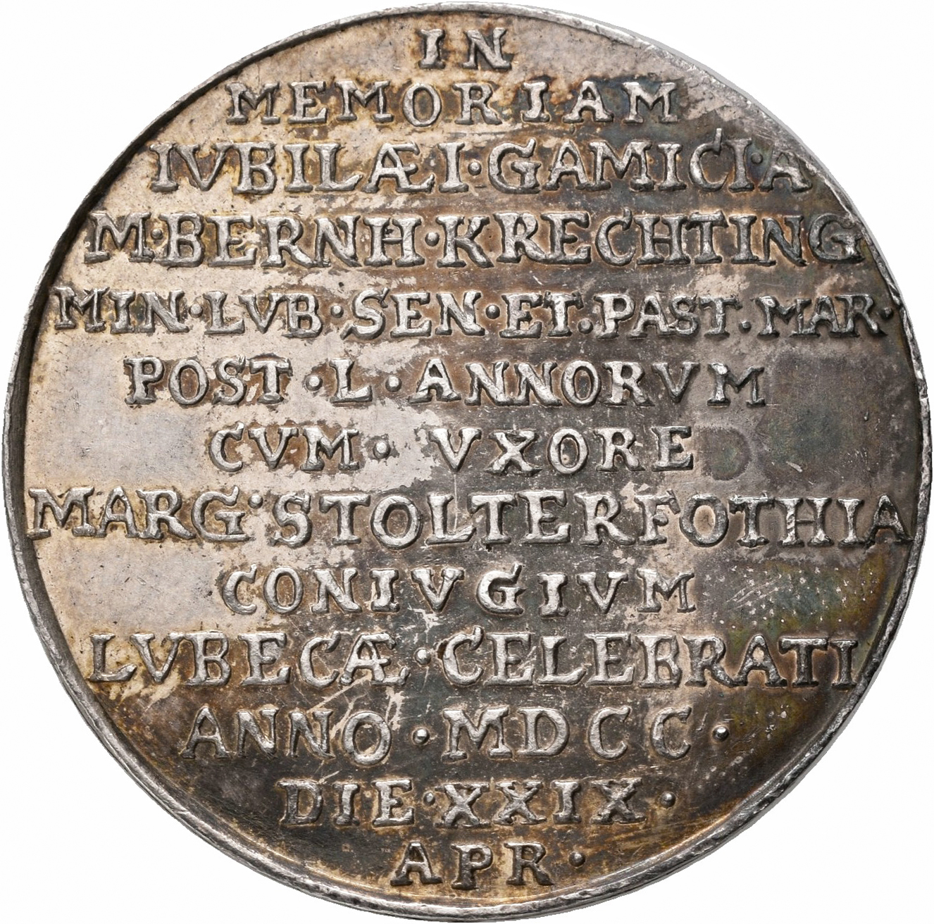 Lübeck, Silbermedaille 1700 (unsigniert) auf die goldene Hochzeit des Pastors Bernhard Krechting und seiner Gemahlin Margareta Stolterfort.