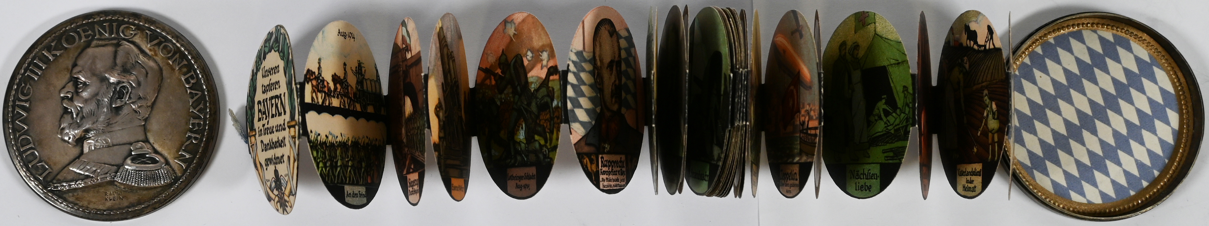 gekröntem Wappen. Vollständige Einlage des Leporello mit 30 farbige Darstellungen in perfekter Erhaltung. Unseren tapferen BAYERN in Treue und Dankbarkeit gewidmet. Zetzmann 7001, Preßler 244. Vorzüglich.