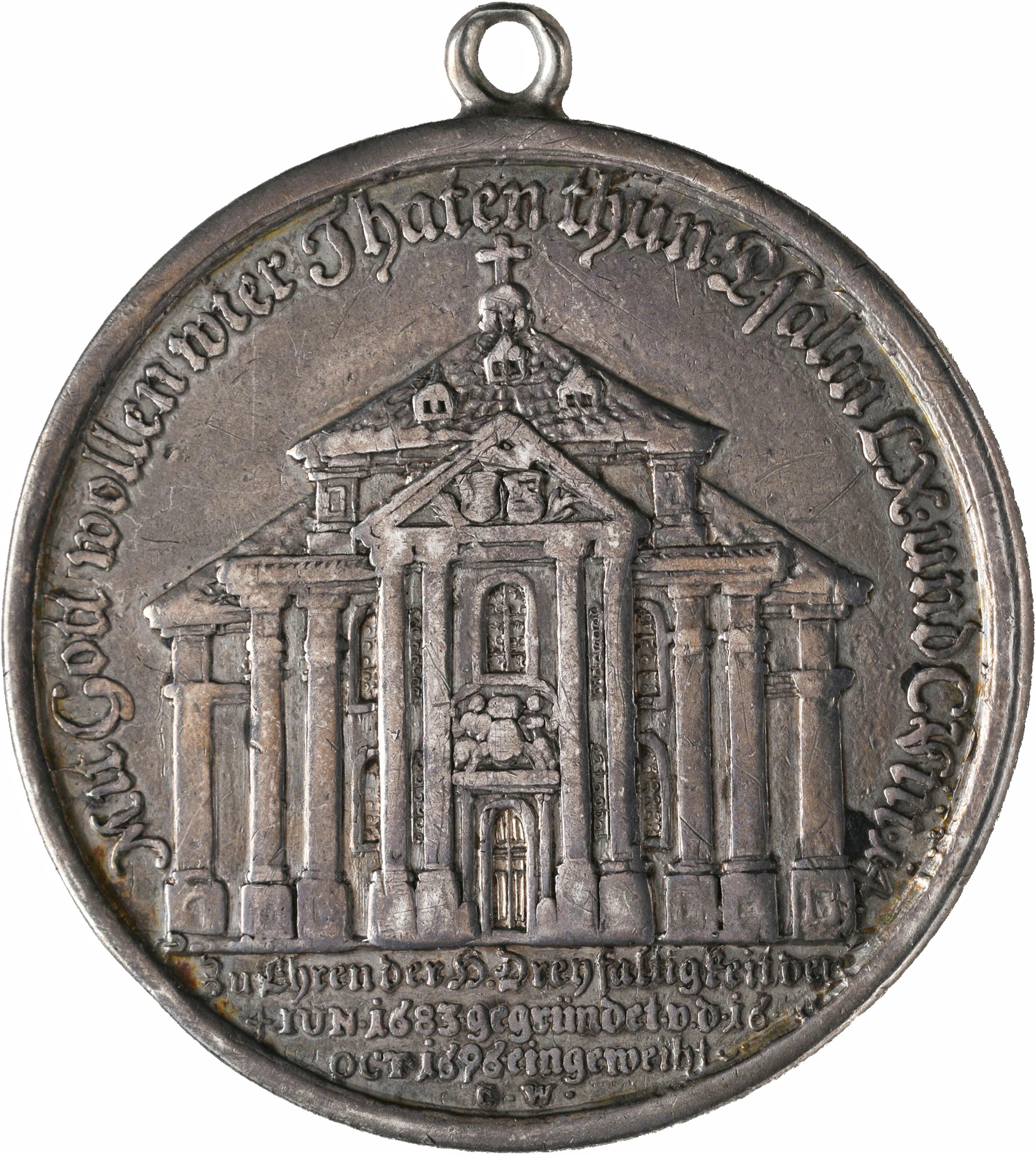 Anhalt-Zerbst: Tragbare Silbermedaille 1696 von Christian Wermuth auf die Einweihung der St. Trinitatiskirche in Zerbst am 16. Oktober. Ansicht