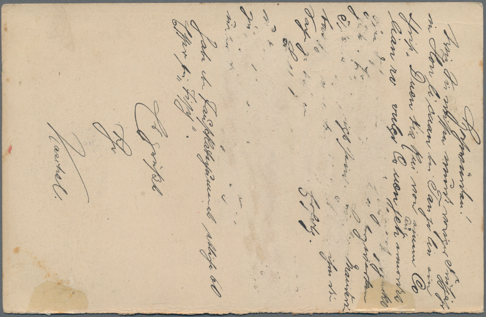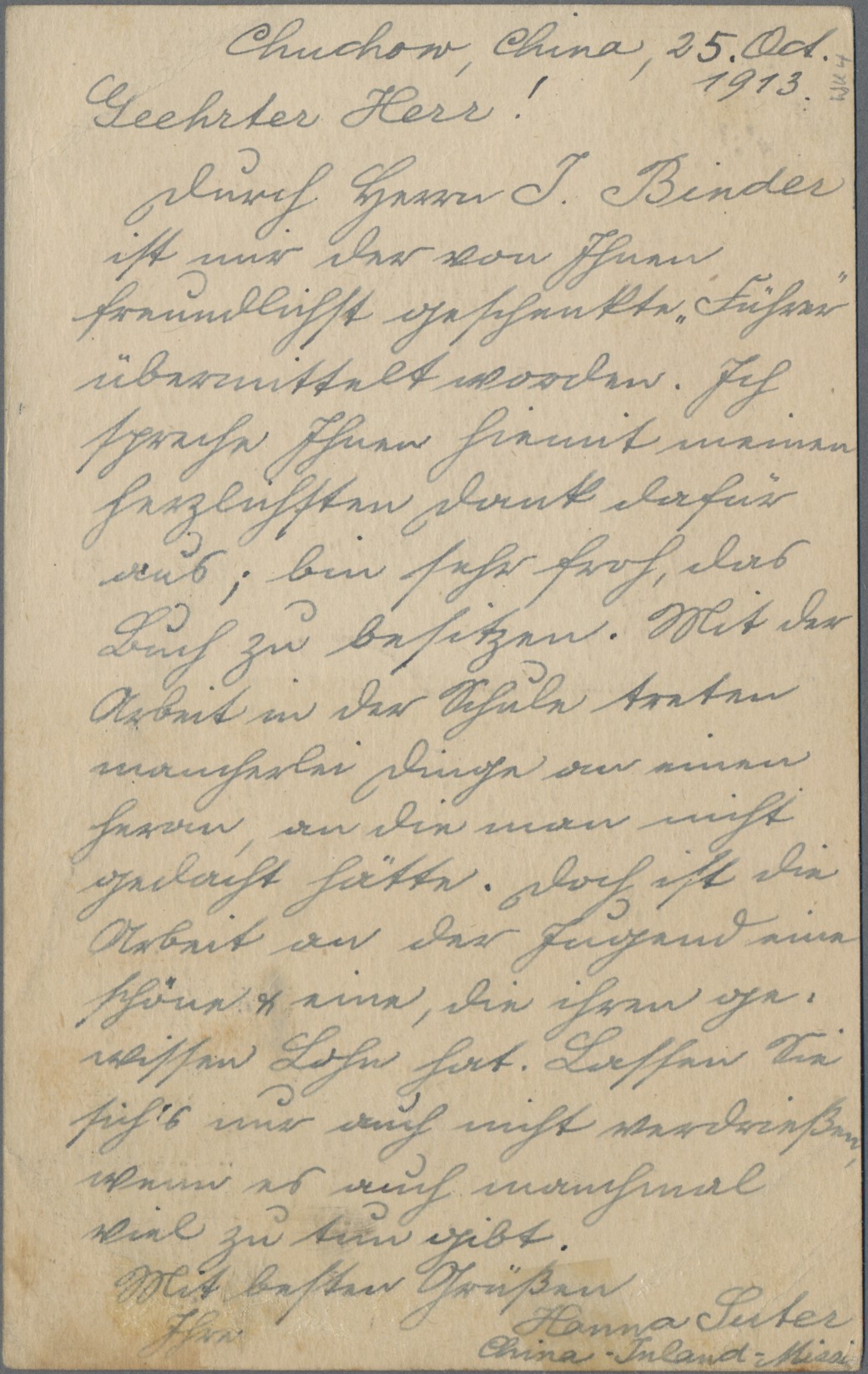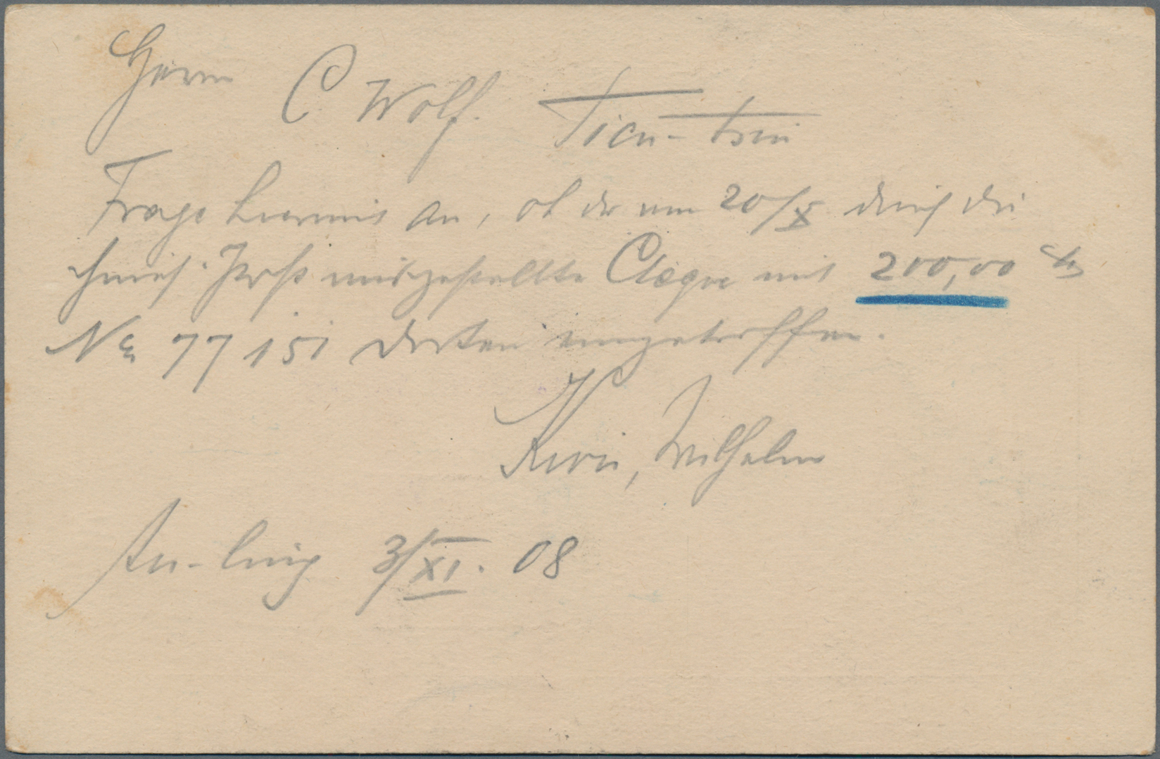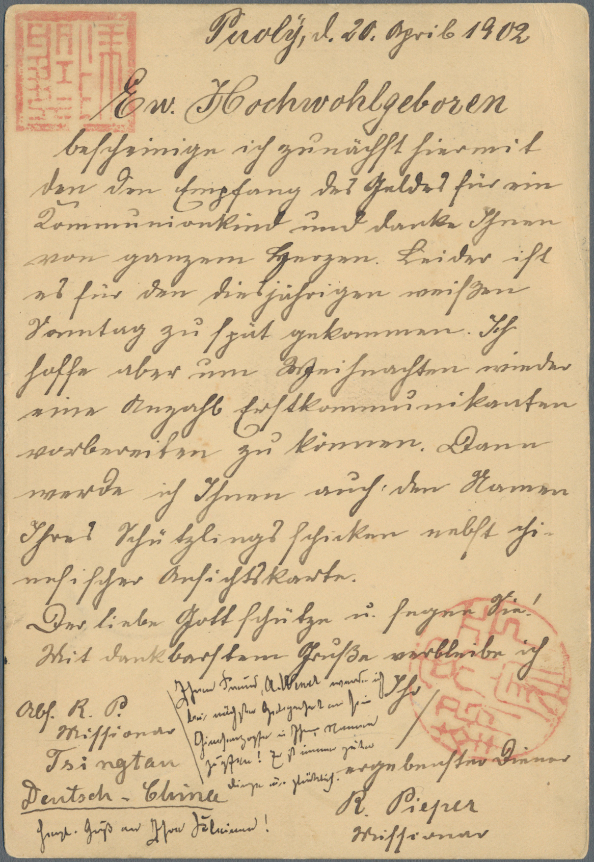 Germany w. arrival "BORGHORST 9.6.02", senders dateline on reverse "Puoly d. 20. April 1902". ÷ 1902, 5 Pf. Kaiseryacht entwertet "TSINGTAU" und ½ C. braun CIP auf 1 Ct. Ganzsachenkarte (Ovalstpl. "Peking") von Missionar Pieper in Puoly nach