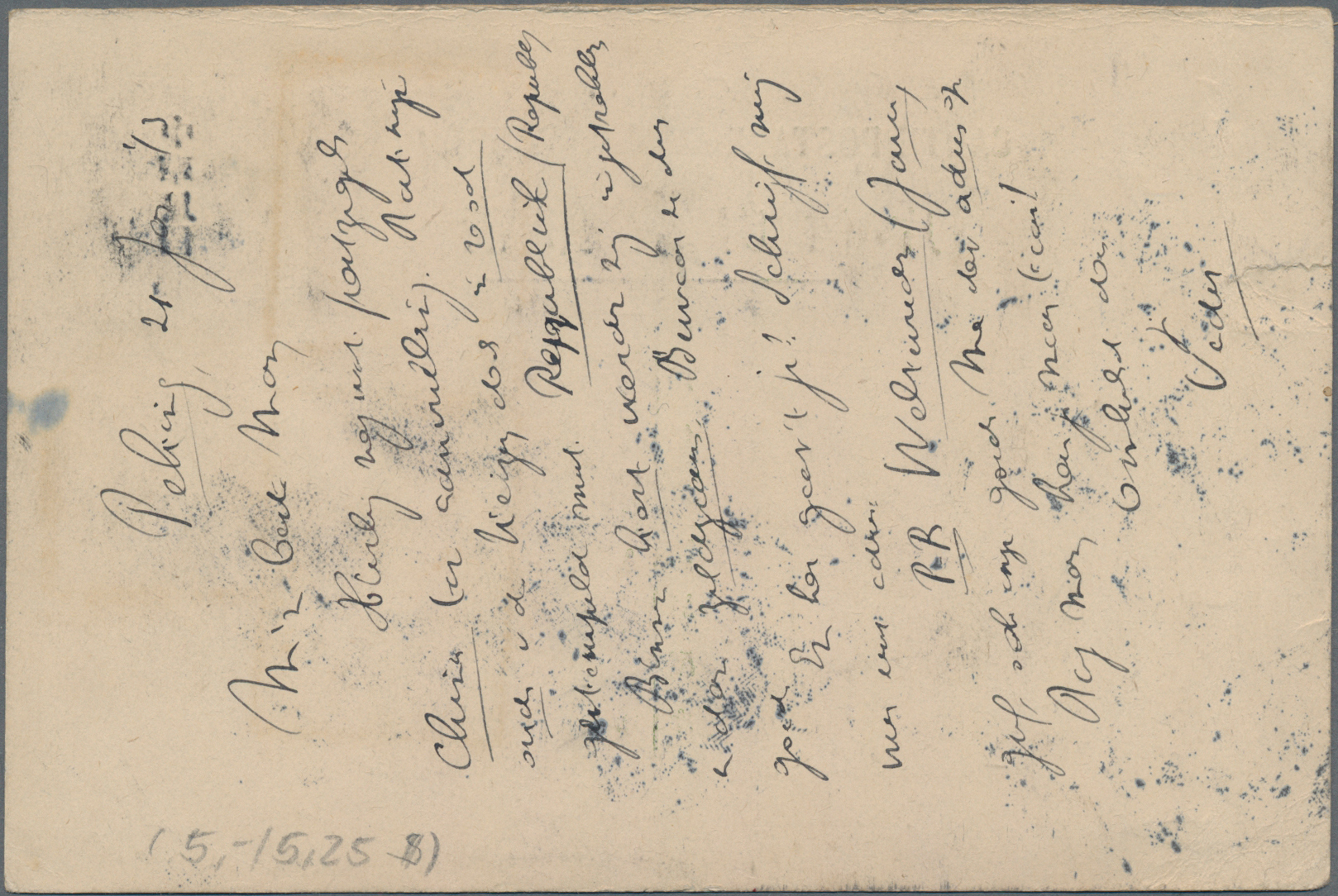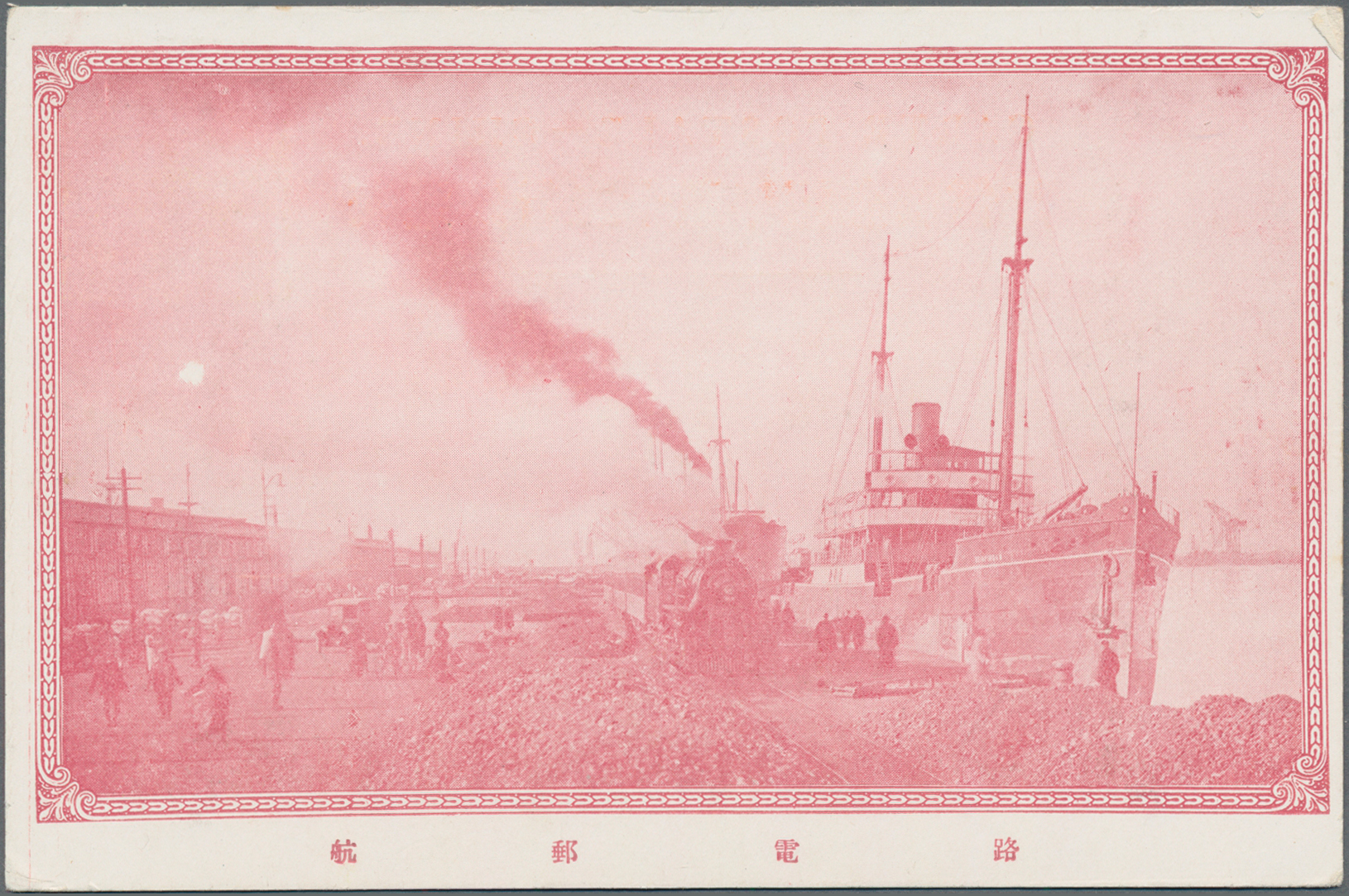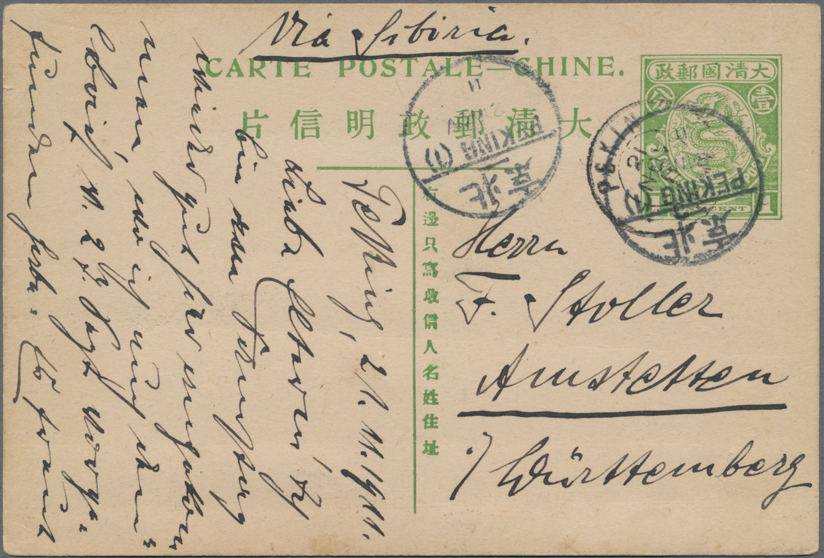 with railway TPO transit on reverse; simple card uprated waterlow ovpt. 3 C. and statistical dept. 1/2 C. (2) tied international dater "'P'eking" to Netherlands w. arrival "Voorschoten", left margin crease and 4 mm tear. Commercial usages.
