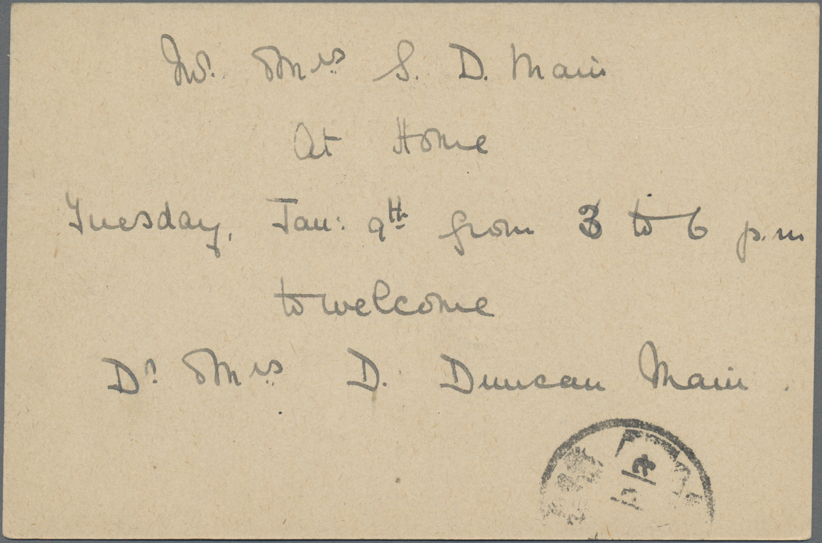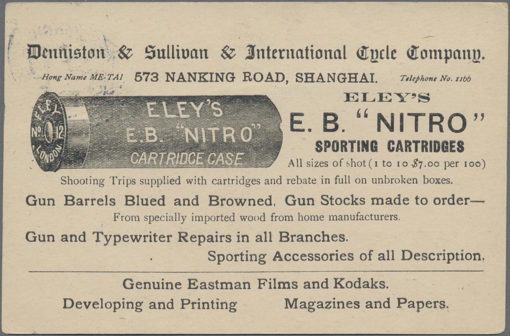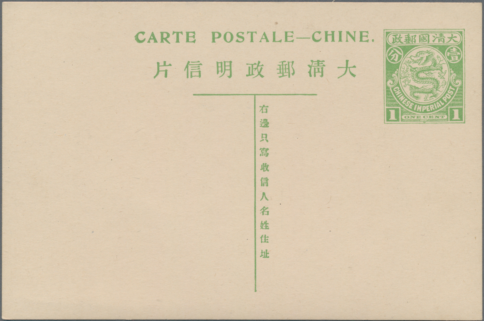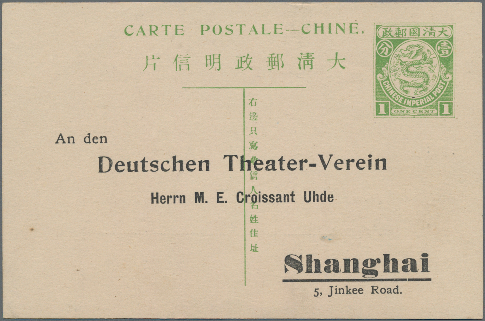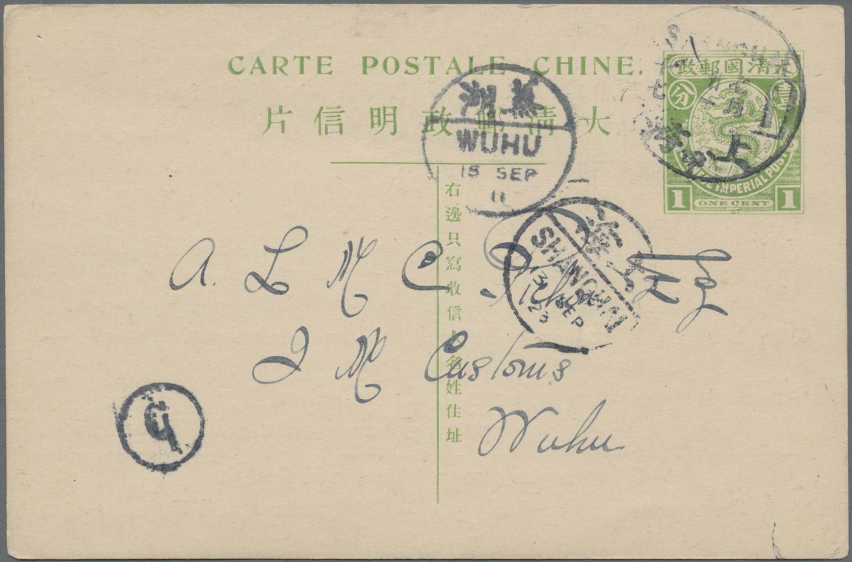 1907, card 1 C. light green uprated coiling dragon 1 C. ocre canc. boxed bilingual "Shanghai -.8.18" via "Shanghai 3.9.09" and "Shanghai I.J.P.O. 4.9.09"