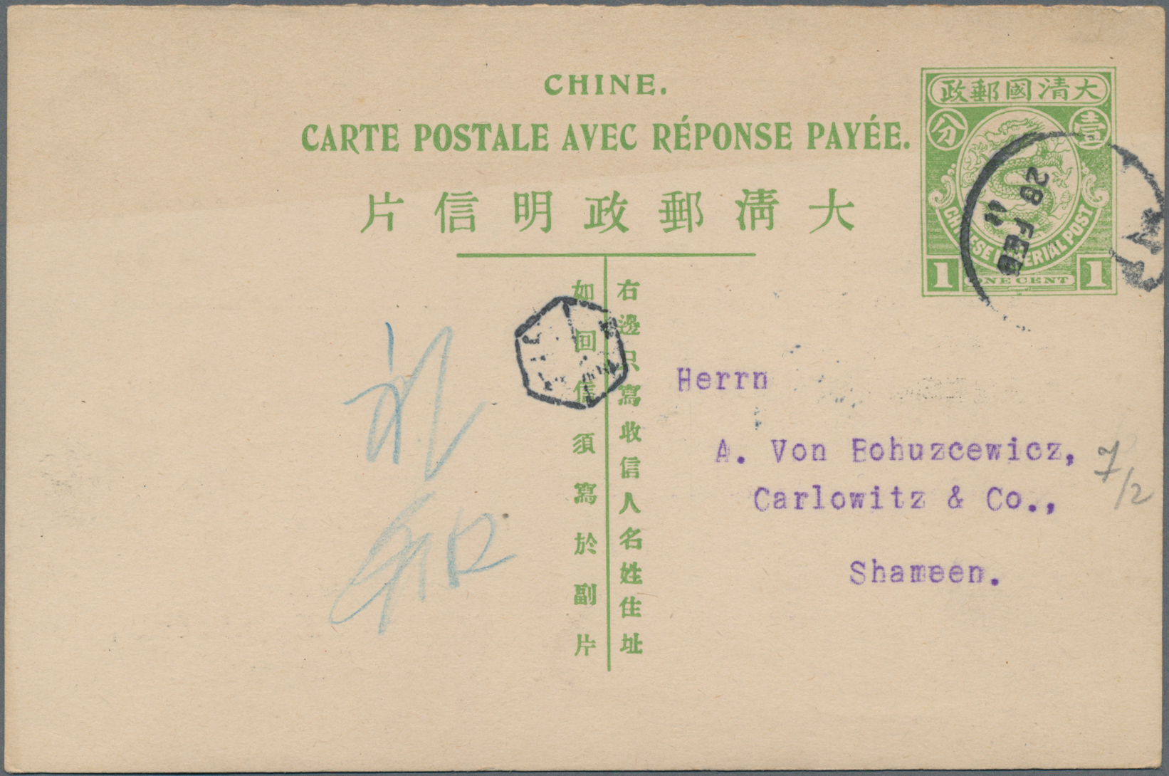 1905 (17.8.), 1c Dragon reply postcard commercially used from Shanghai to Canton with arrival pmk. on front, with annexed reply-half with pre-printed