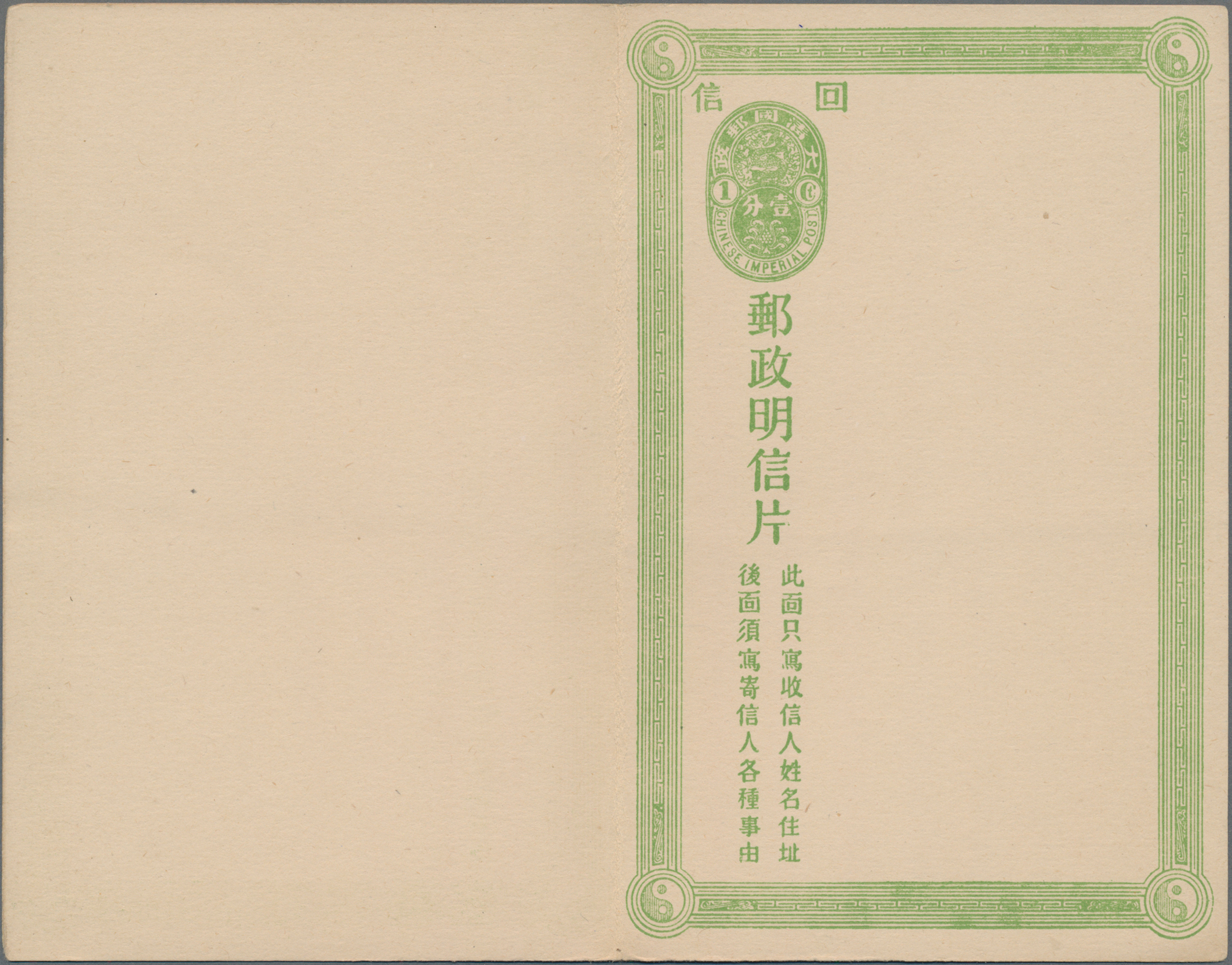 1912, "China Republic" ovpt. on card 1 C. dragon (2): reply part used up uprated coiling dragon 3 C. green used boxed bilingual "Kiaochow" to Bonn/Germany