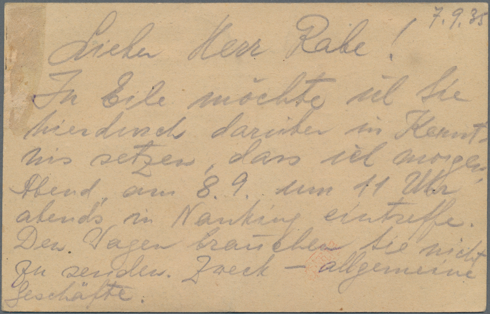 1935, card SYS 2 1/2 C. large size uprated 2 C., martyr 10 C. tied "Shanghai 7.9.35" to Nanking w. arrival. To "John H. Rabe, c/Siemens China Co.
