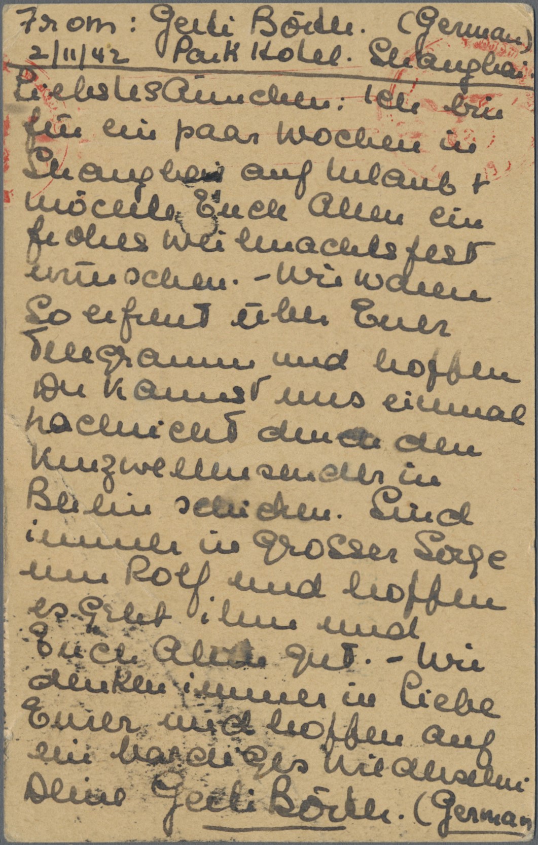 1942, UPU card SYS 30 C. uprated martyr 30 C. tied "Shanghai 3.11.42" to Berlin/Germany with german censorship. Large private handstamp of "Park Hotel