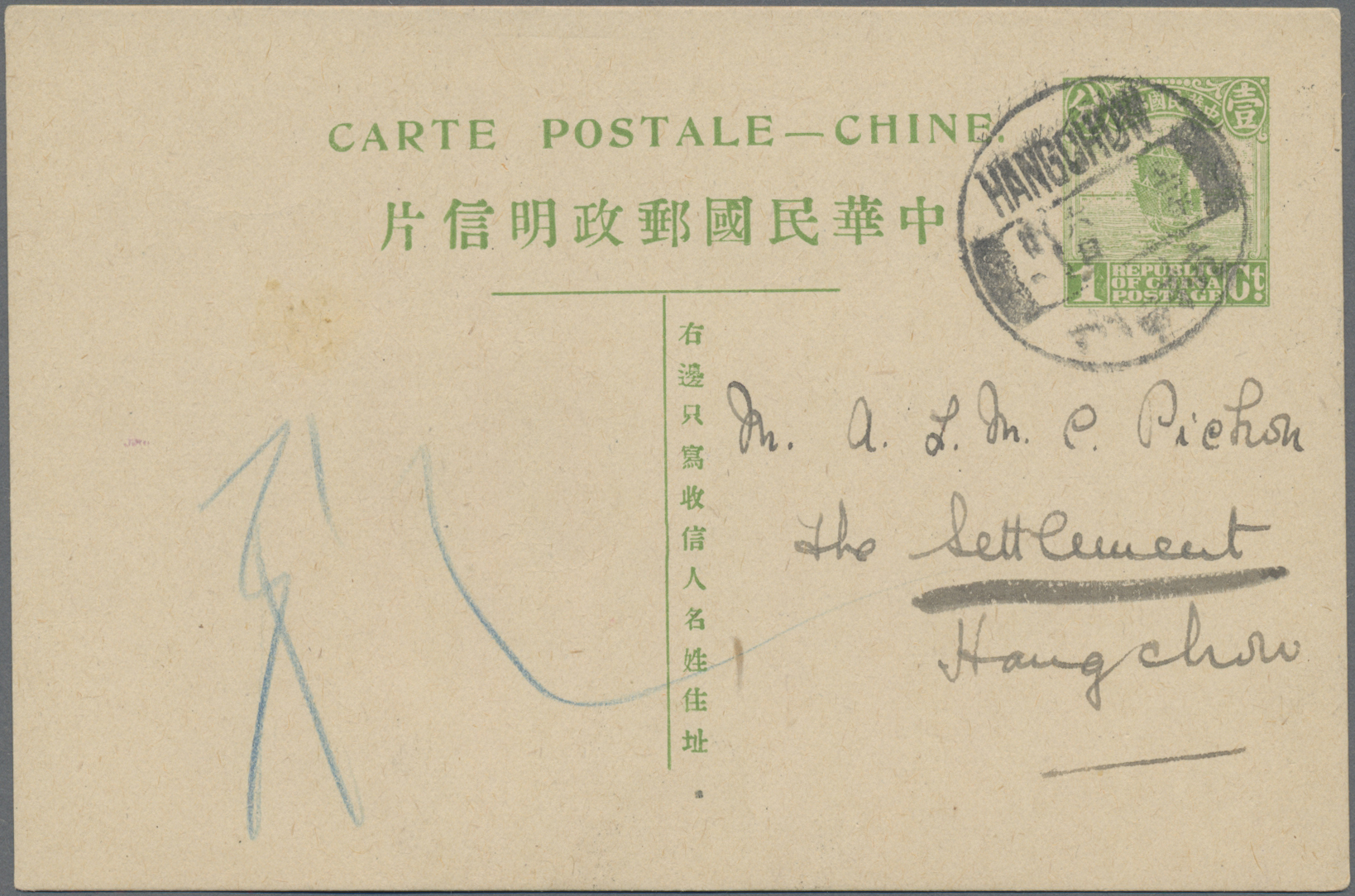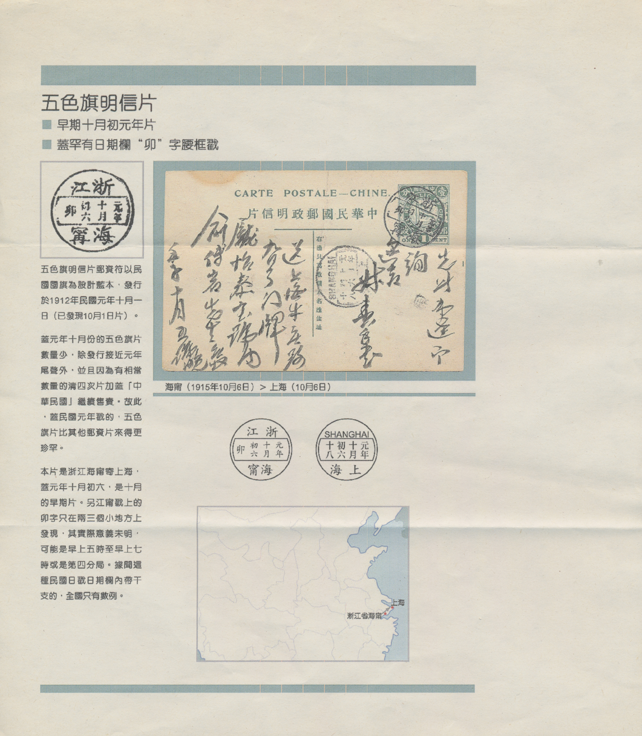 1912, flag card 1 C. canc. boxed dater "Chekiang Haining 1.10.6" to Shanghai. Early usage of Republic Year. Interesting character, said to be either for a