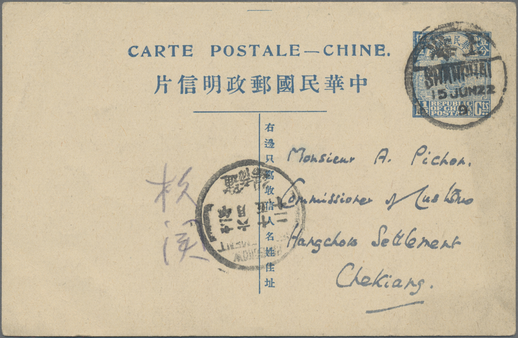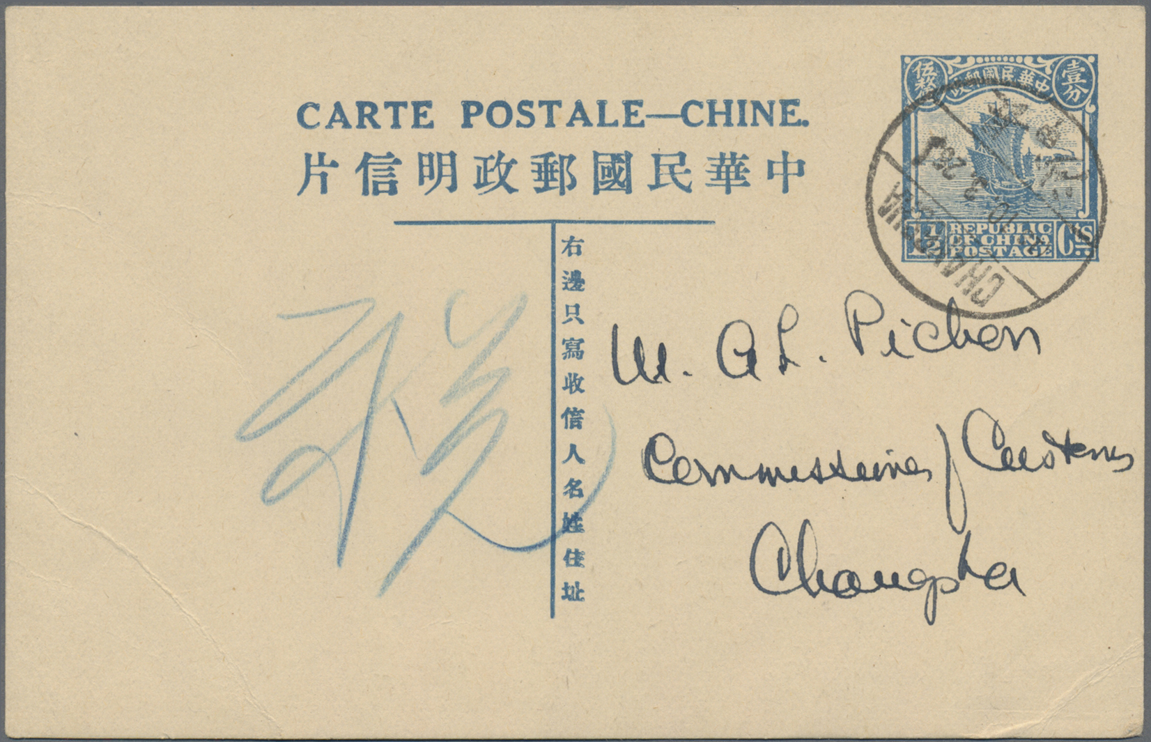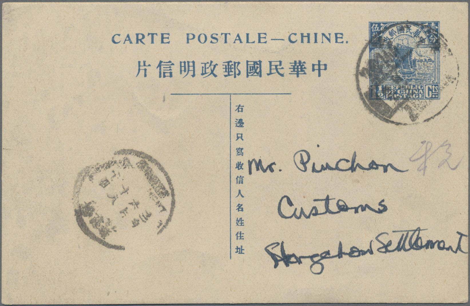1921, letter card 3 C. with sales price and 2nd line "postal envelope" unused mint resp. uprated 1923 junk 3 C., 4 C. "Shanghai 16.3.17" (17 March 1927)