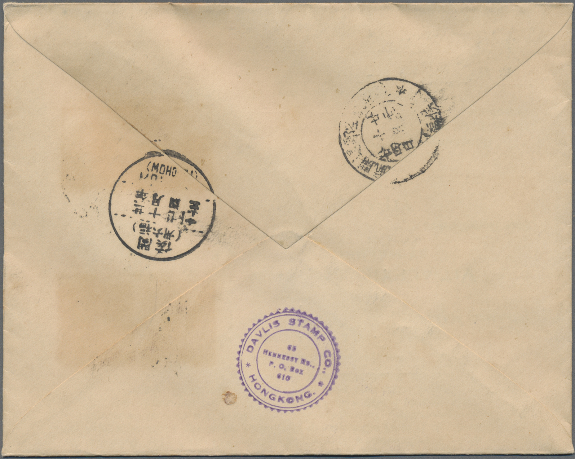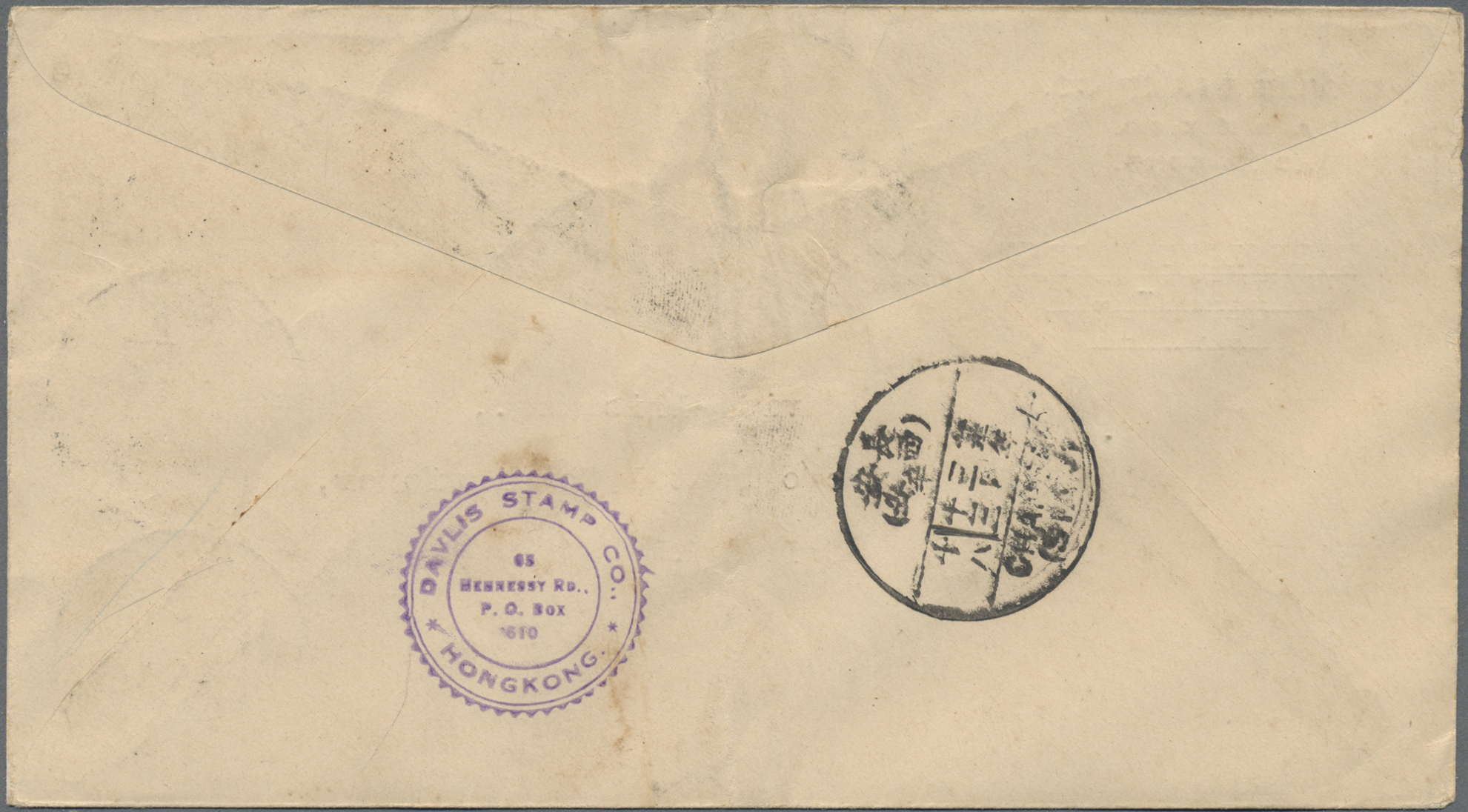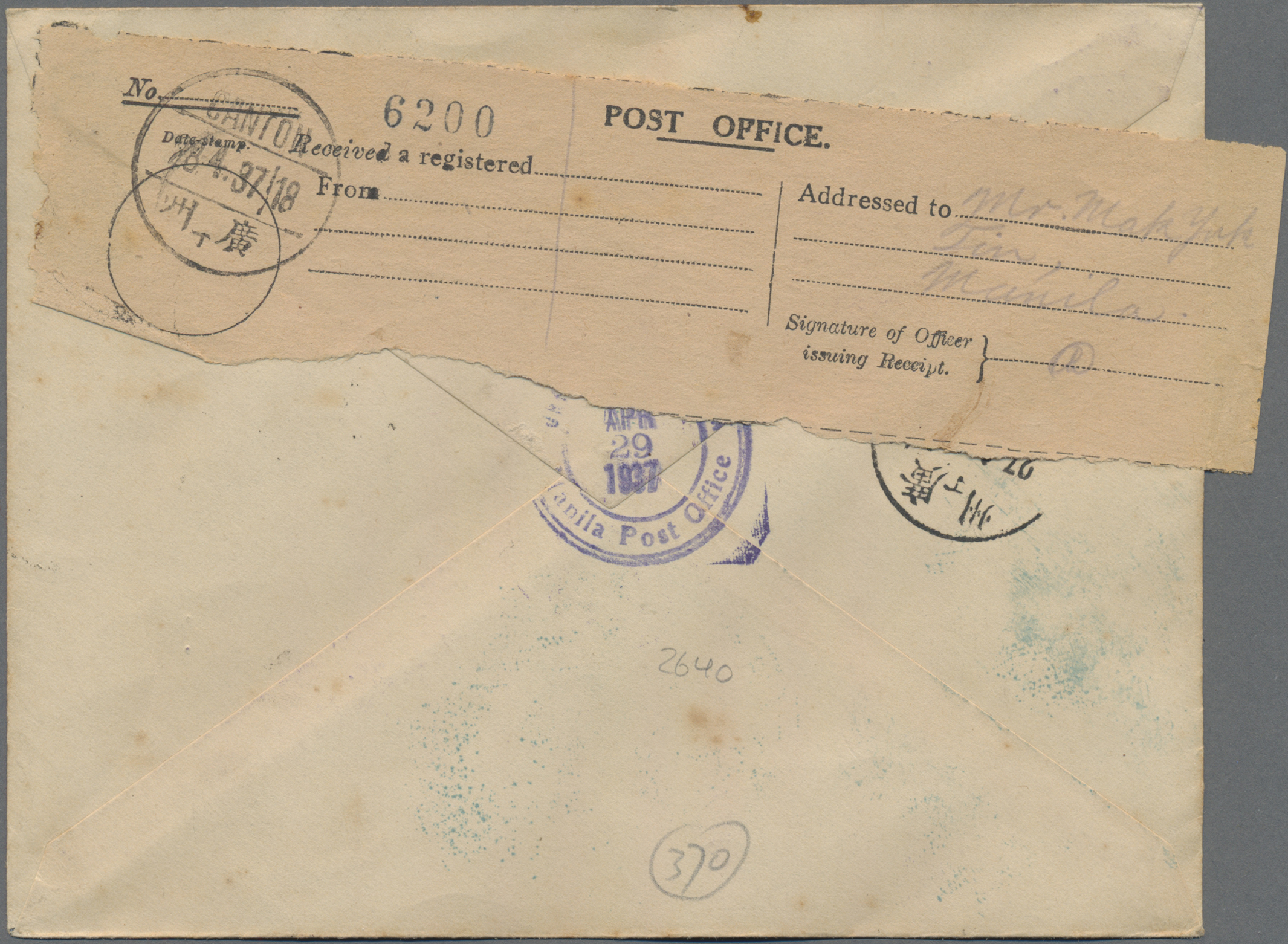 Shanghai and Canton, with violet marking "FIRST FLIGHT VIA P.A.A. / RECEIVED MANILA / FROM MACAO HONGKONG 1937" alongside and arrival markings on reverse.