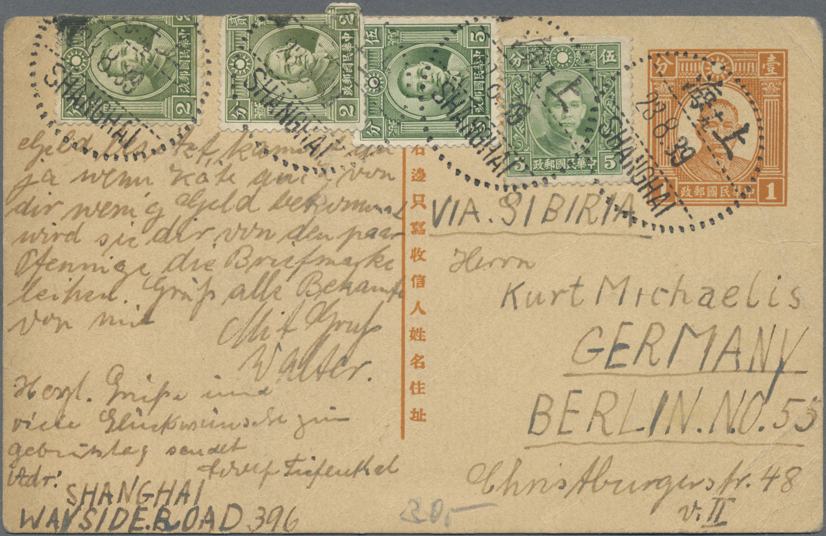 1935, card SYS 1 C. reply part uprated SYS 4 C., 25 C. canc. clear german "Hindenburg (Oberschles.) 6.5.40" to Shanghai/China. Sent from Upper