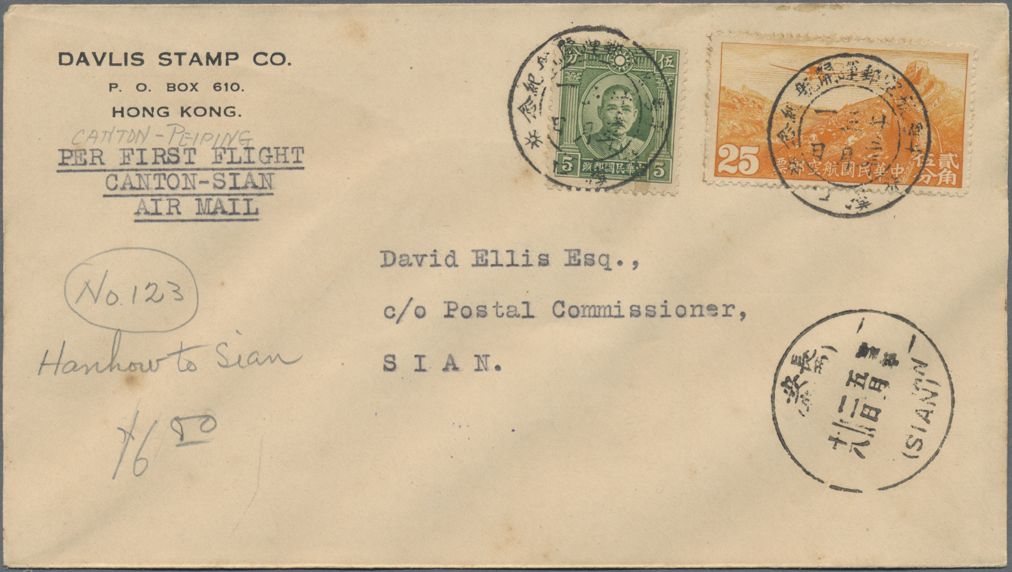 1923/37, three first flight covers including Eurasia Aviation Corp. Peiping to England, first flight Peiping to Si'an, and Canton to Si'an, bearing definitive