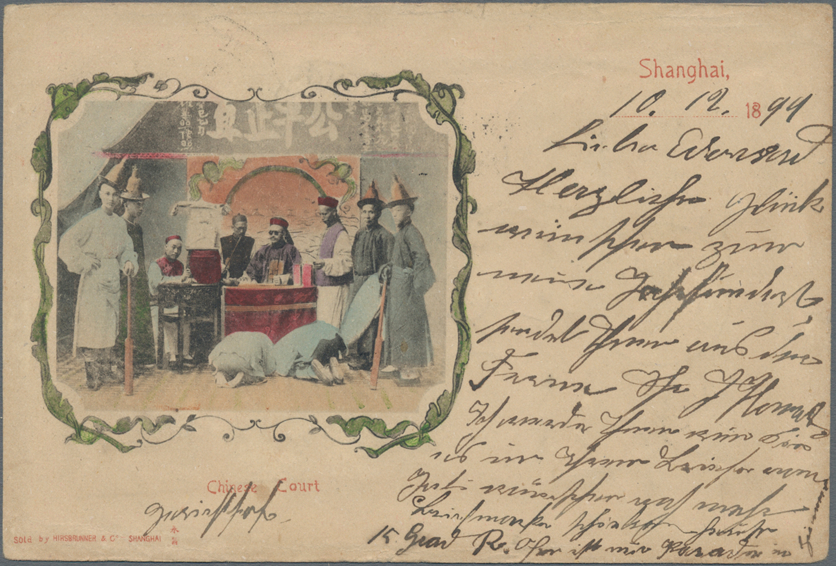 13 DEC 99" to Bruxelles / Belgium w. 16 JANV 00 arrival, transit french postal steamer "LIGNE N 14 DEC 99 No. 4". On reverse multicoloured litho "Chinese Court" (ed. Hirsbrünner&Co., Shanghai). A showpiece.