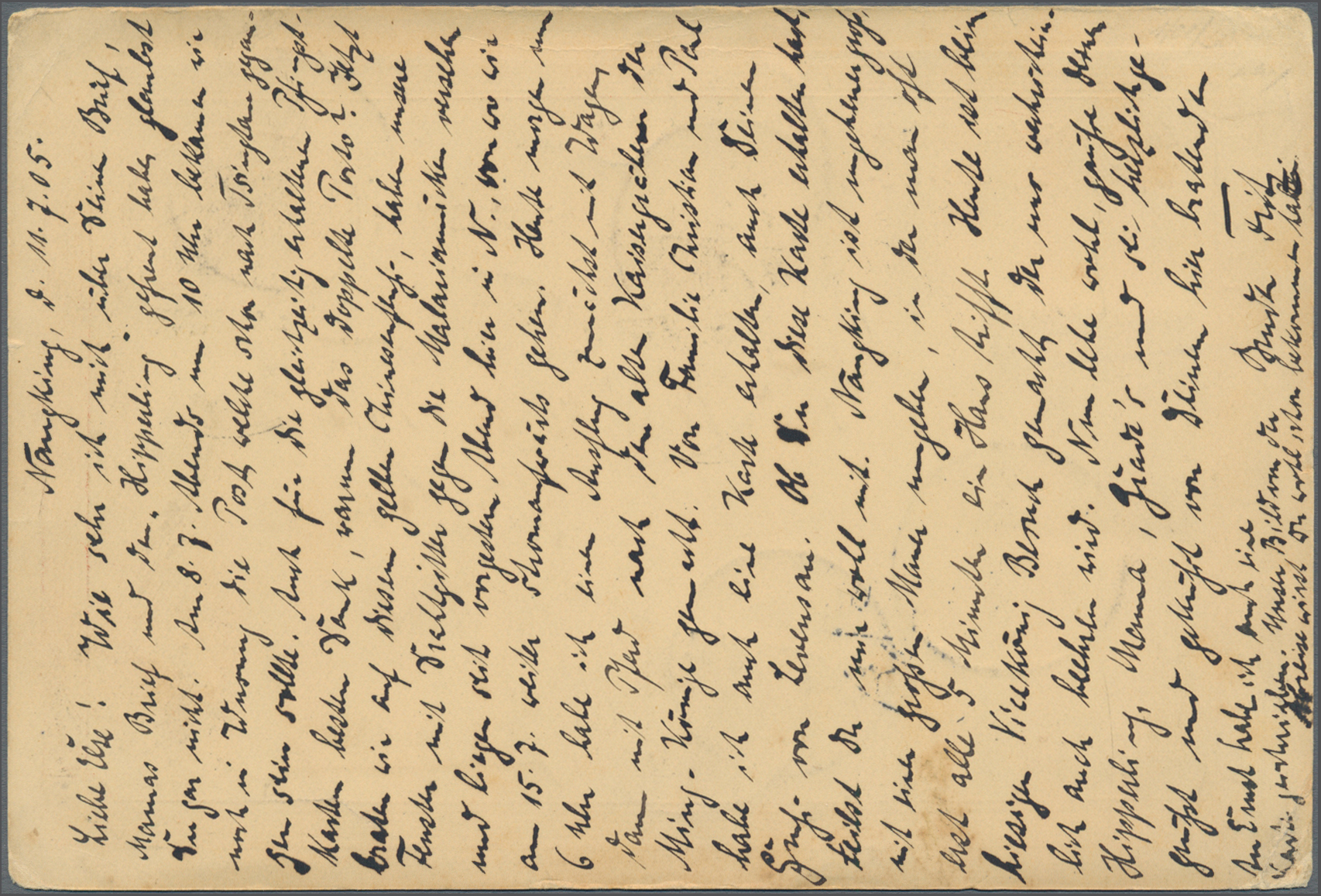 Kiel/Germany with "20.8.05" arrival. Dated on reverse "Nanking 11.7.05". Text by a staff of german large cruiser "SMS Hansa" reporting visit of imperial tombs and visit to viceroy.