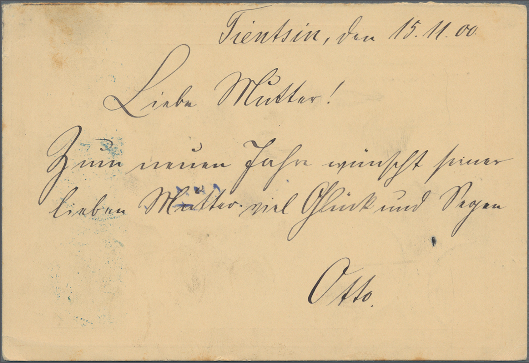 1900, reply part 1 C. red uprated coiling dragon 1 C., 2 C. canc. blue "TIENTSIN 4 NOV 00", german field post 15/11 00 to Stendal/Germany and fwd. w.