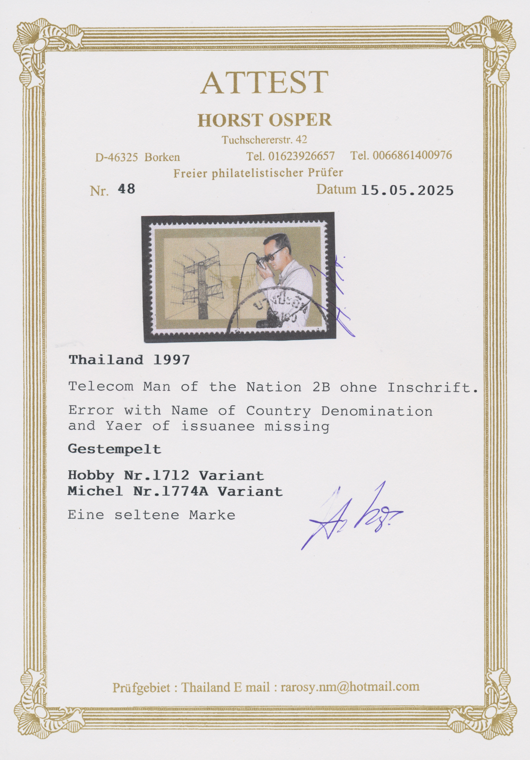 1997 'Telecom Man of the Nation' 2b. with variety "Name of country, denomination and year OMITTED", used with part of c.d.s., fine. A SCARCE VARIETY. H. Osper