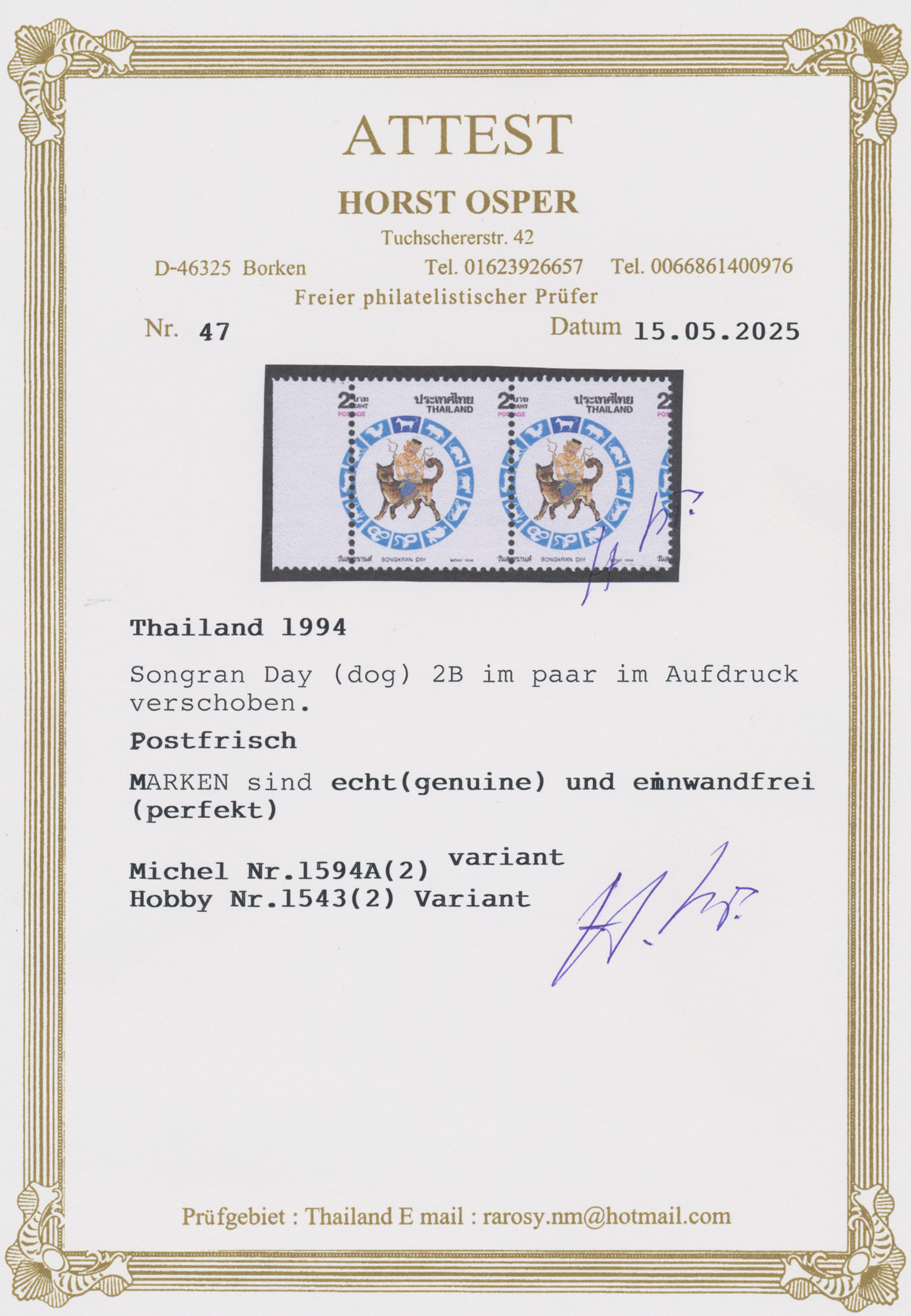 1994 'Songran Day' 2b. left hand marginal pair showing variety "perforation shifted to the right (about 3.5 mm), mint never hinged, fresh and fine. H. Osper cert.