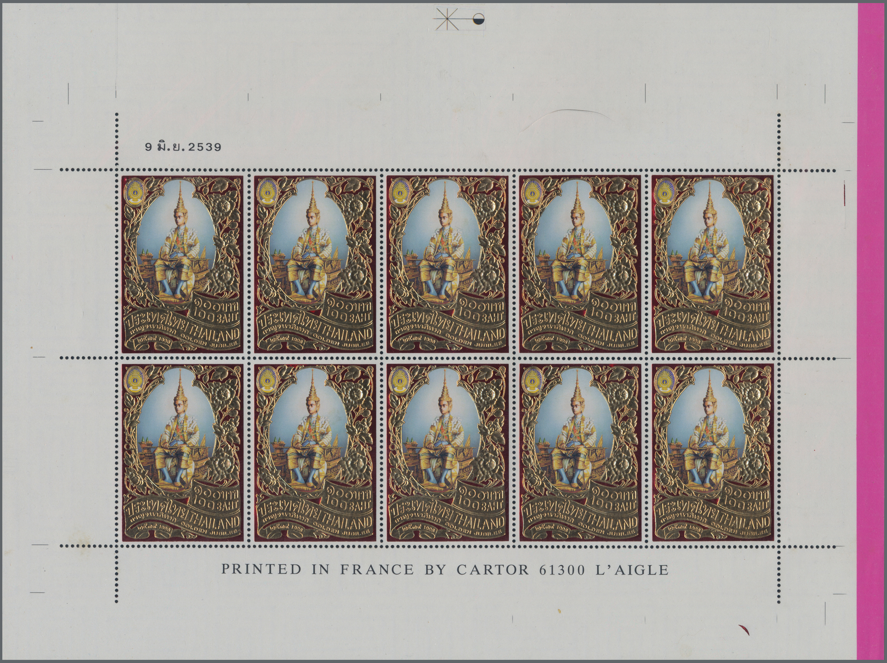 1996 King Bhumibol's 50th Accession 100b. two miniature sheets of 10 as final proofs in original colours, one with the other without serial number, cut marks and coloured