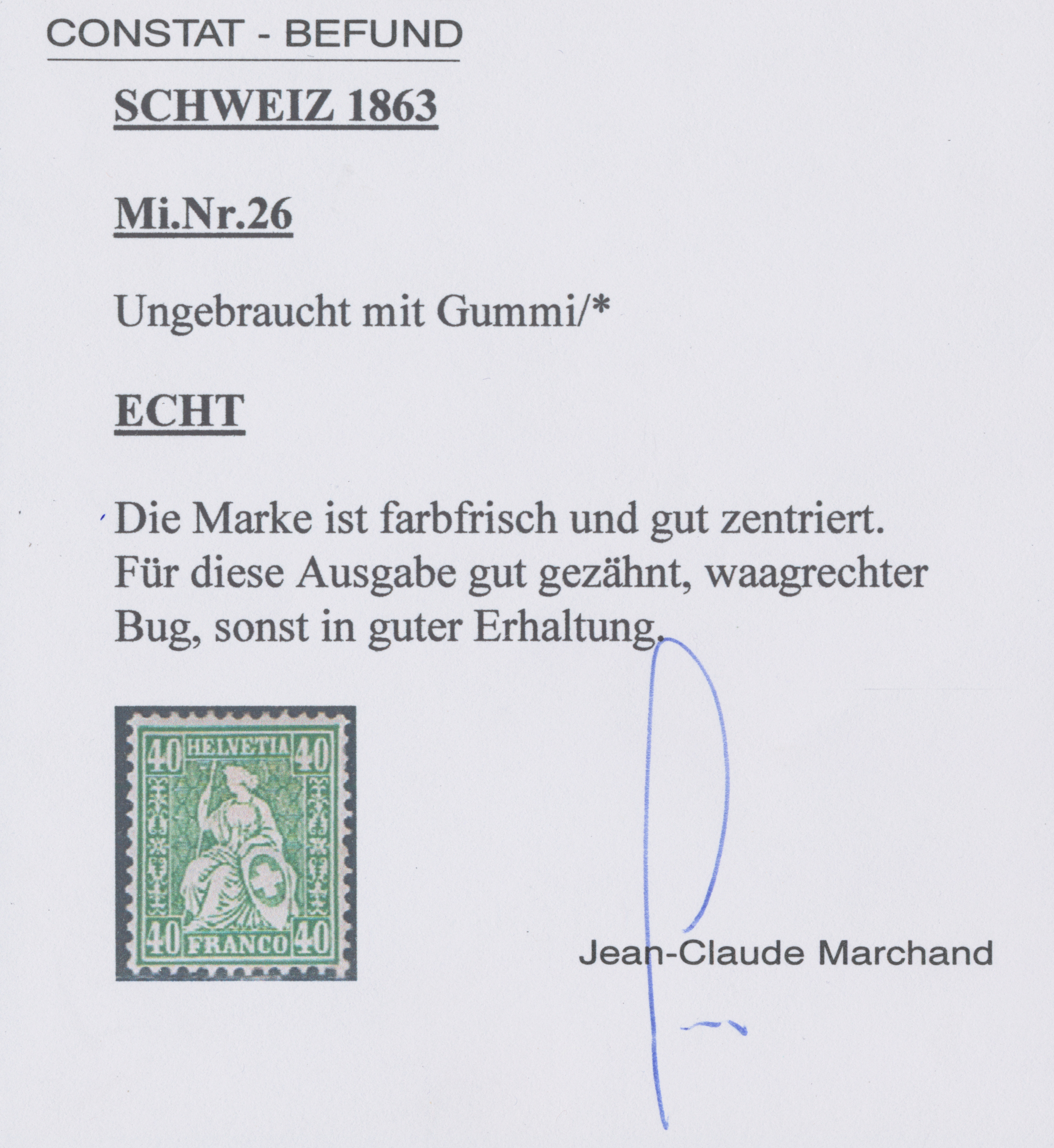 1862 Sitzende Helvetia 40 Rp. grün, ungebraucht mit großen Teilen des Originalgummis, farbfrisch und bis auf einen waag. Knitter/Bug in guter Erhaltung. Befund Marchand.