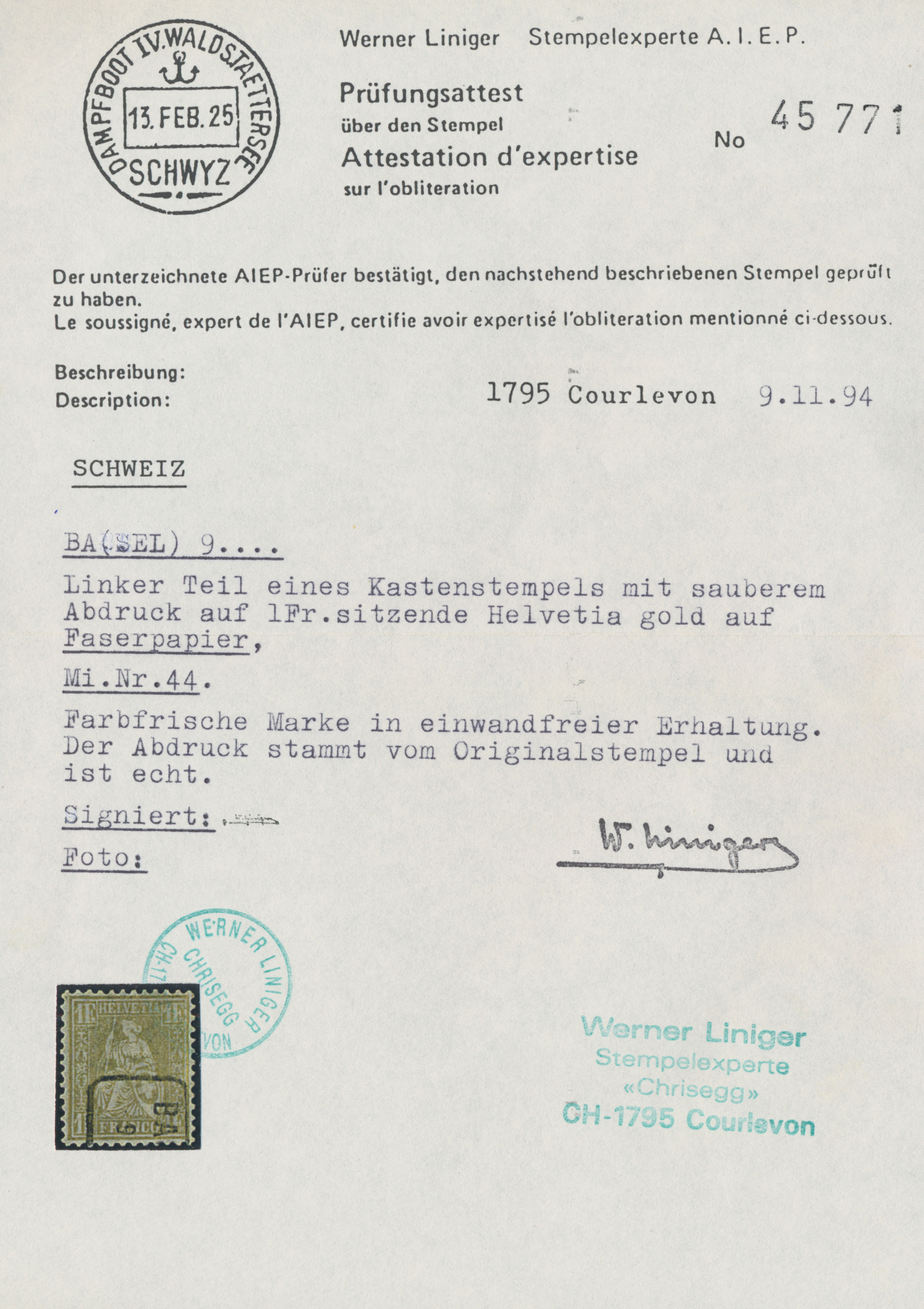1864, Sitzende Helvetia 1 Fr. golden, fünf gestempelte Einzelmarken jeweils mit sauberen Entwertungen in guter Erhaltung, signiert. (Mi. 500,- €)